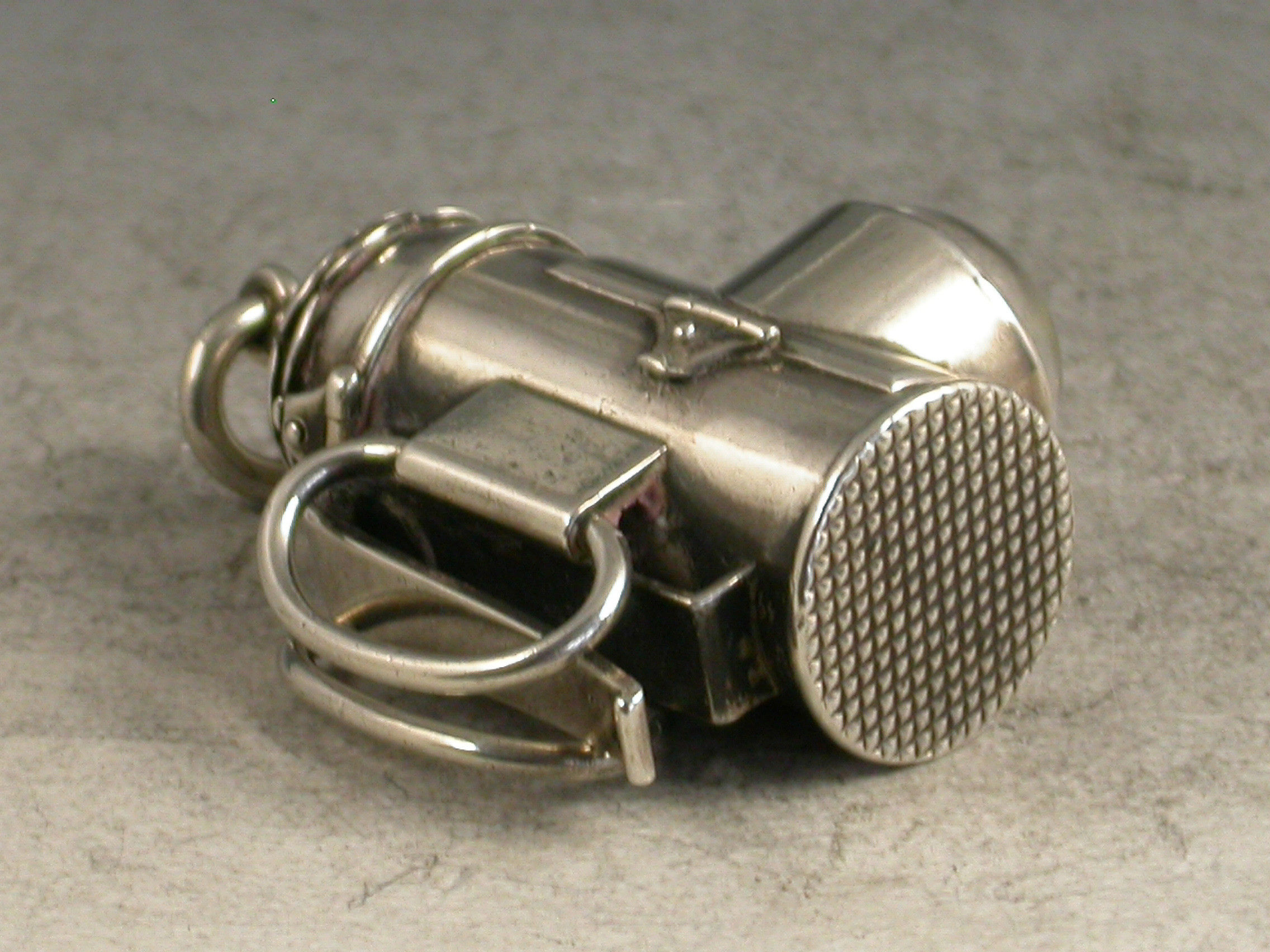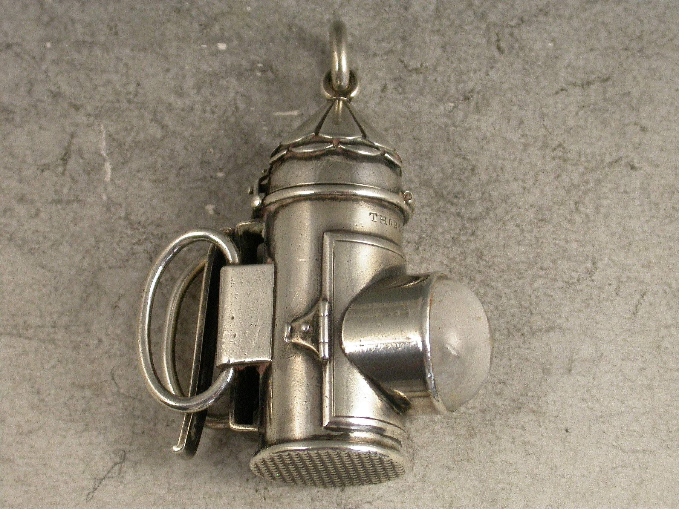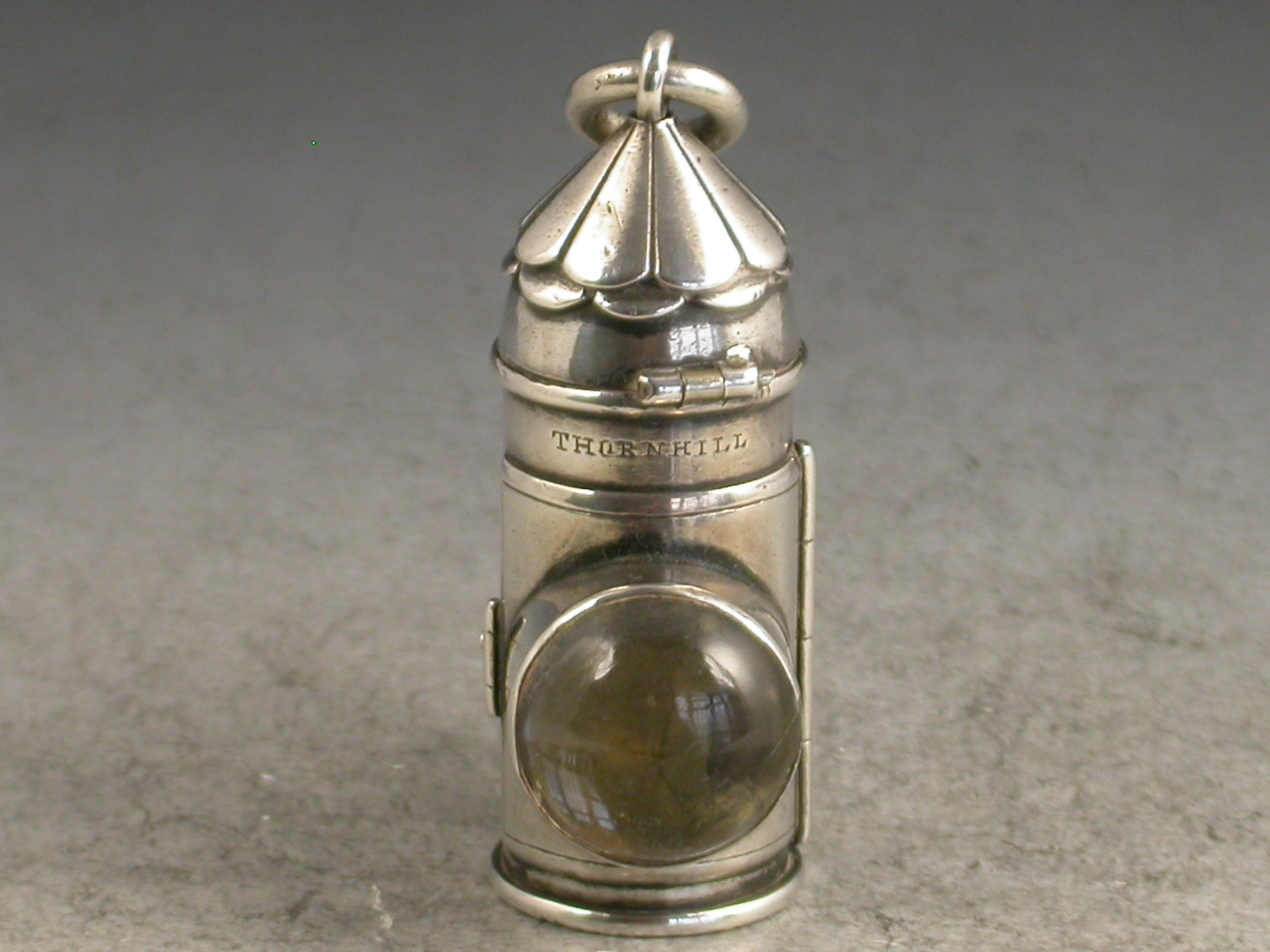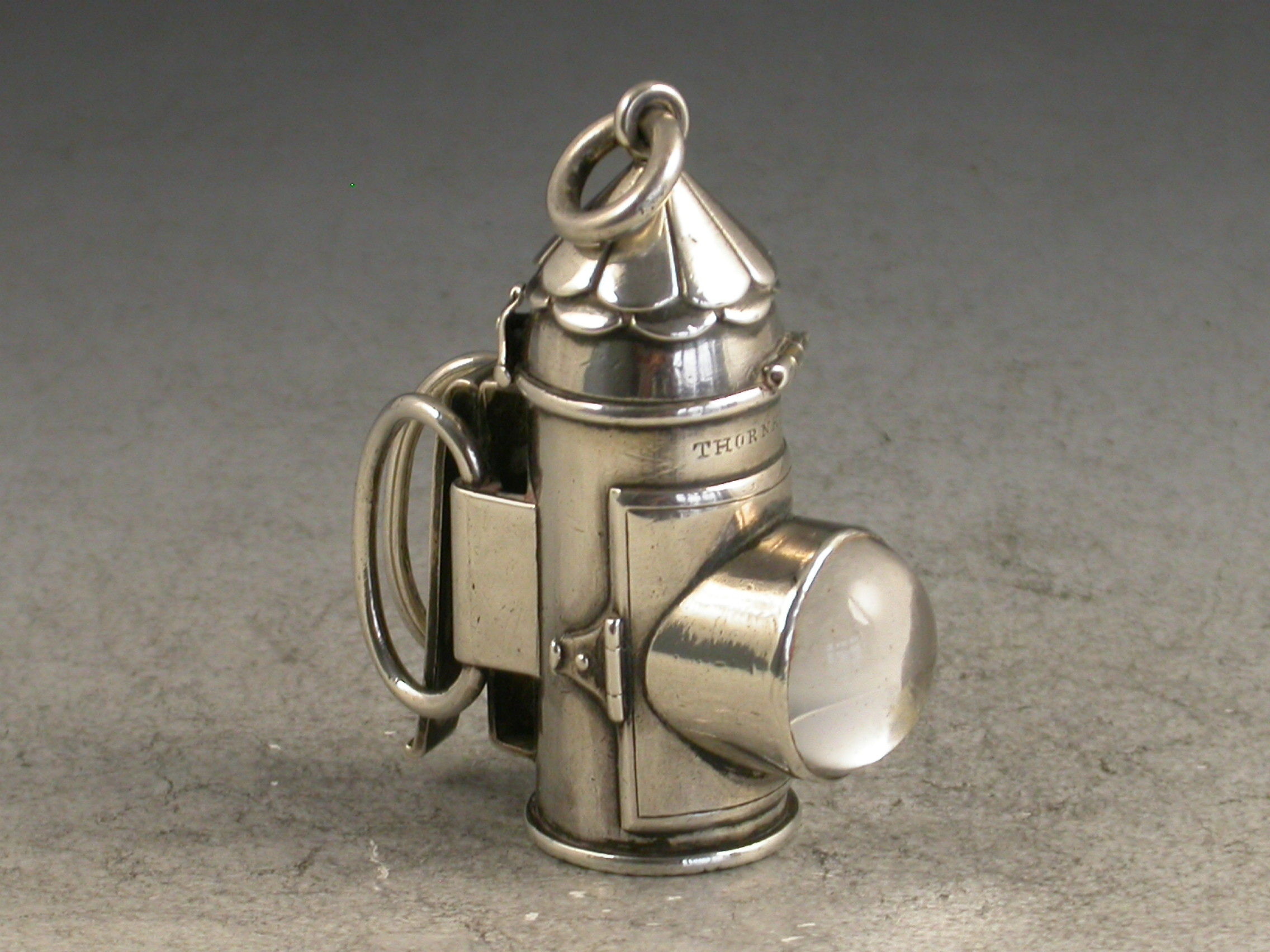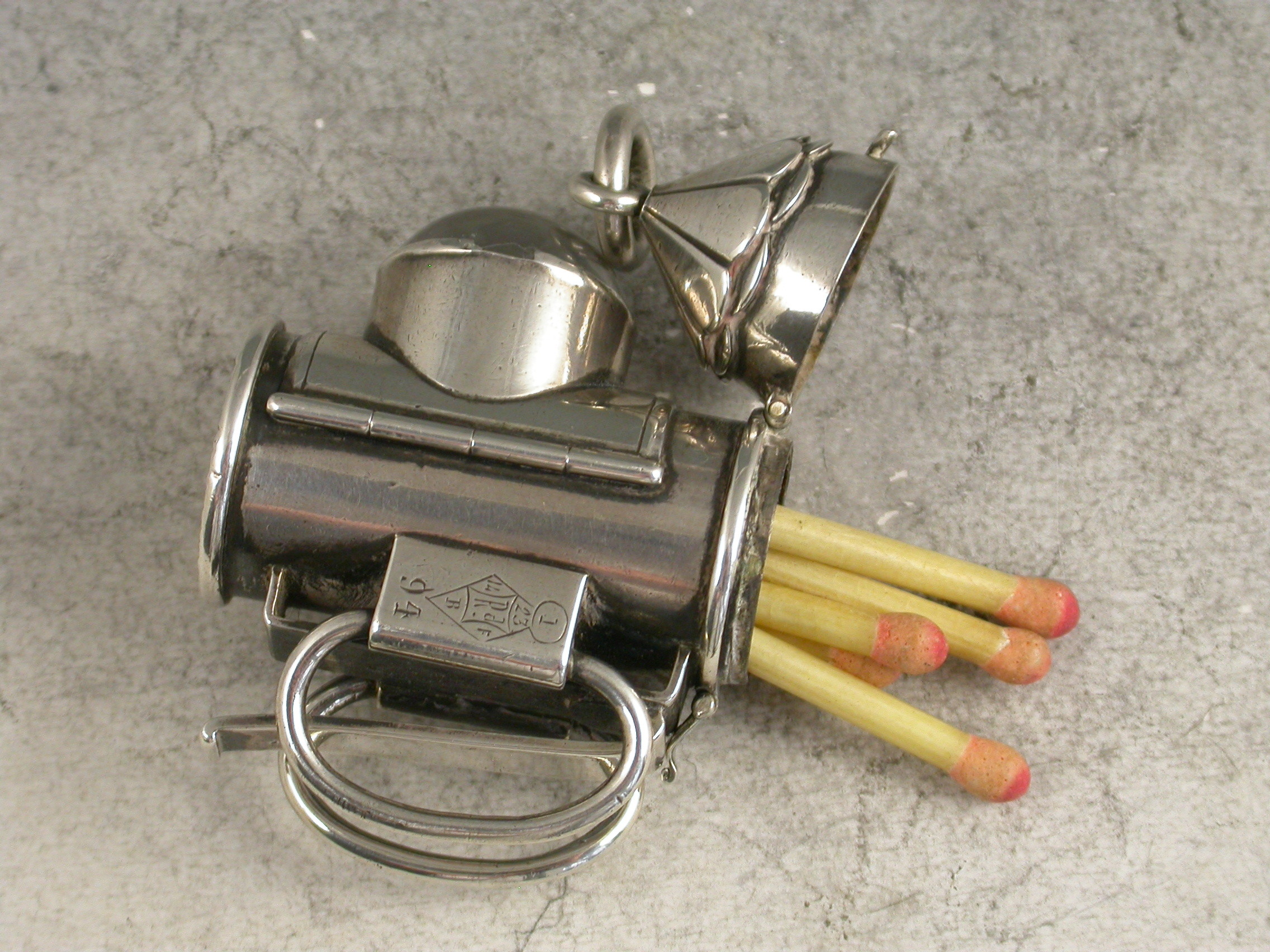 A rare Victorian novelty silver Vesta Case made in the form of a Policeman's Bulls Eye Lantern, with clip and handles to the reverse, a striker to the base and the hinged cover opening to reveal the Vesta compartment.