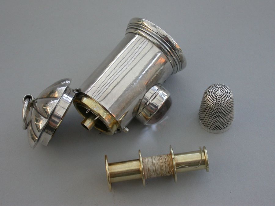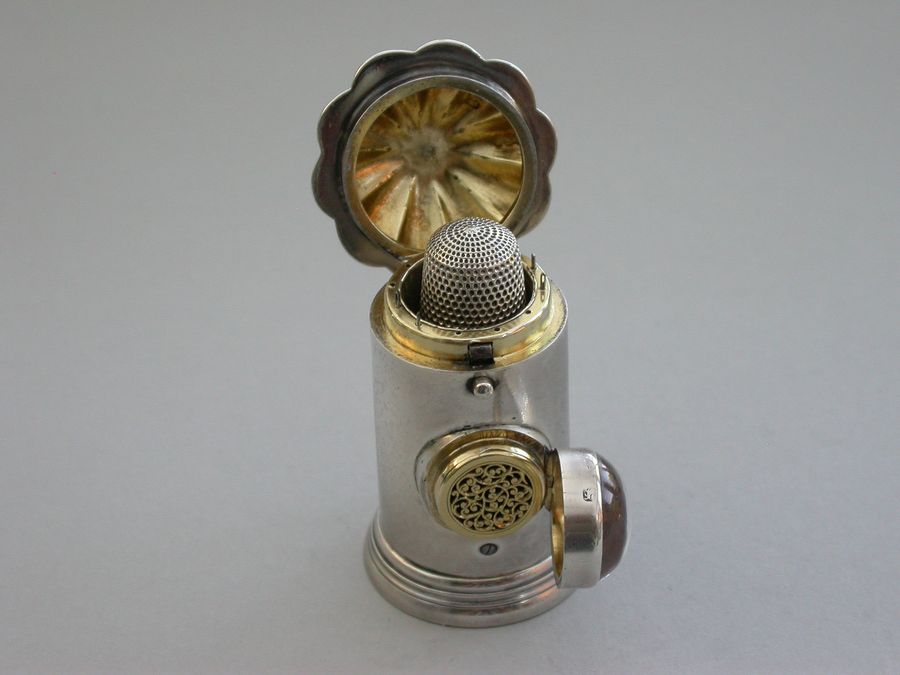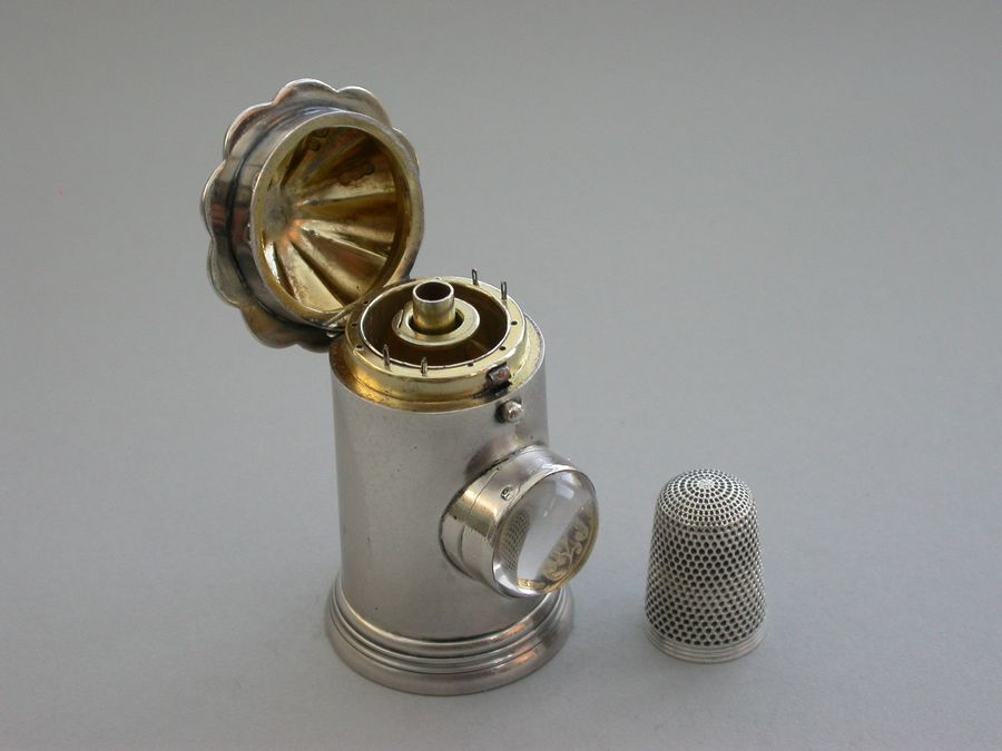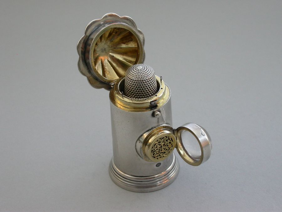 A rare Victorian novelty silver combination Vinaigrette & Sewing Etui formed as a Policeman's Bullseye Lantern, with fluted domed top and suspension ring hinging open with push-button to reveal an etui including thimble, bobbin and needles. The front with small round hinged cover set with magnifying crystal and covering the the gilded vinaigrette grille.