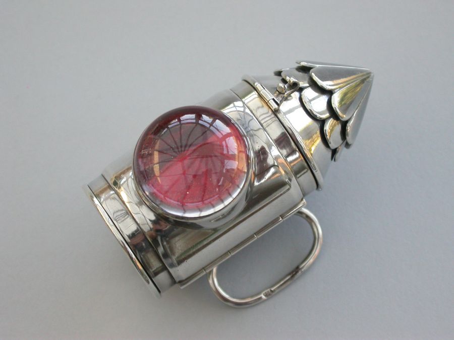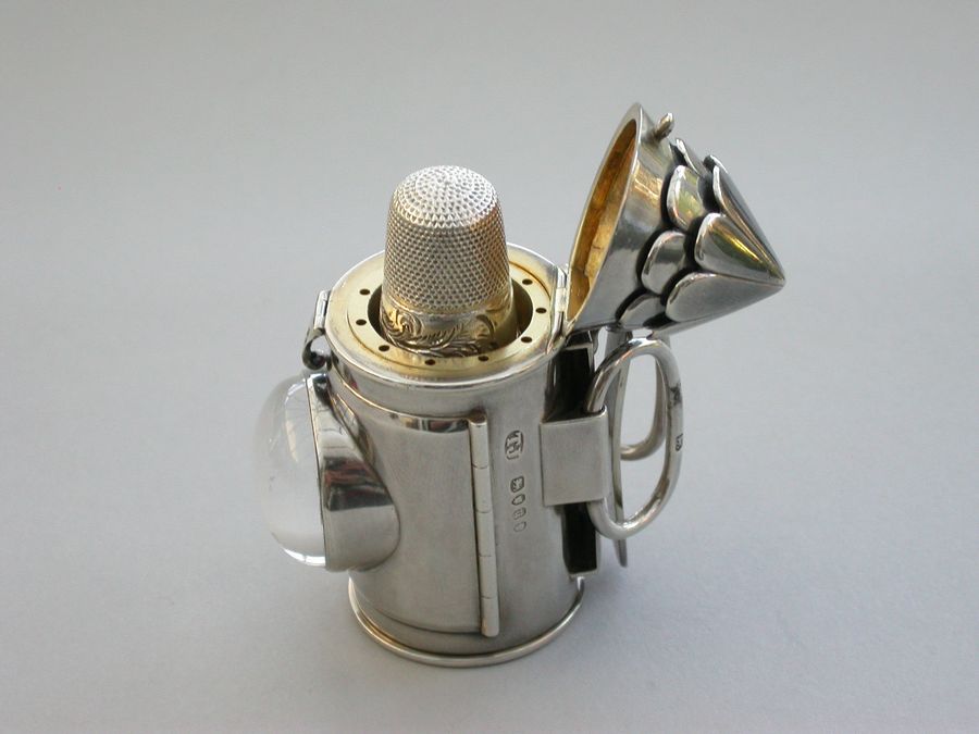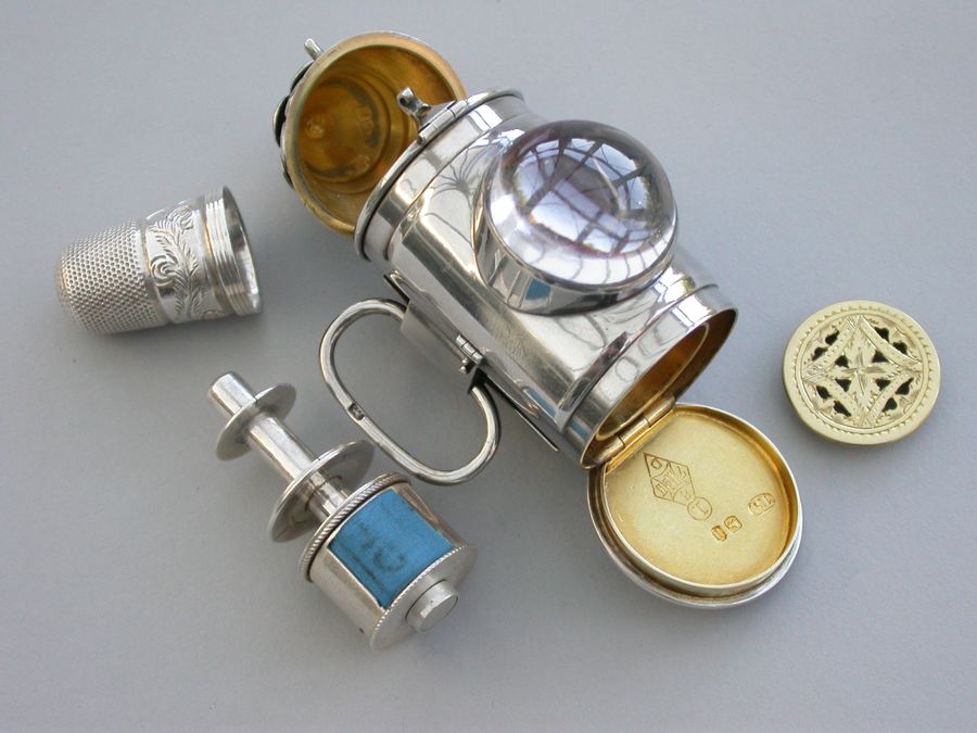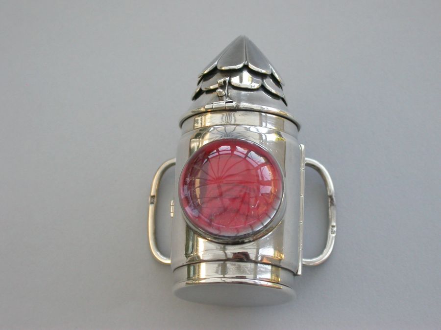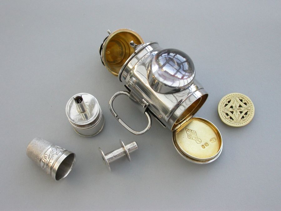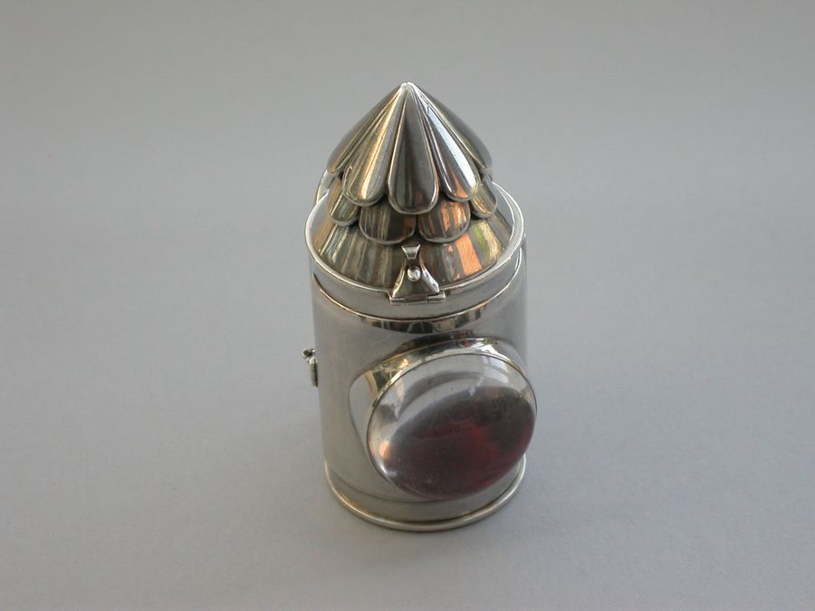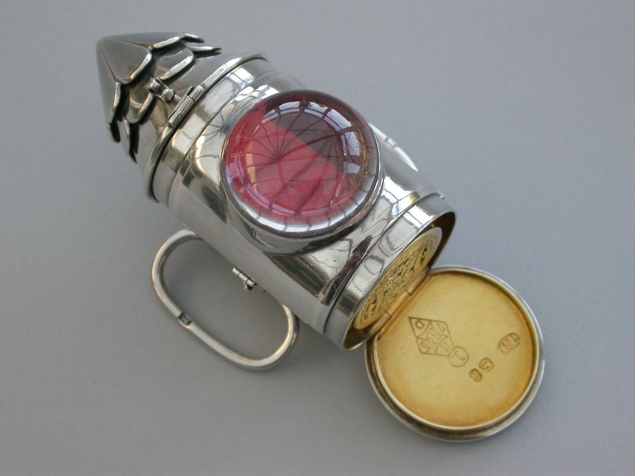 A rare Victorian novelty silver combination Vinaigrette & Sewing Etui formed as a Policeman's Bullseye Lantern, with mock opening door, two tier fluted domed top opening by a catch to reveal the etui including thimble, bobbin and tape measure. A large domed crystal lens to the front with red foiled background. The plain hinged base containing the vinaigrette with pierced silver gilt lift-out grille. Belt fittings to the rear.