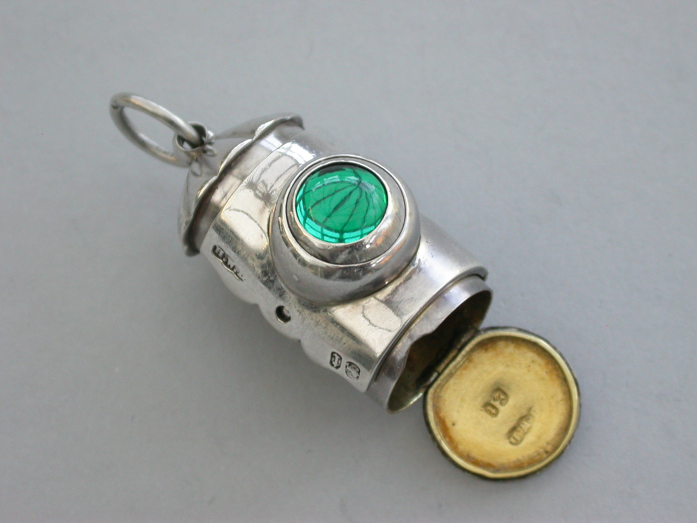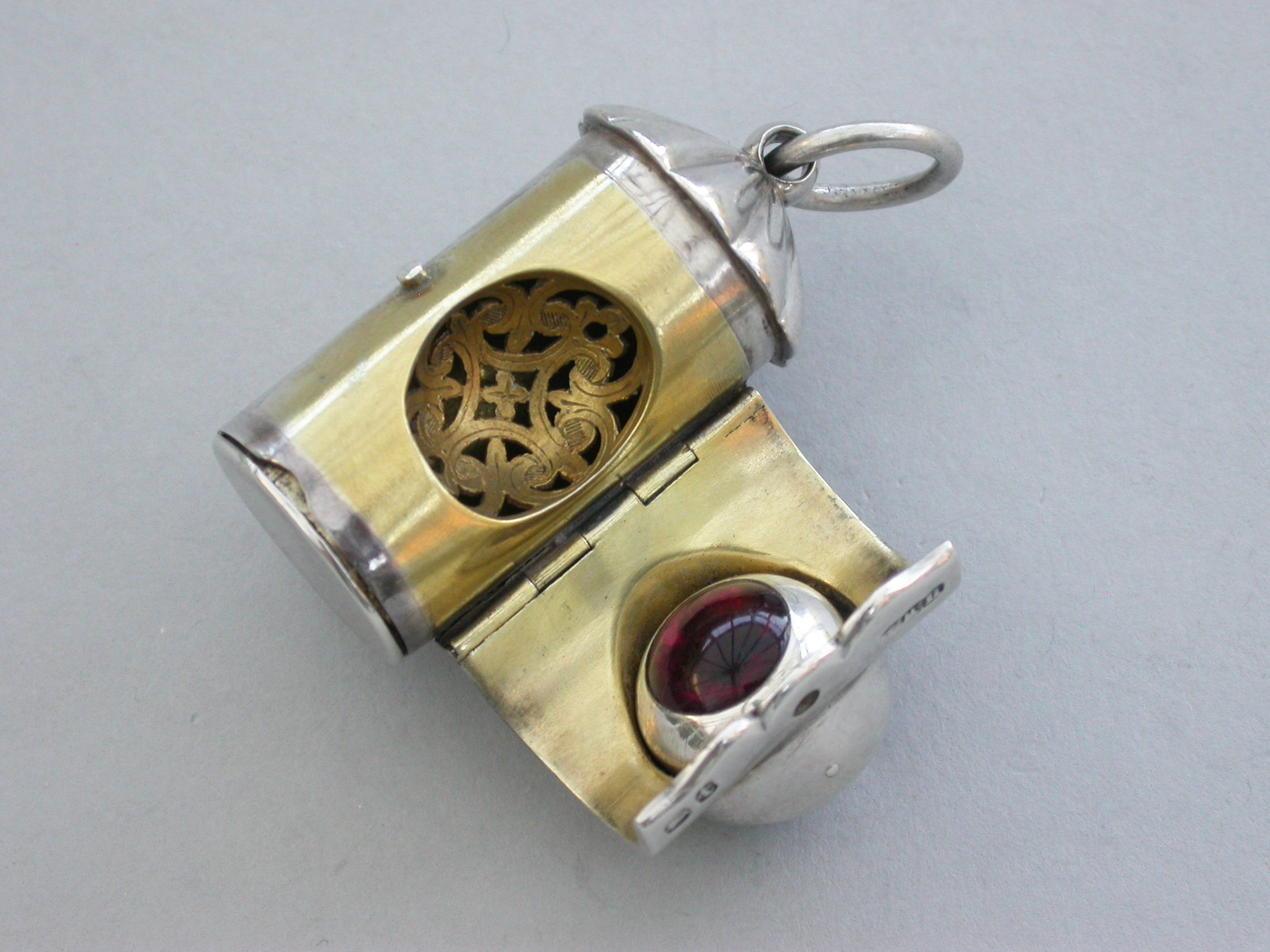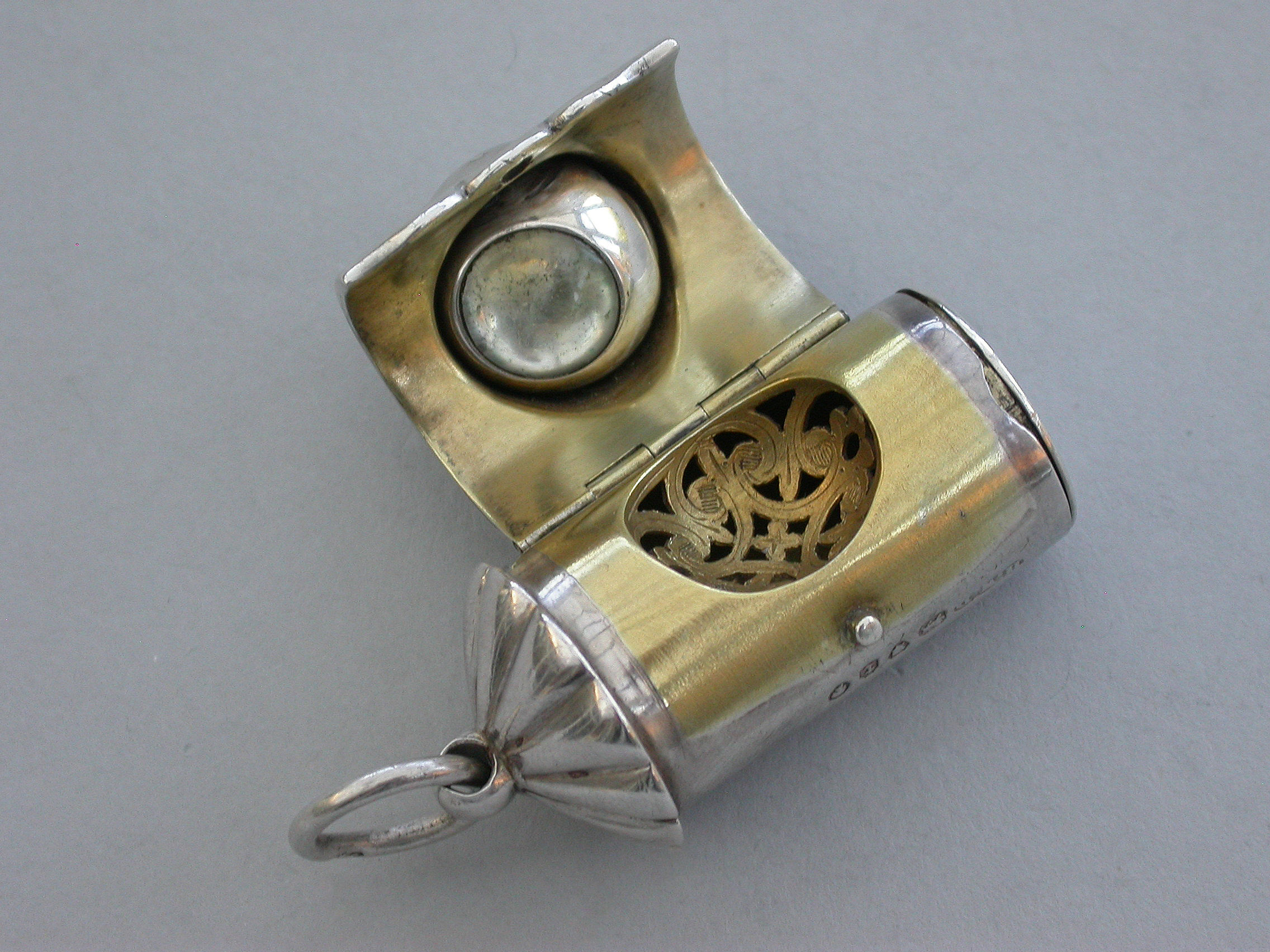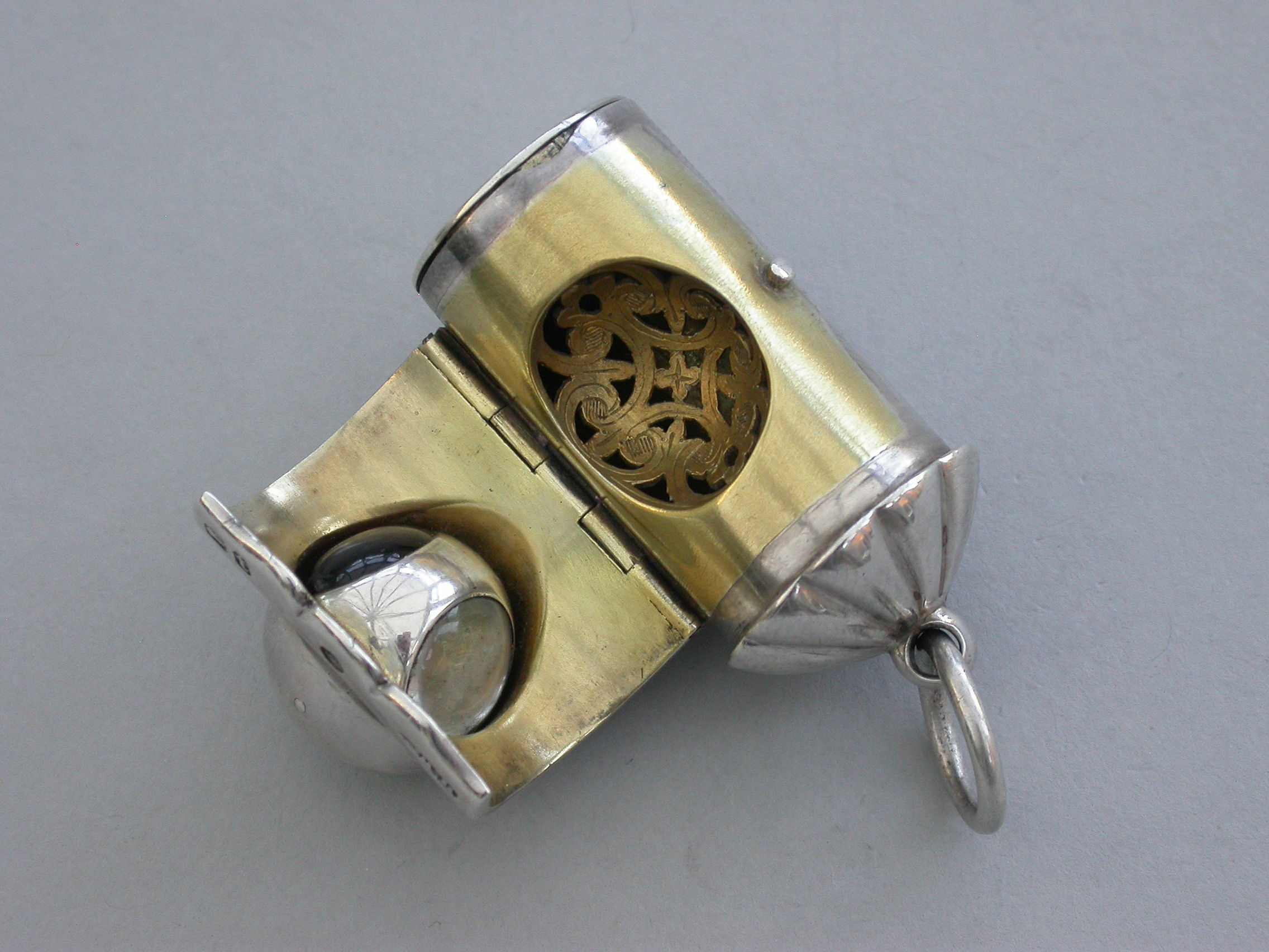 A rare small Victorian novelty silver Vinaigrette formed as a Policeman's Bullseye Lantern, with fluted domed top and suspension ring, the front hinged cover mounted with a revolving ball set with white, red and green glass and opening to reveal an incurving leaf pierced grille, hinged base and silver gilt interior.