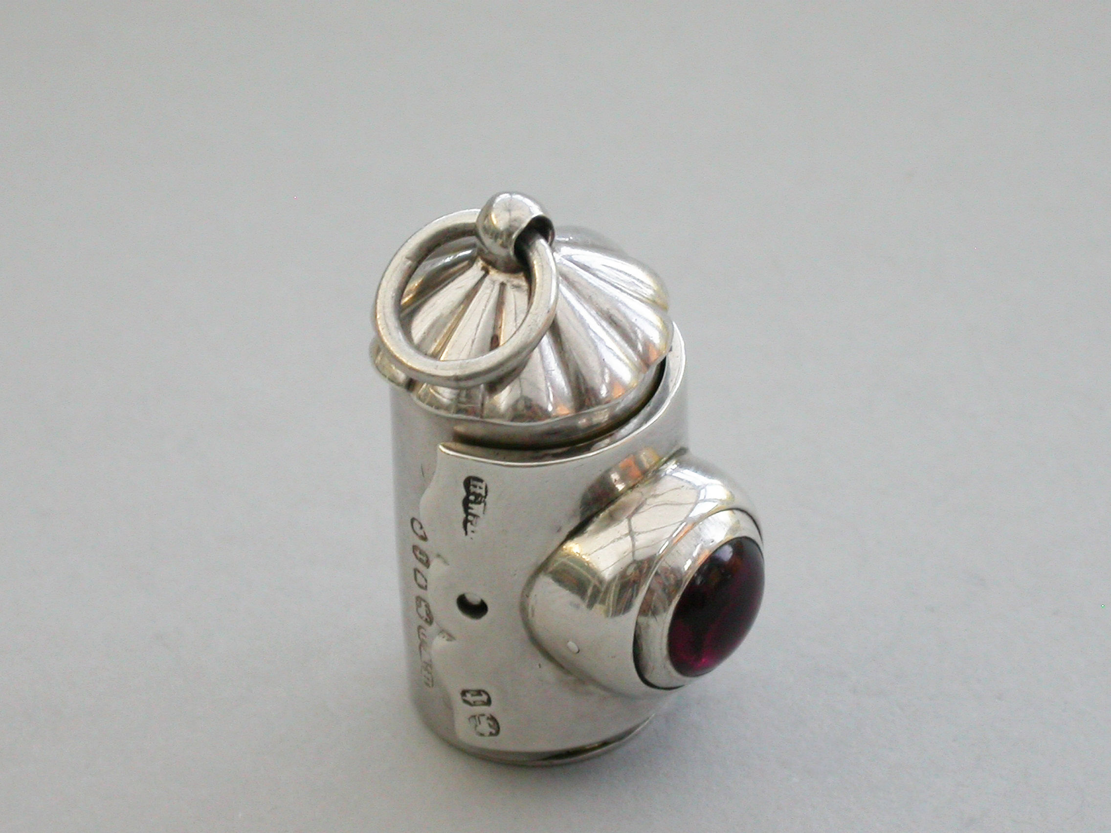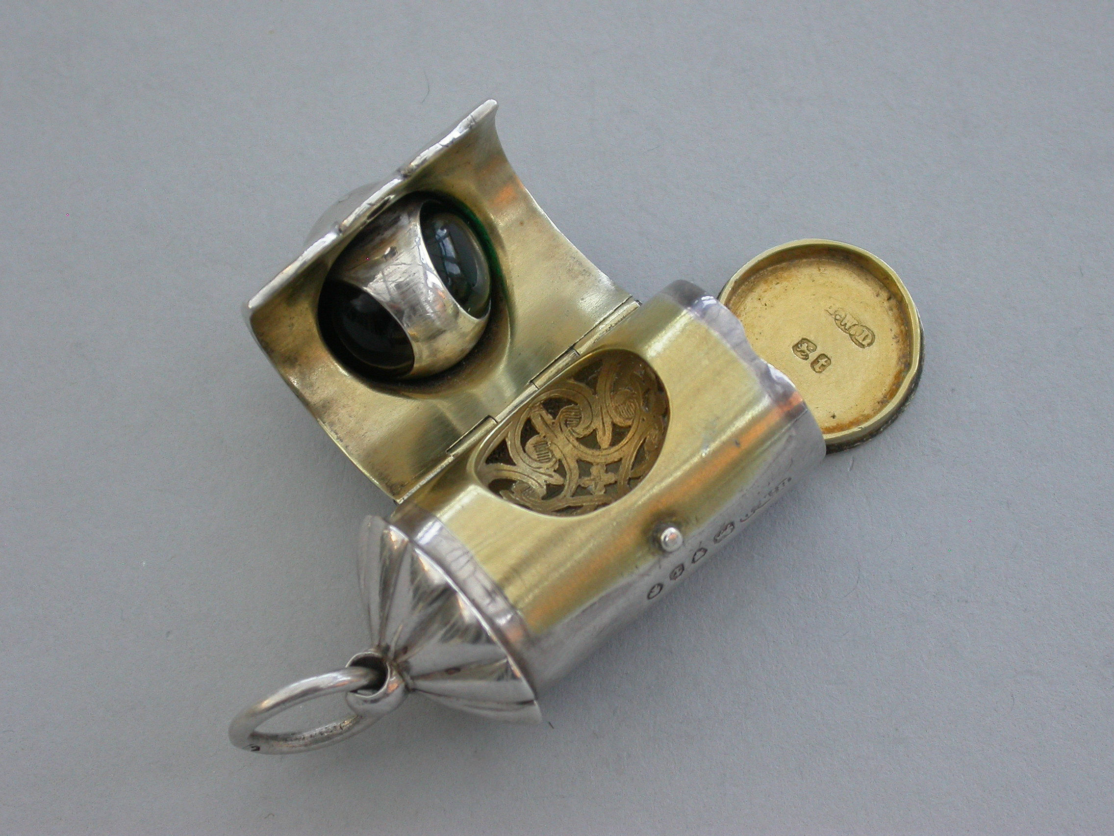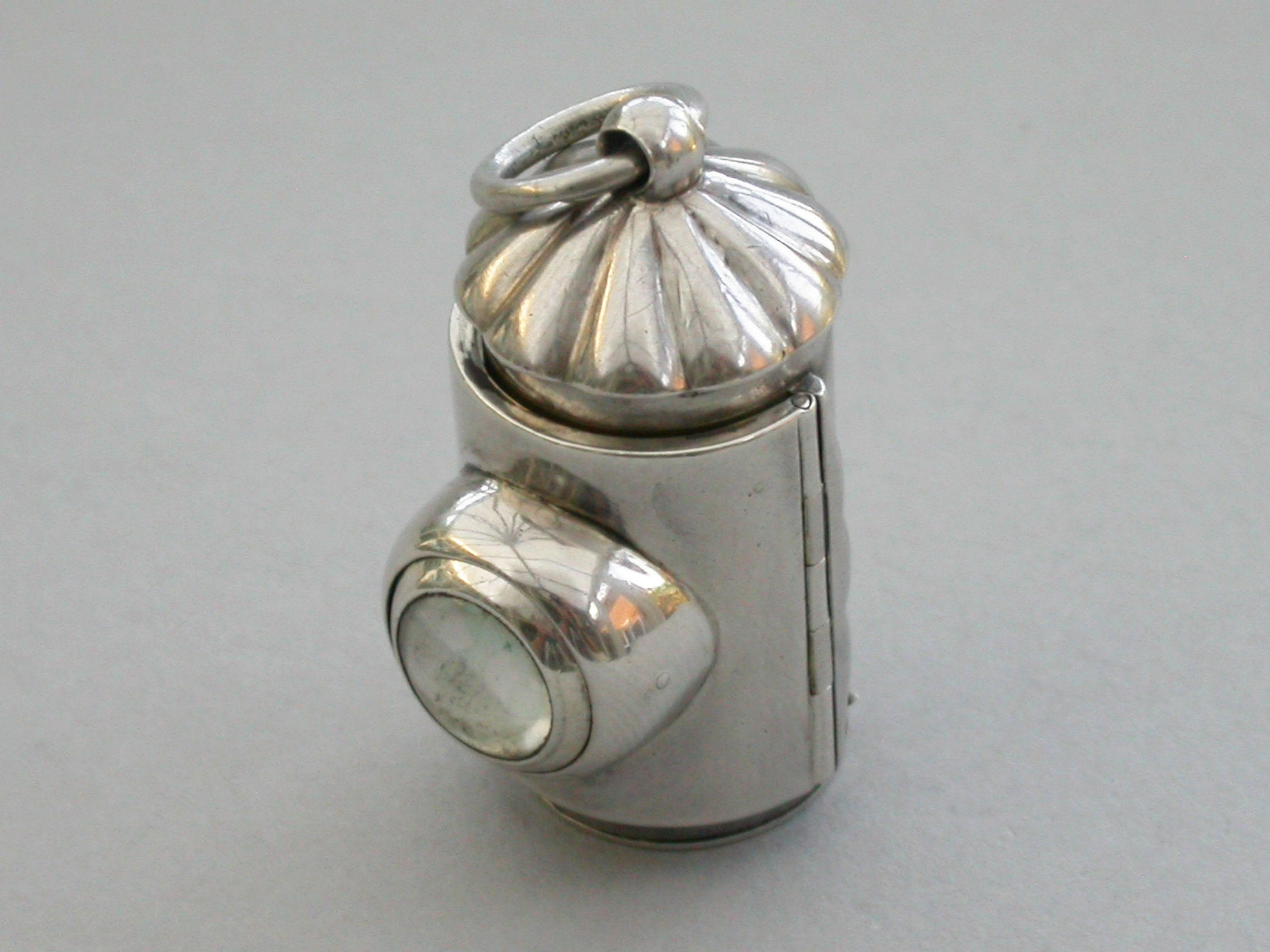A rare small Victorian novelty silver Vinaigrette formed as a Policeman's Bullseye Lantern, with fluted domed top and suspension ring, the front hinged cover mounted with a revolving ball set with white, red and green glass and opening to reveal an incurving leaf pierced grille, hinged base and silver gilt interior.