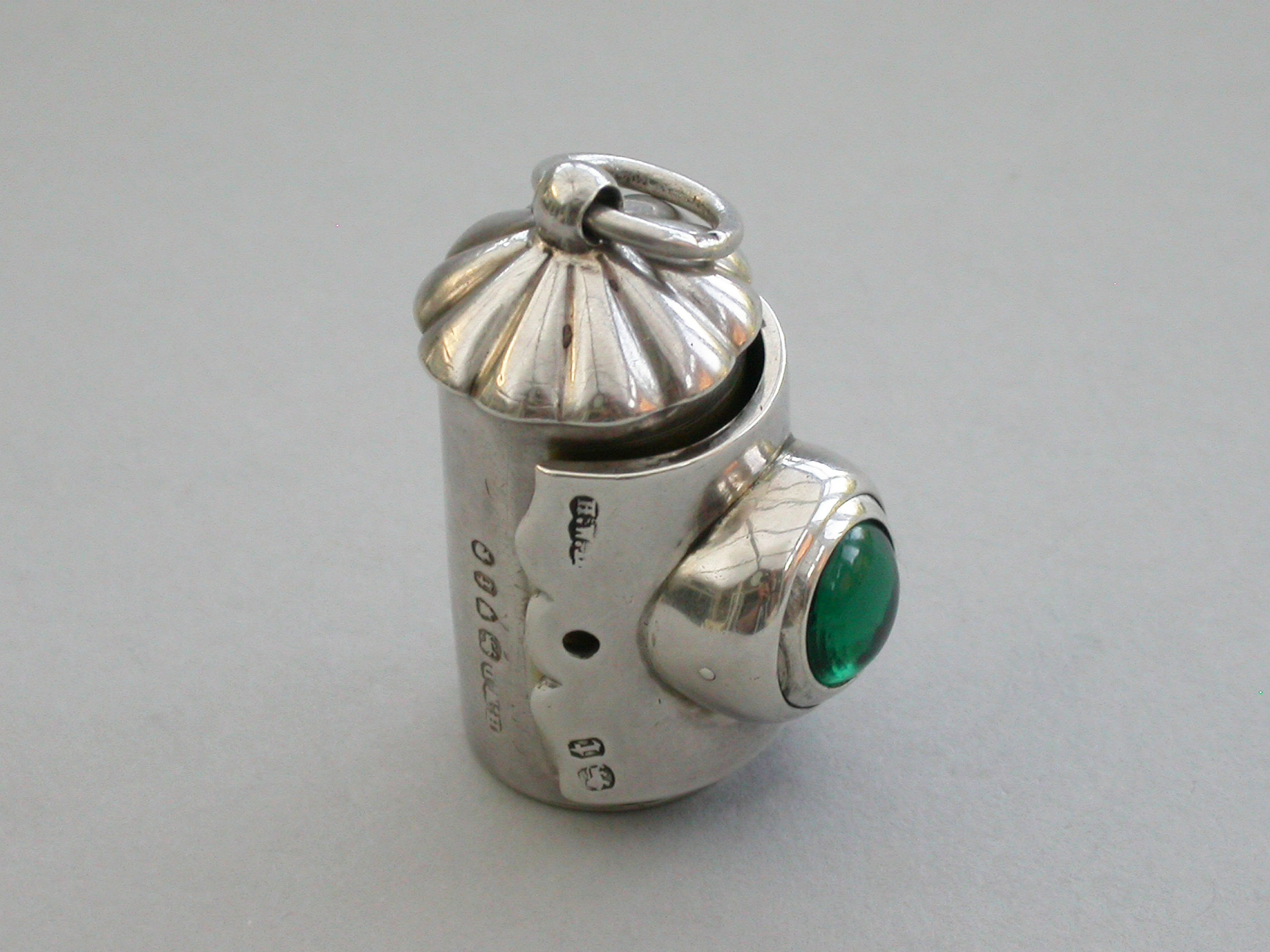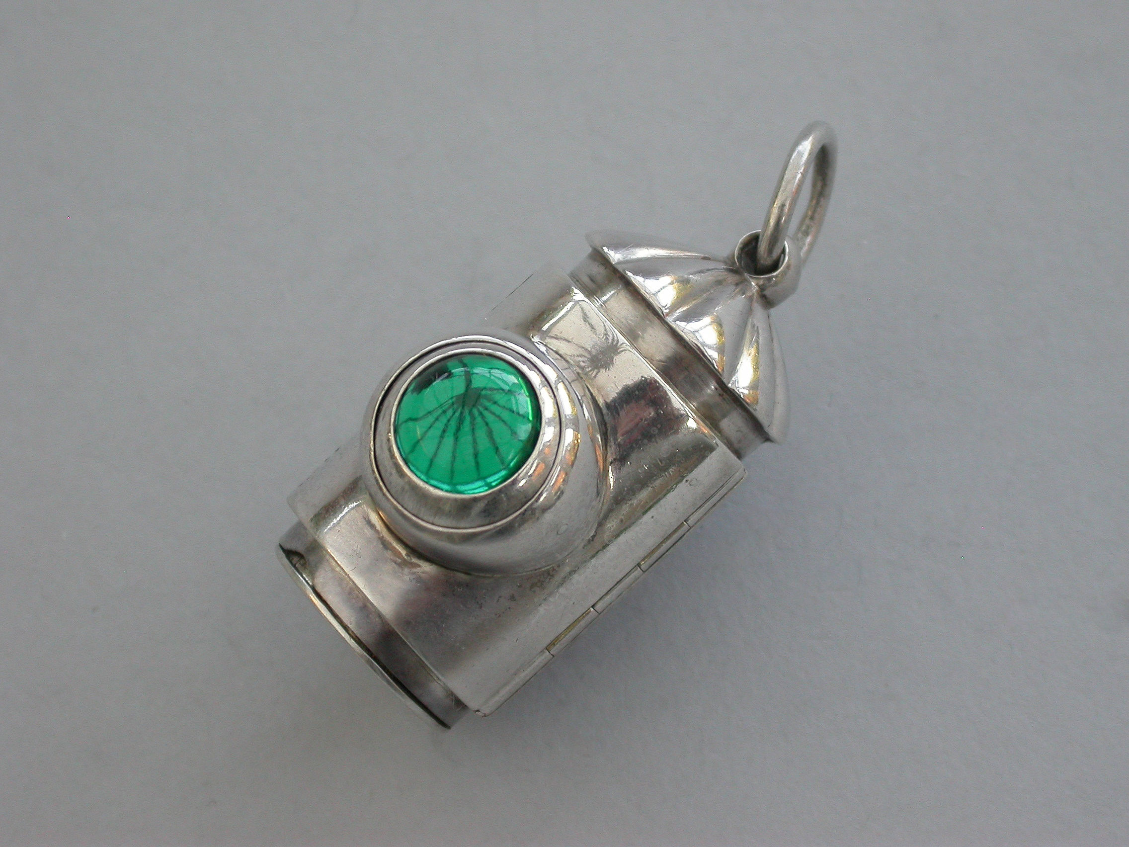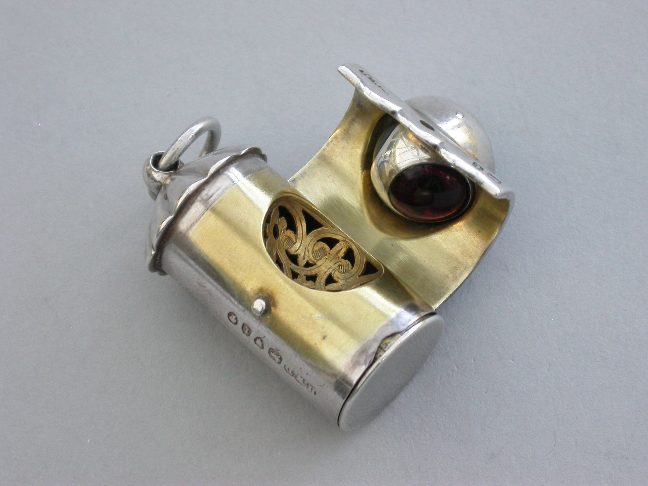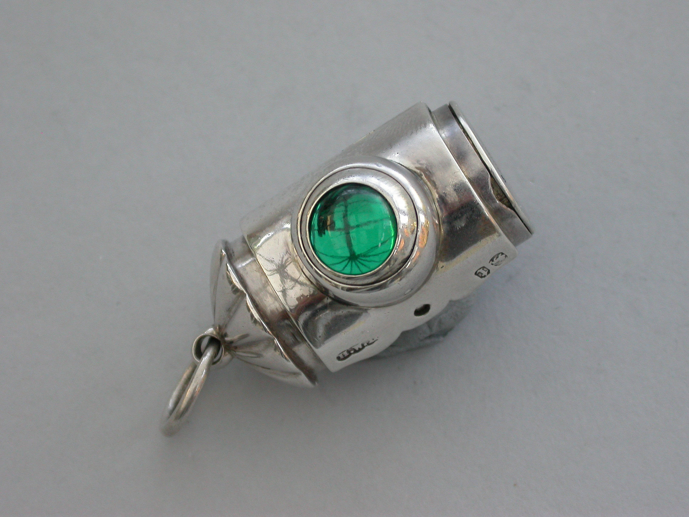 A rare small Victorian novelty silver Vinaigrette formed as a Policeman's Bullseye Lantern, with fluted domed top and suspension ring, the front hinged cover mounted with a revolving ball set with white, red and green glass and opening to reveal an incurving leaf pierced grille, hinged base and silver gilt interior.