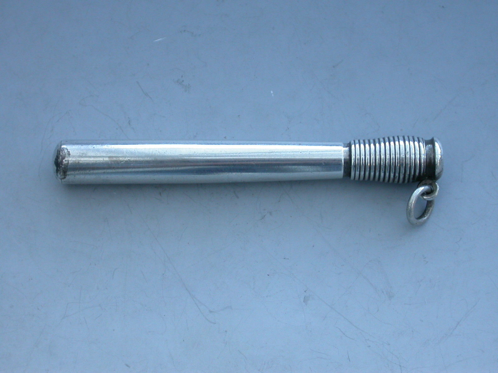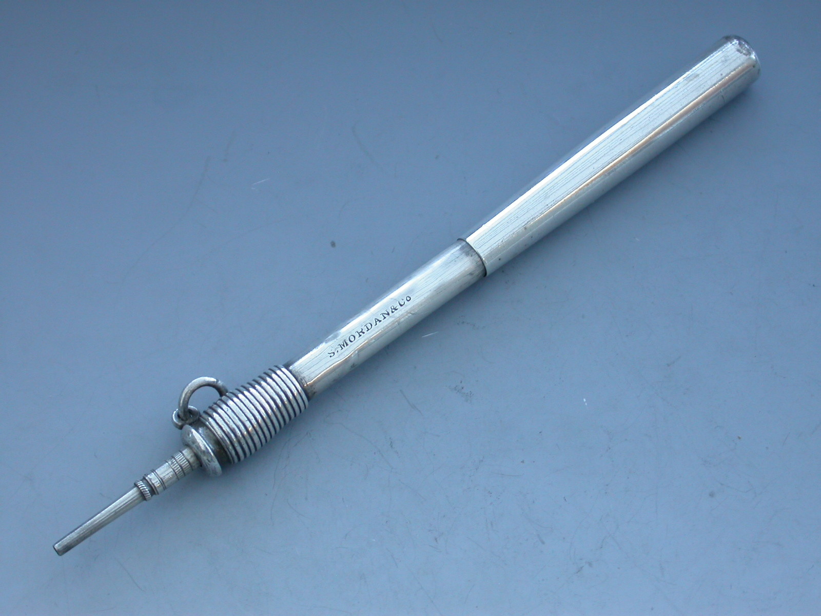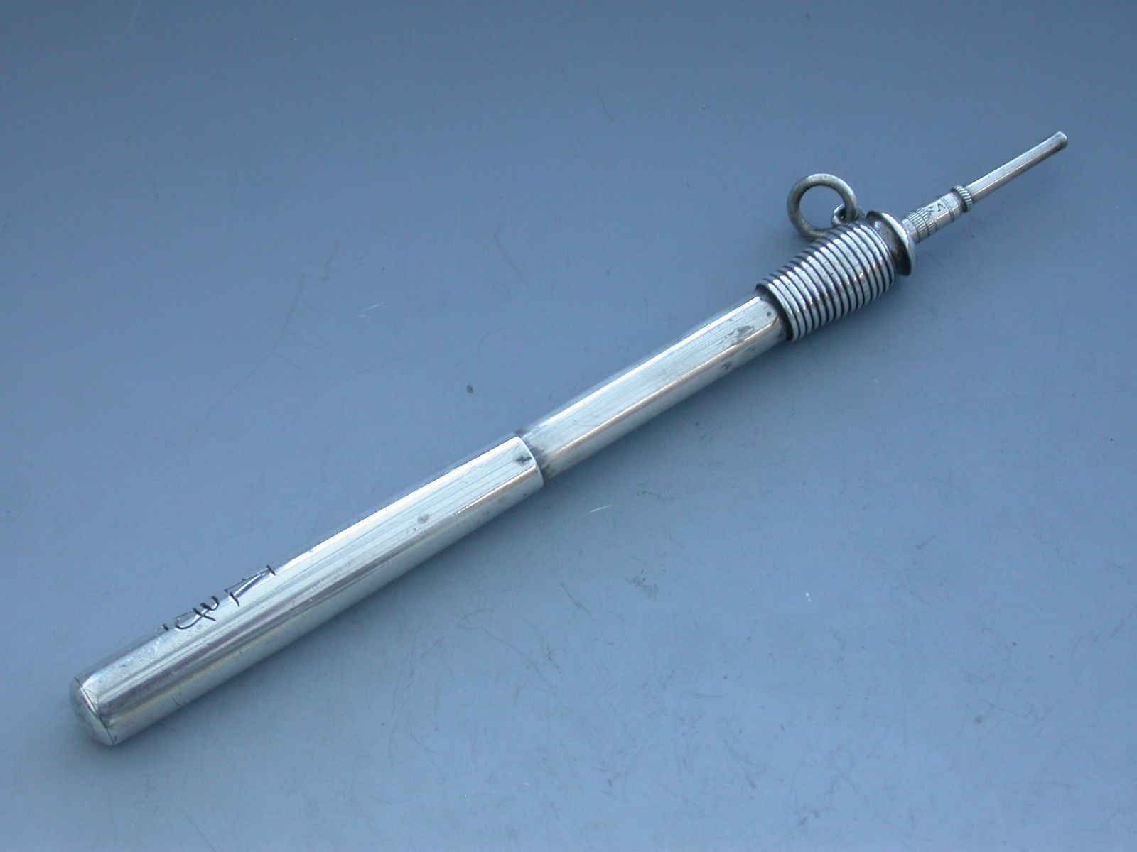 A rare and fine quality novelty silver telescopic propelling pencil made in the form of a Policeman's Truncheon, the barrel engraved with the cypher of Queen Victoria.