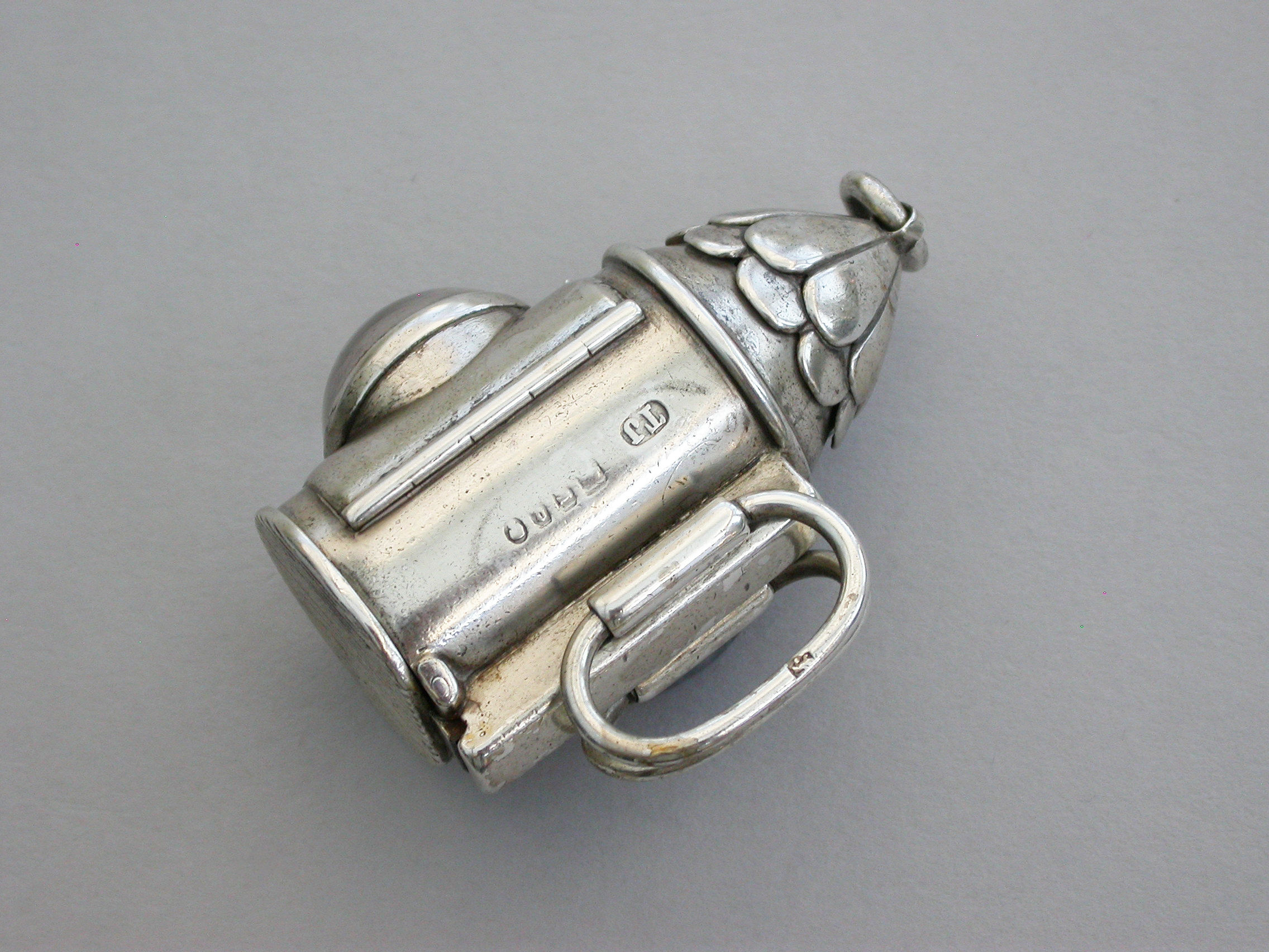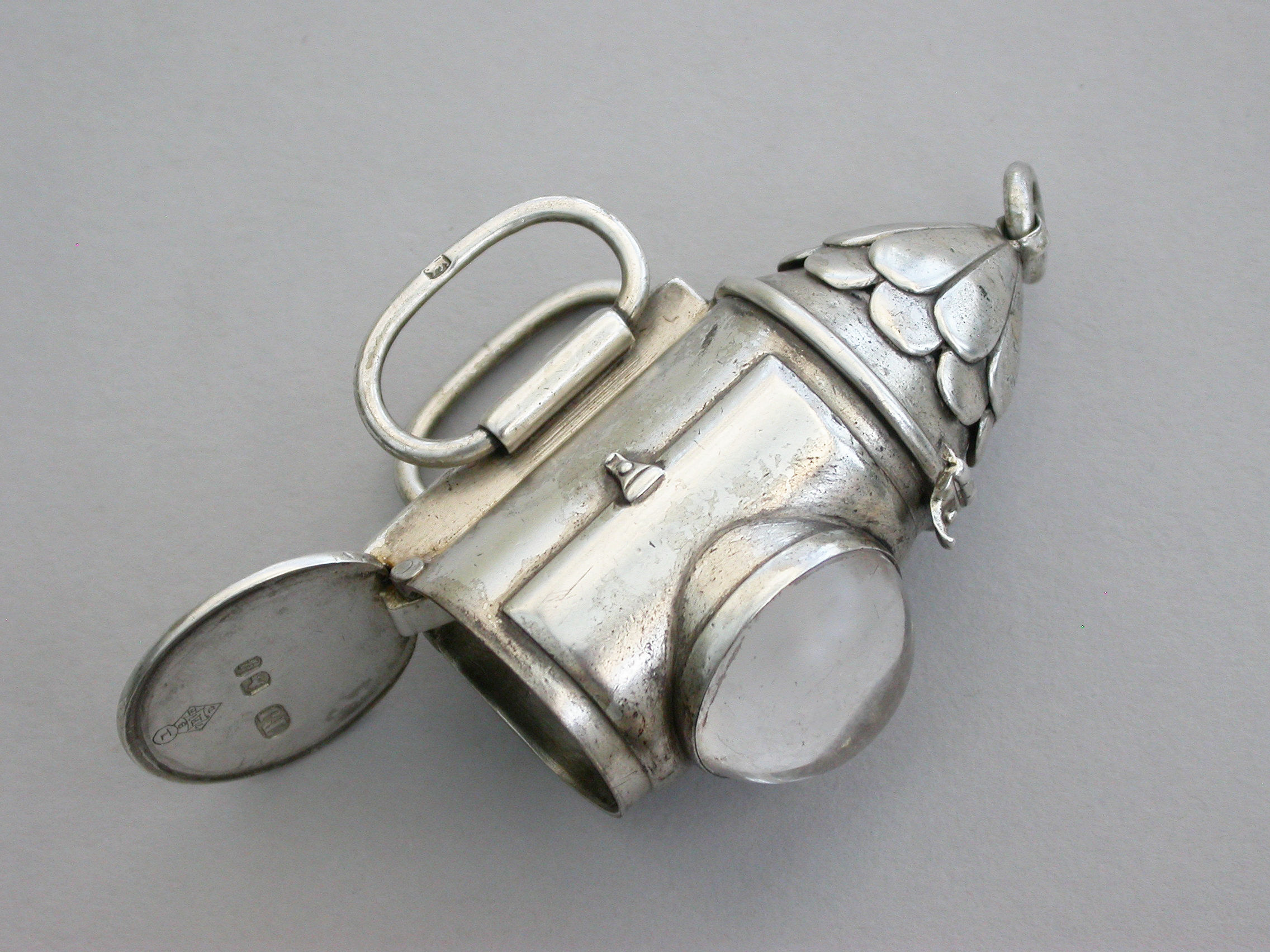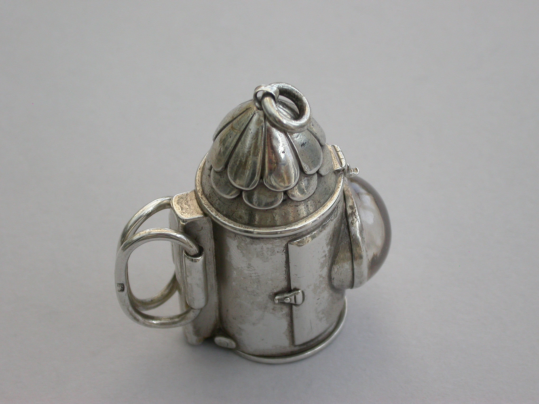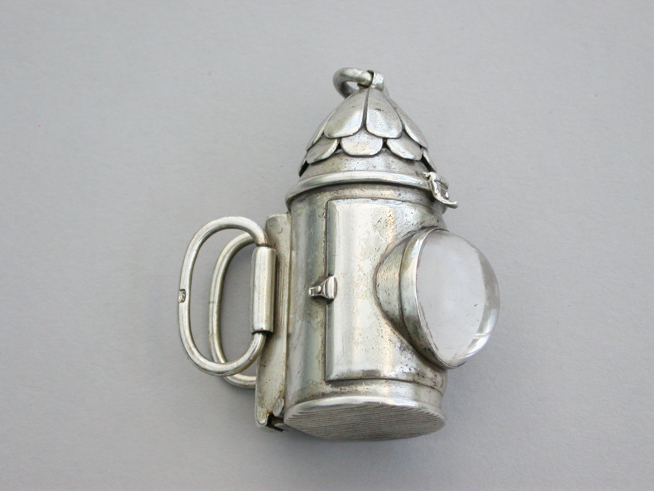 A rare Victorian novelty silver Vesta Case made in the form of a policeman’s bullseye lantern, with hinged fold-out handles to the reverse, a sprung ribbed hinged cover to the base forming the striker. Domed glass lens to the front, attached suspension ring.