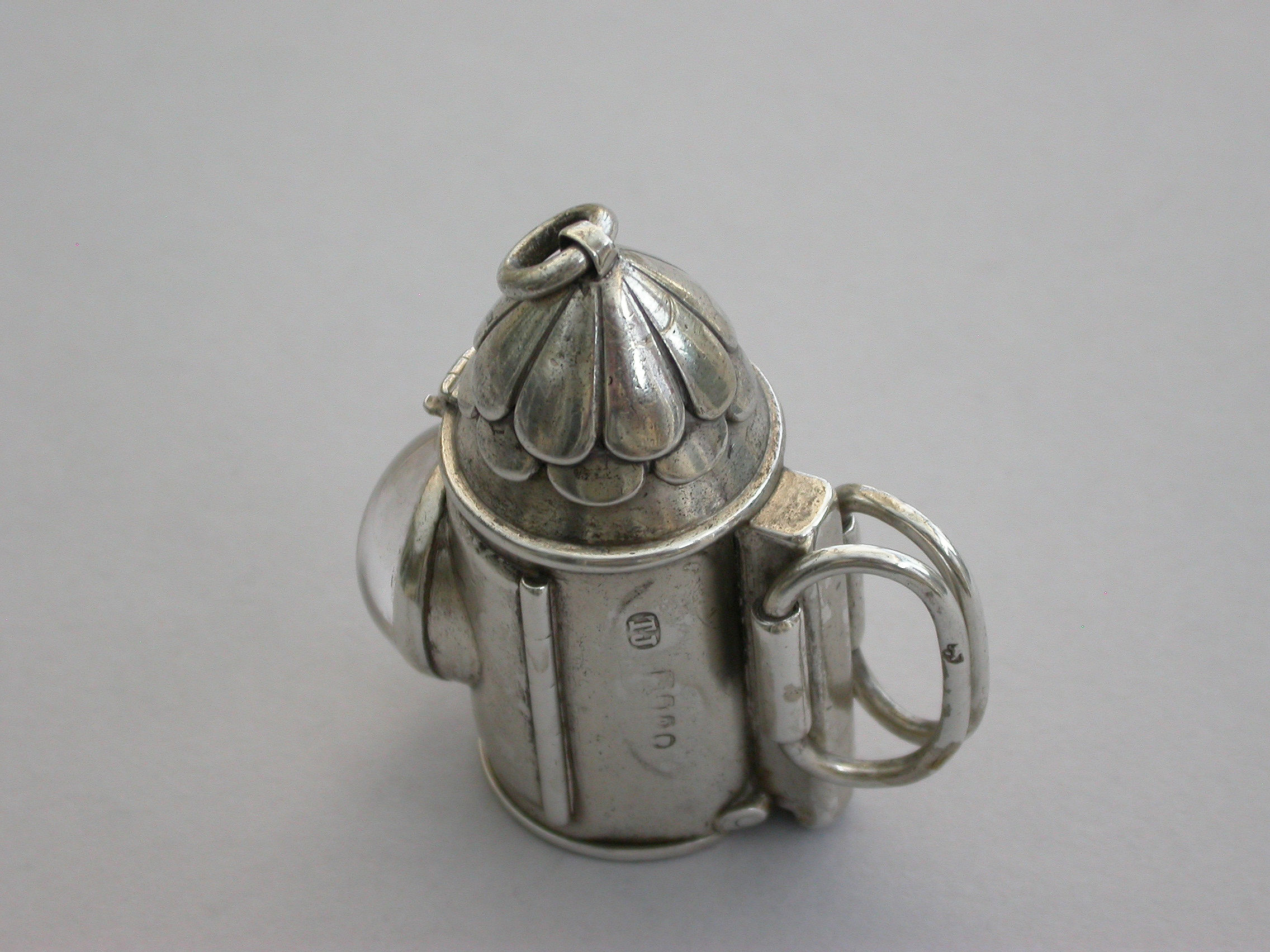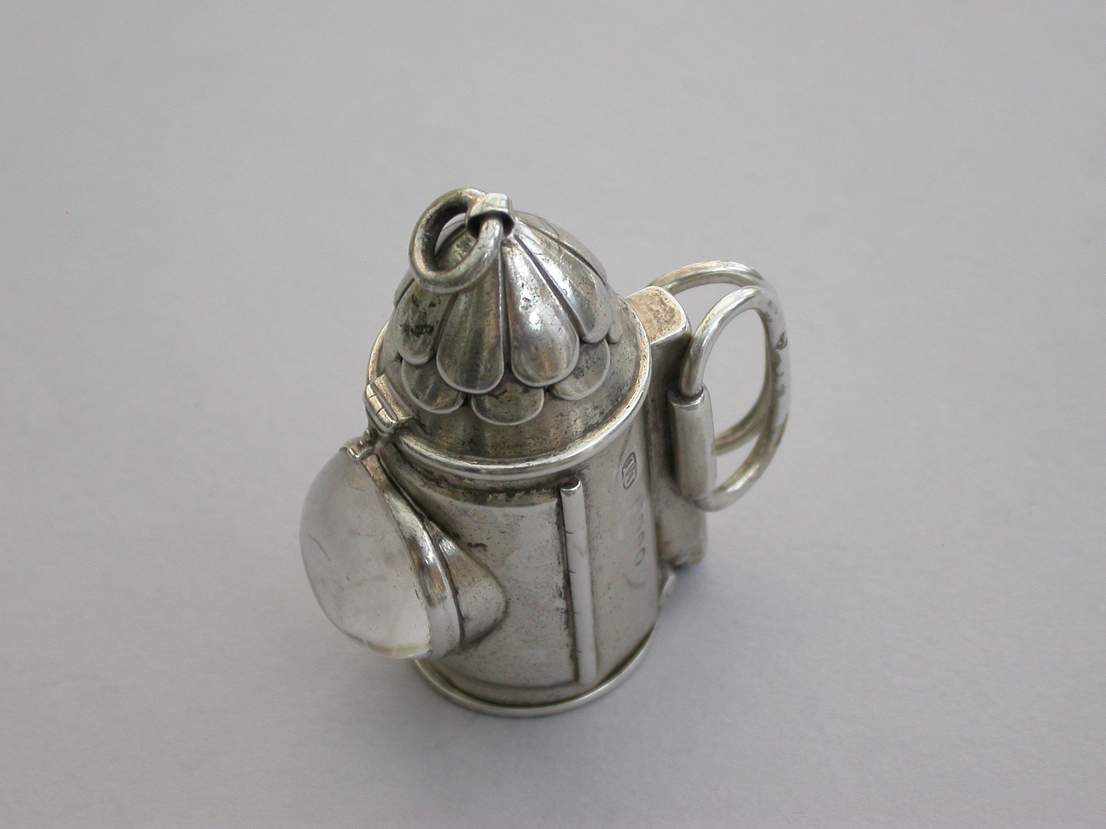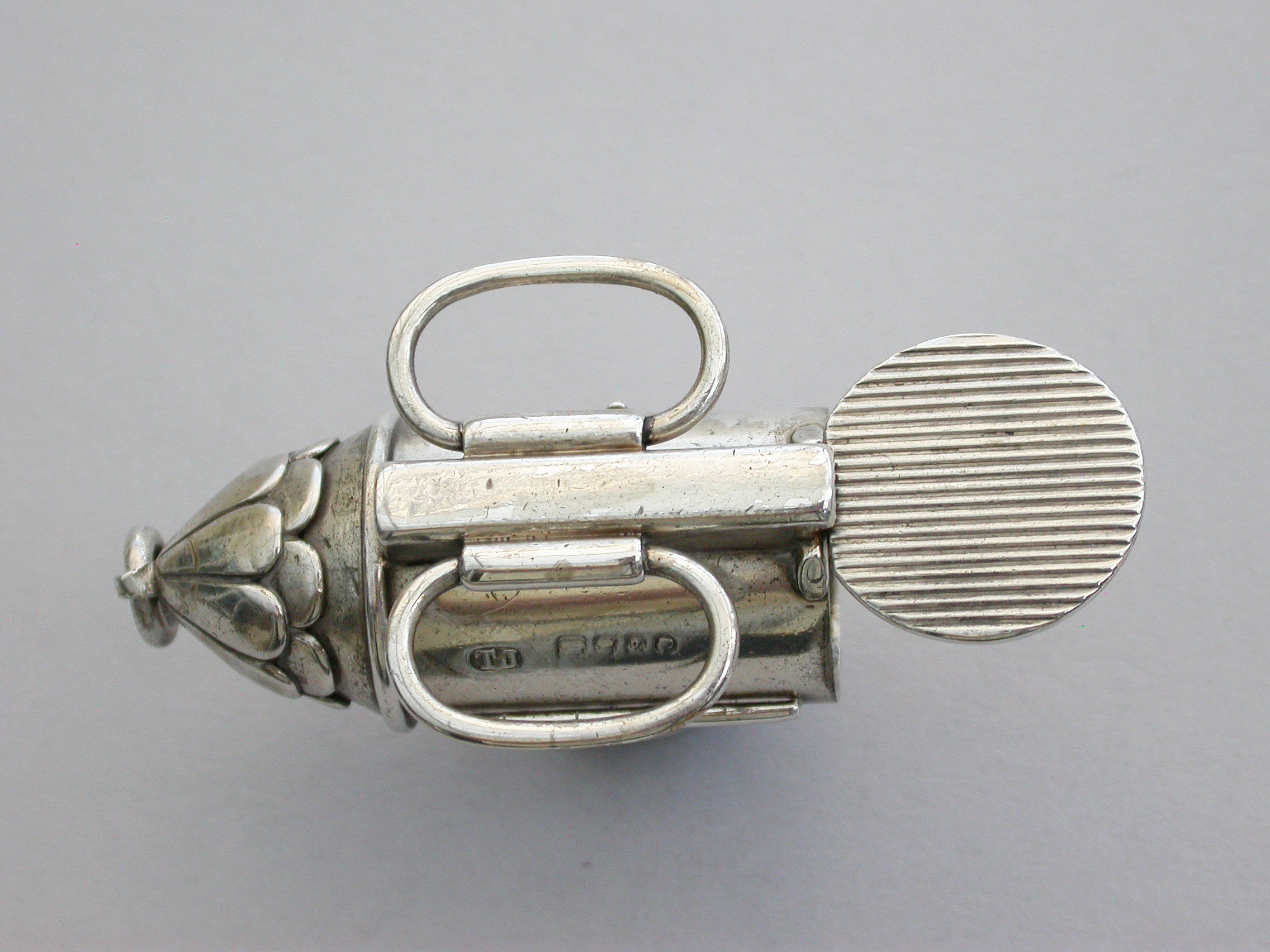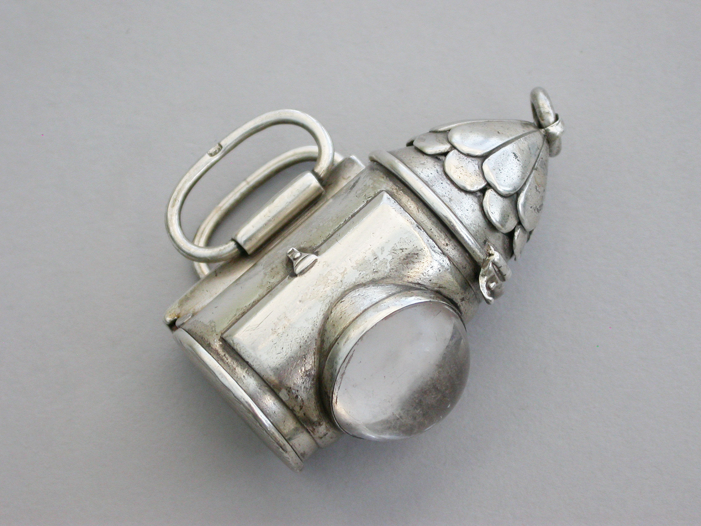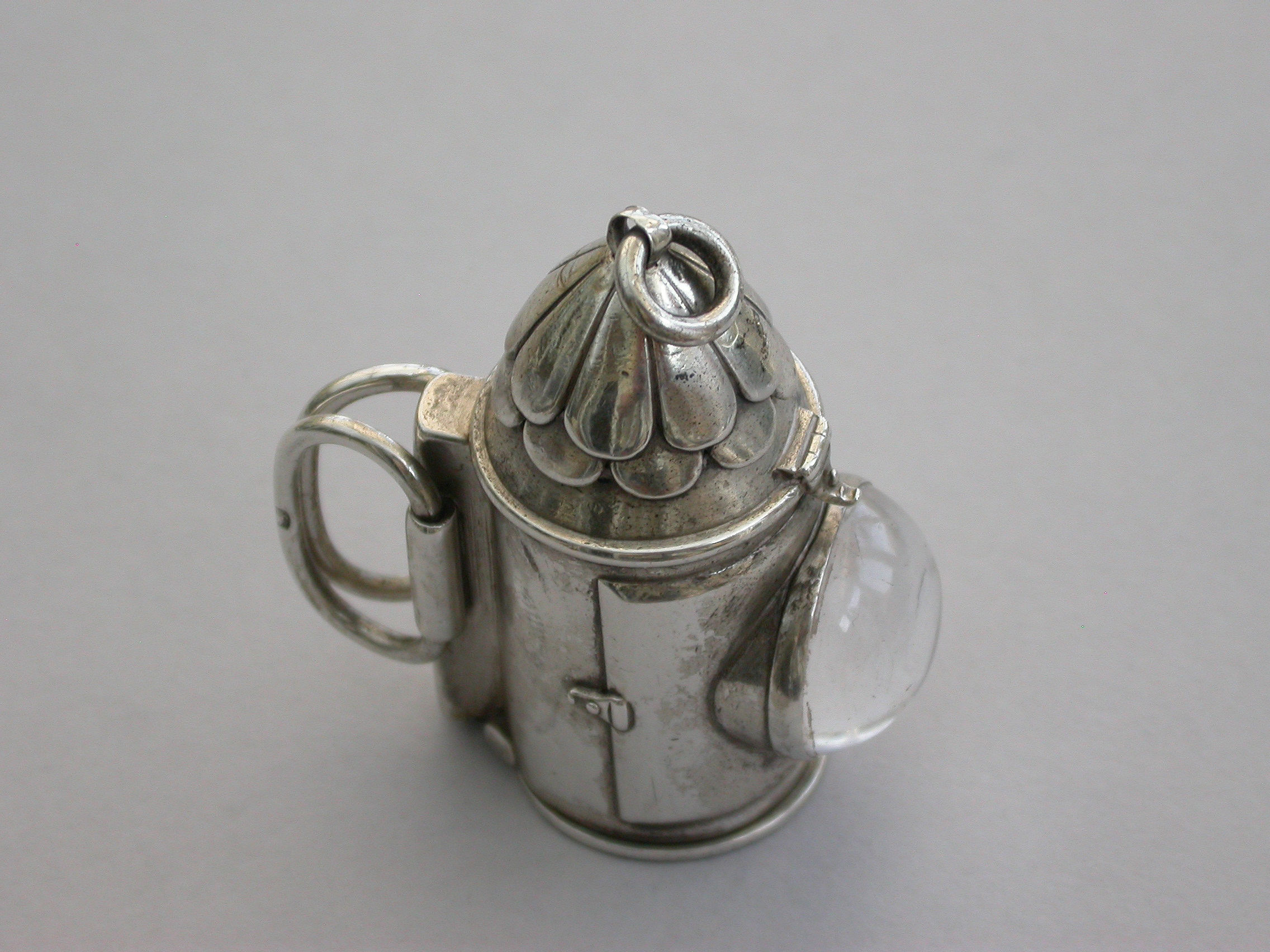 A rare Victorian novelty silver Vesta Case made in the form of a policeman’s bullseye lantern, with hinged fold-out handles to the reverse, a sprung ribbed hinged cover to the base forming the striker. Domed glass lens to the front, attached suspension ring.