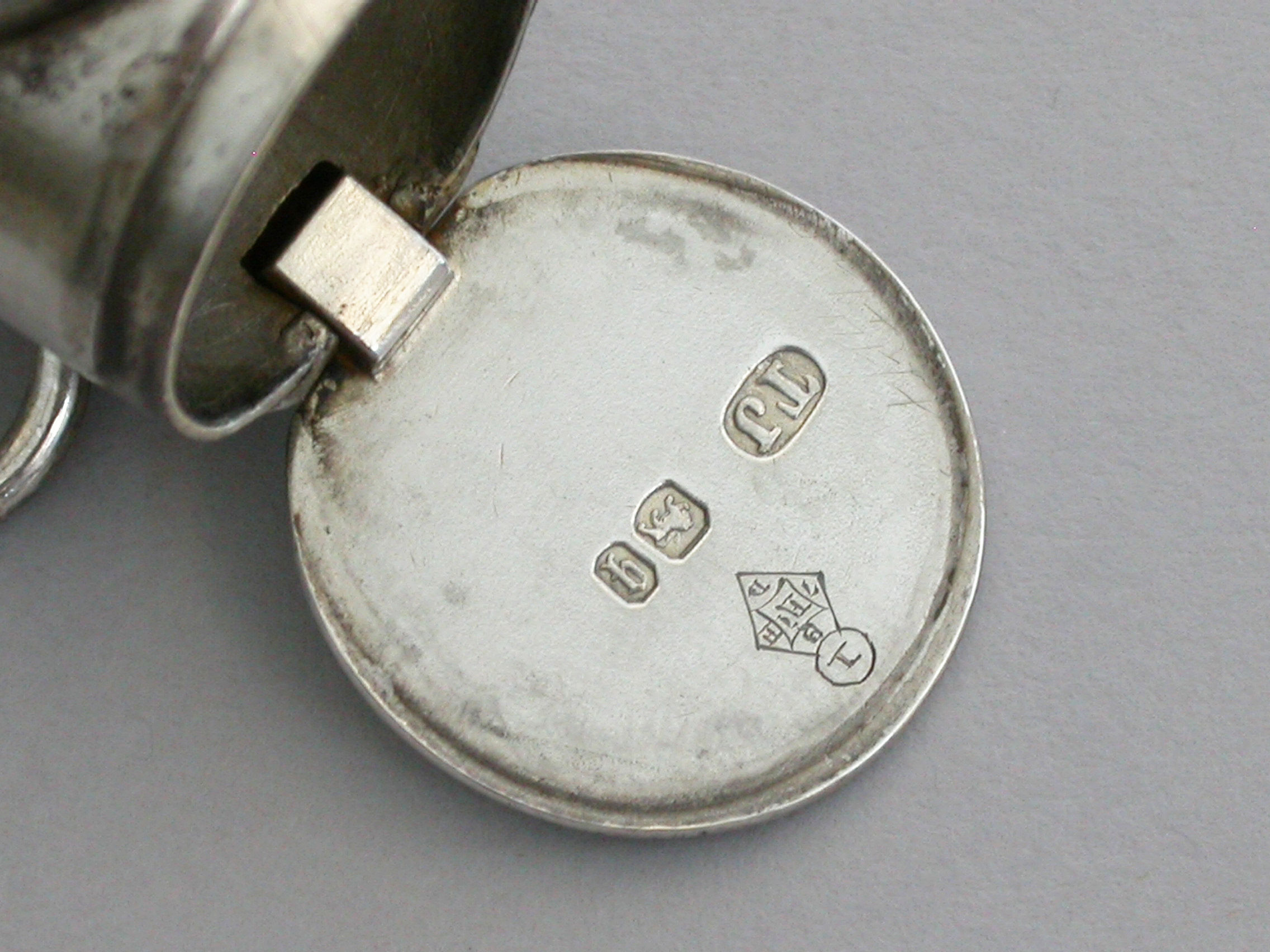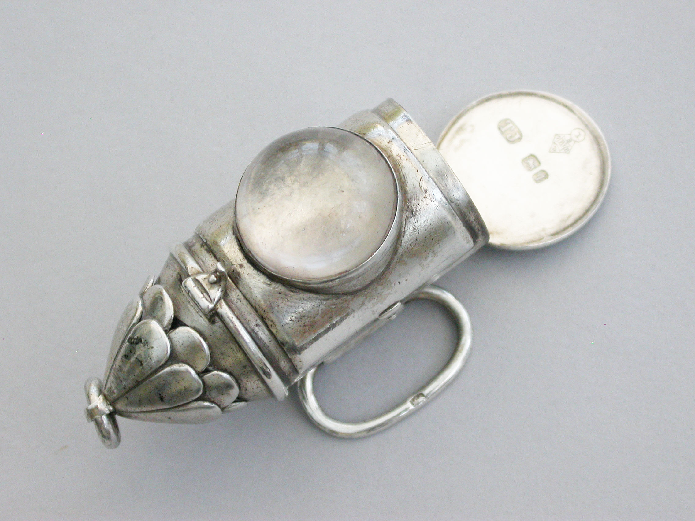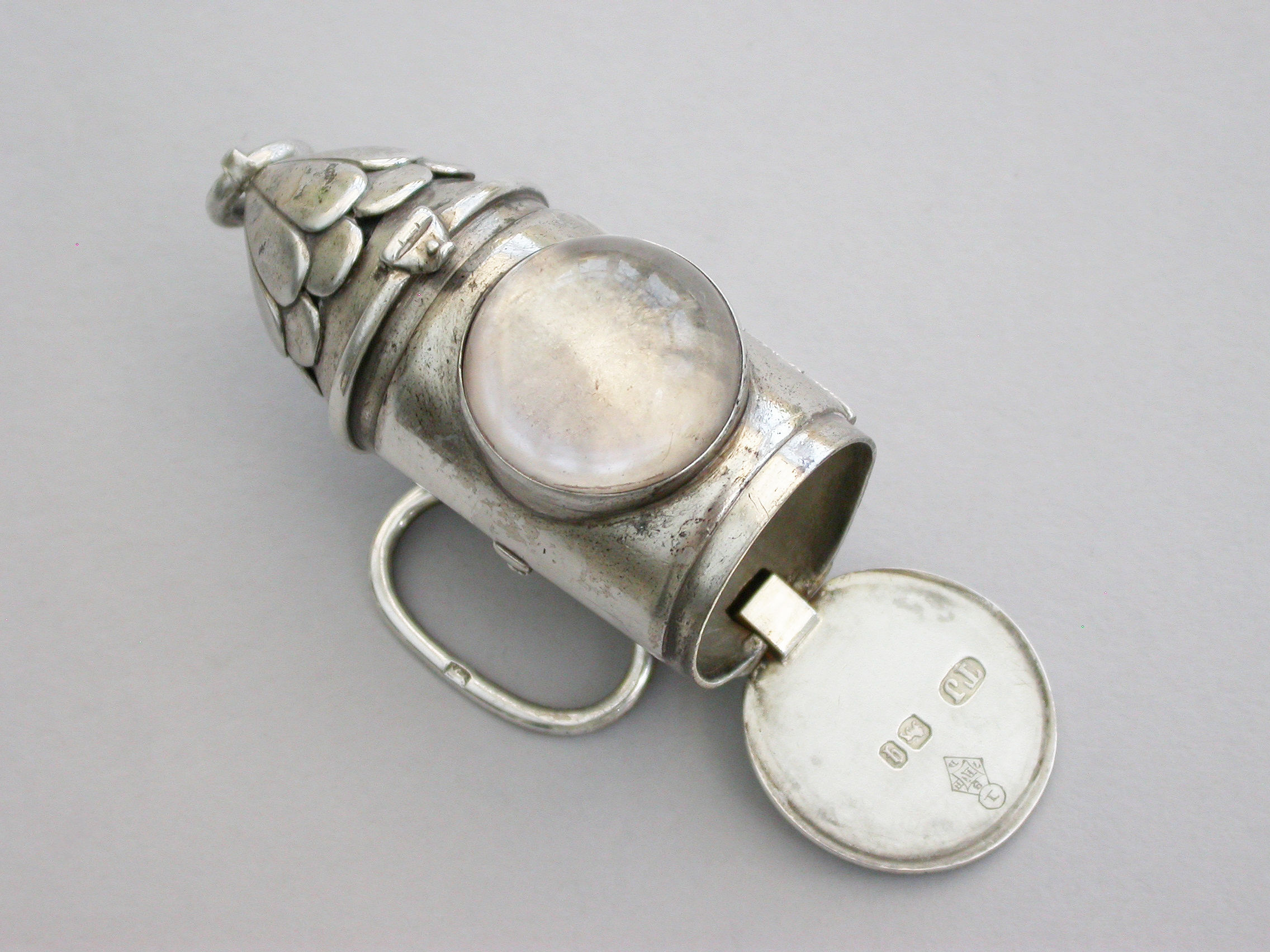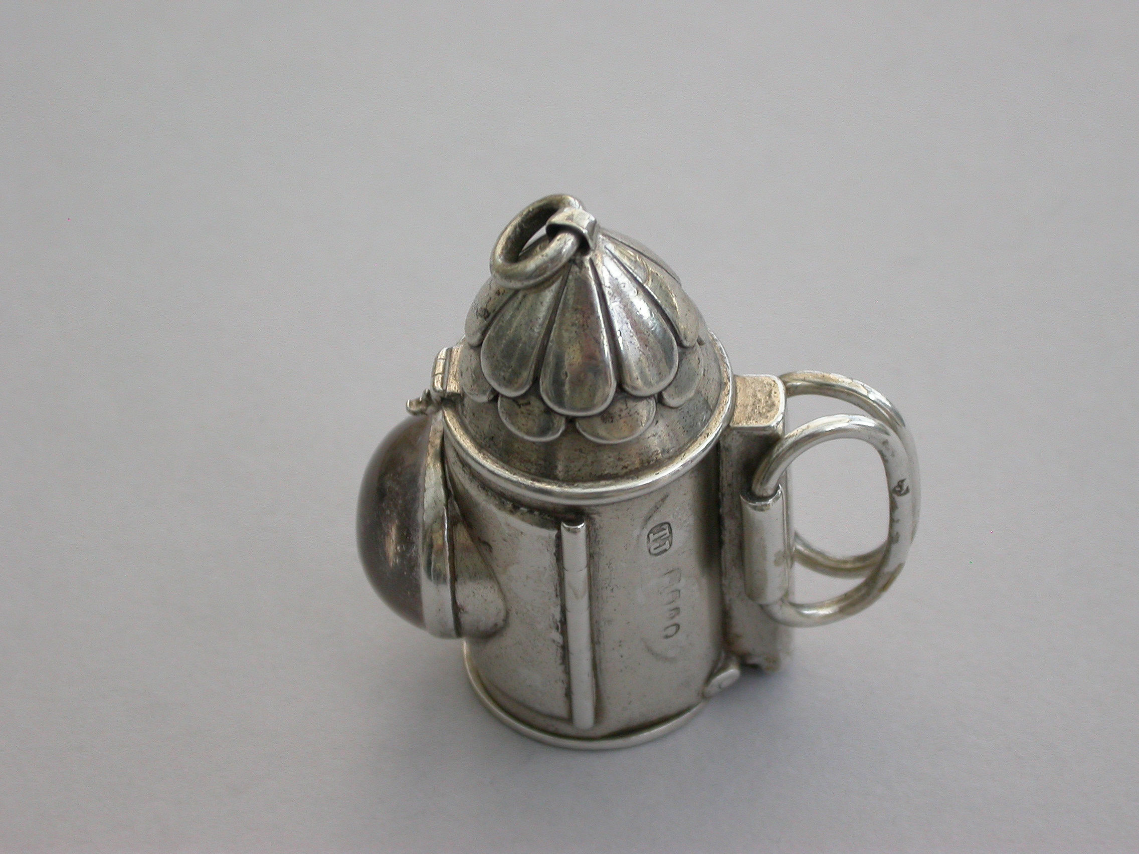 A rare Victorian novelty silver Vesta Case made in the form of a policeman’s bullseye lantern, with hinged fold-out handles to the reverse, a sprung ribbed hinged cover to the base forming the striker. Domed glass lens to the front, attached suspension ring.