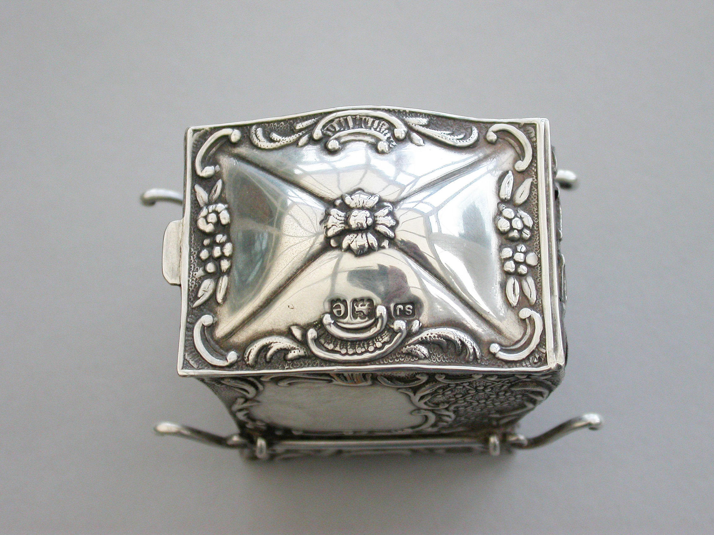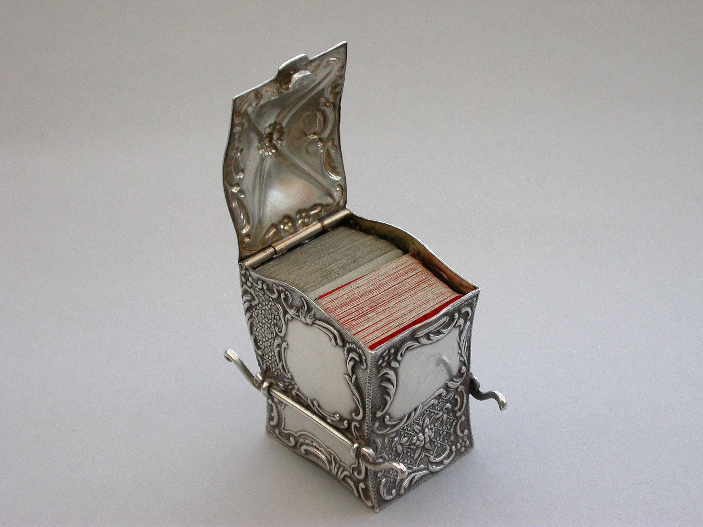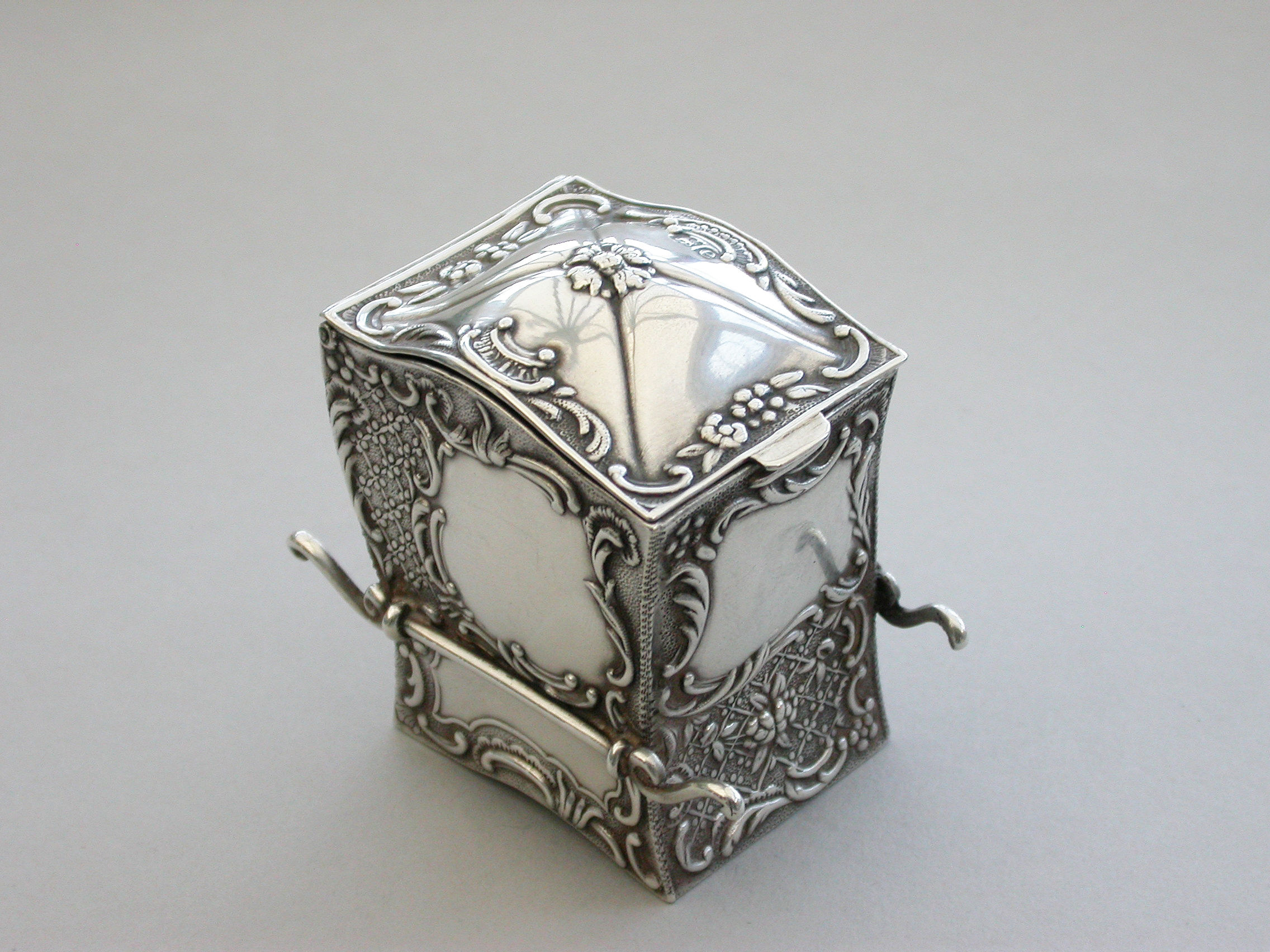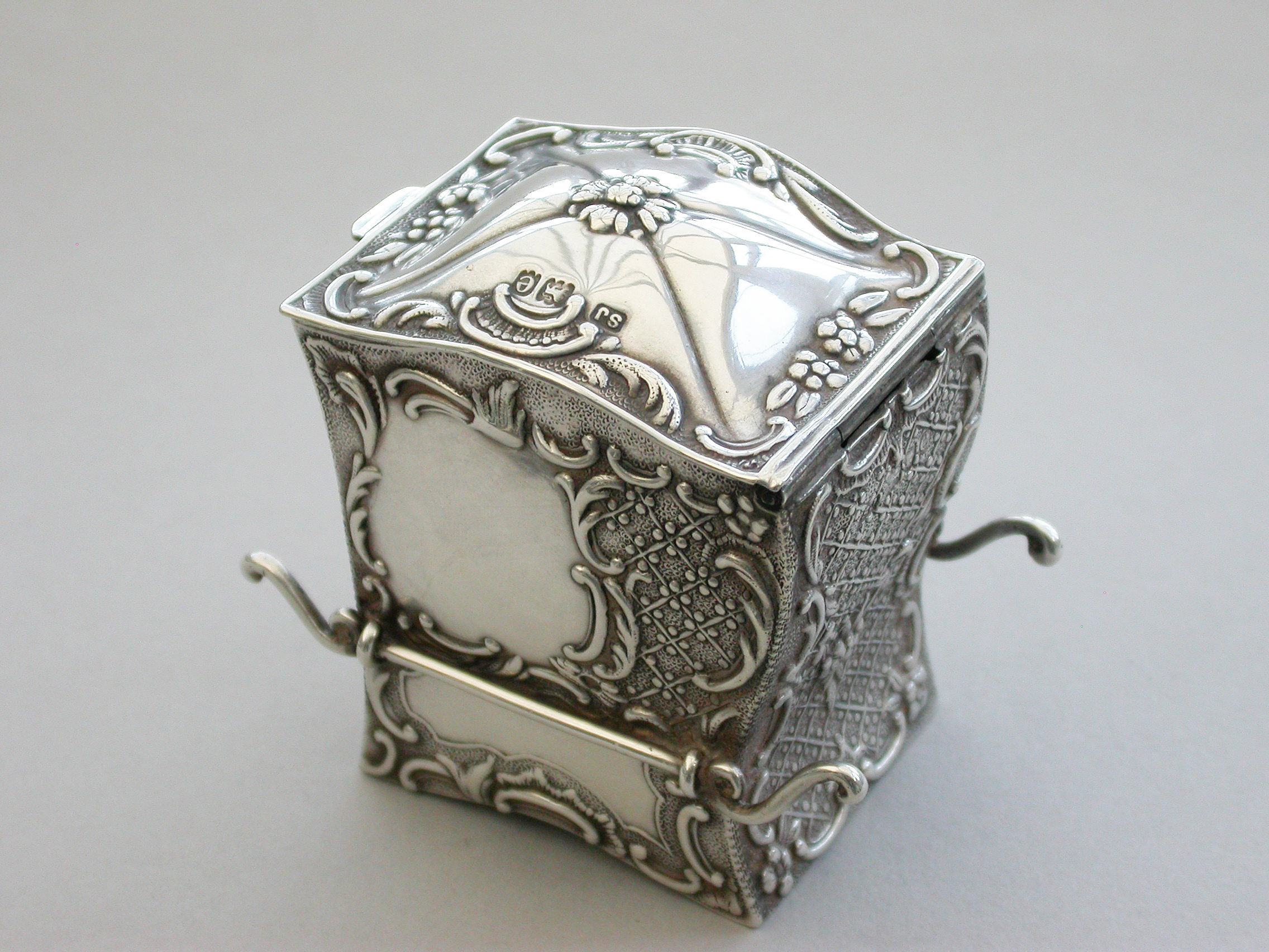 A rare late Victorian novelty silver miniature twin pack Playing Cards Box modeled in the form a Sedan Chair, with hinged domed lid and each panel chased and embossed with intricate repousse scroll work, vacant caroutches to the front and sides. The silver gilt interior containing two complete packs of contemporary miniature playing cards.
