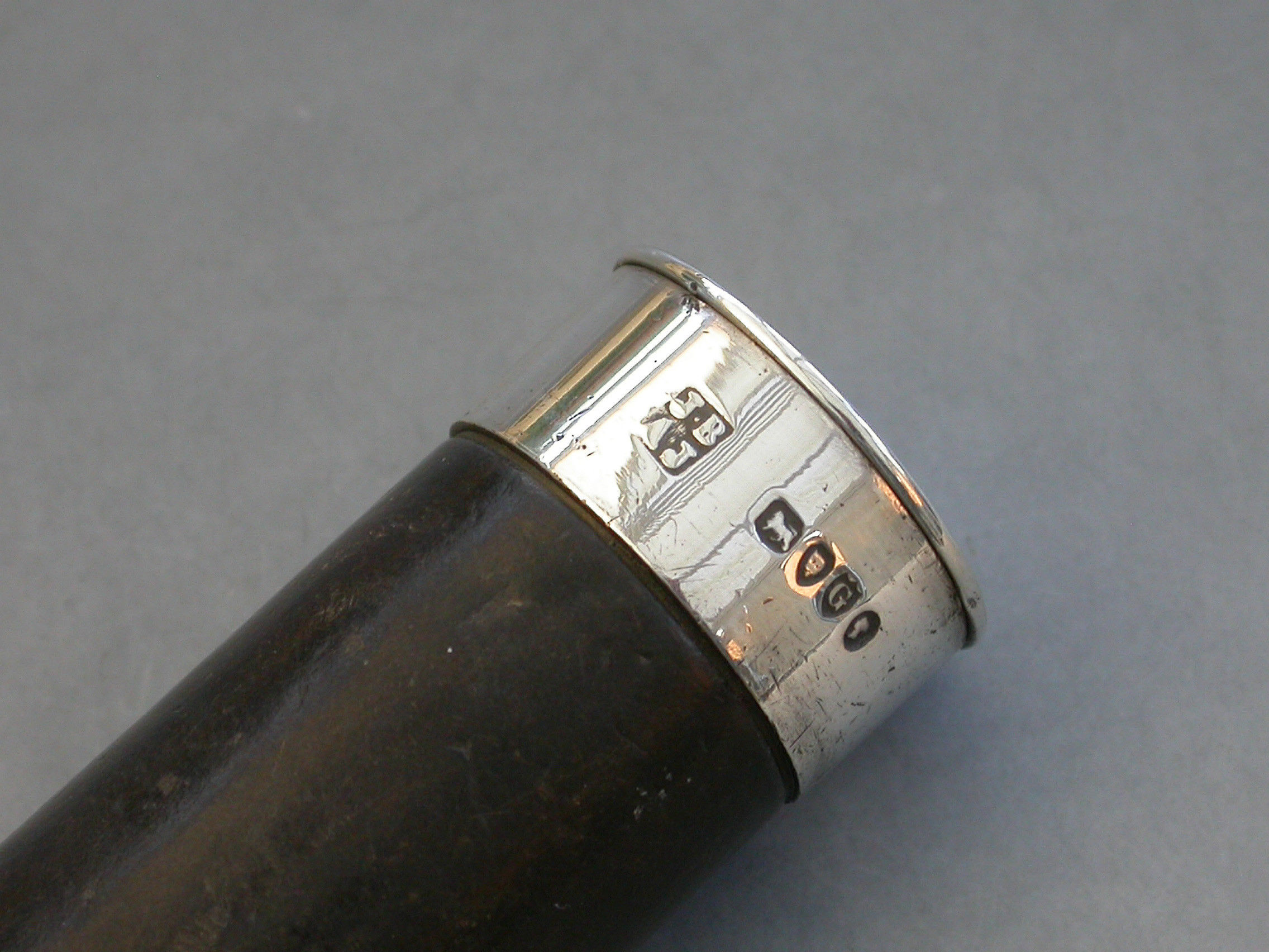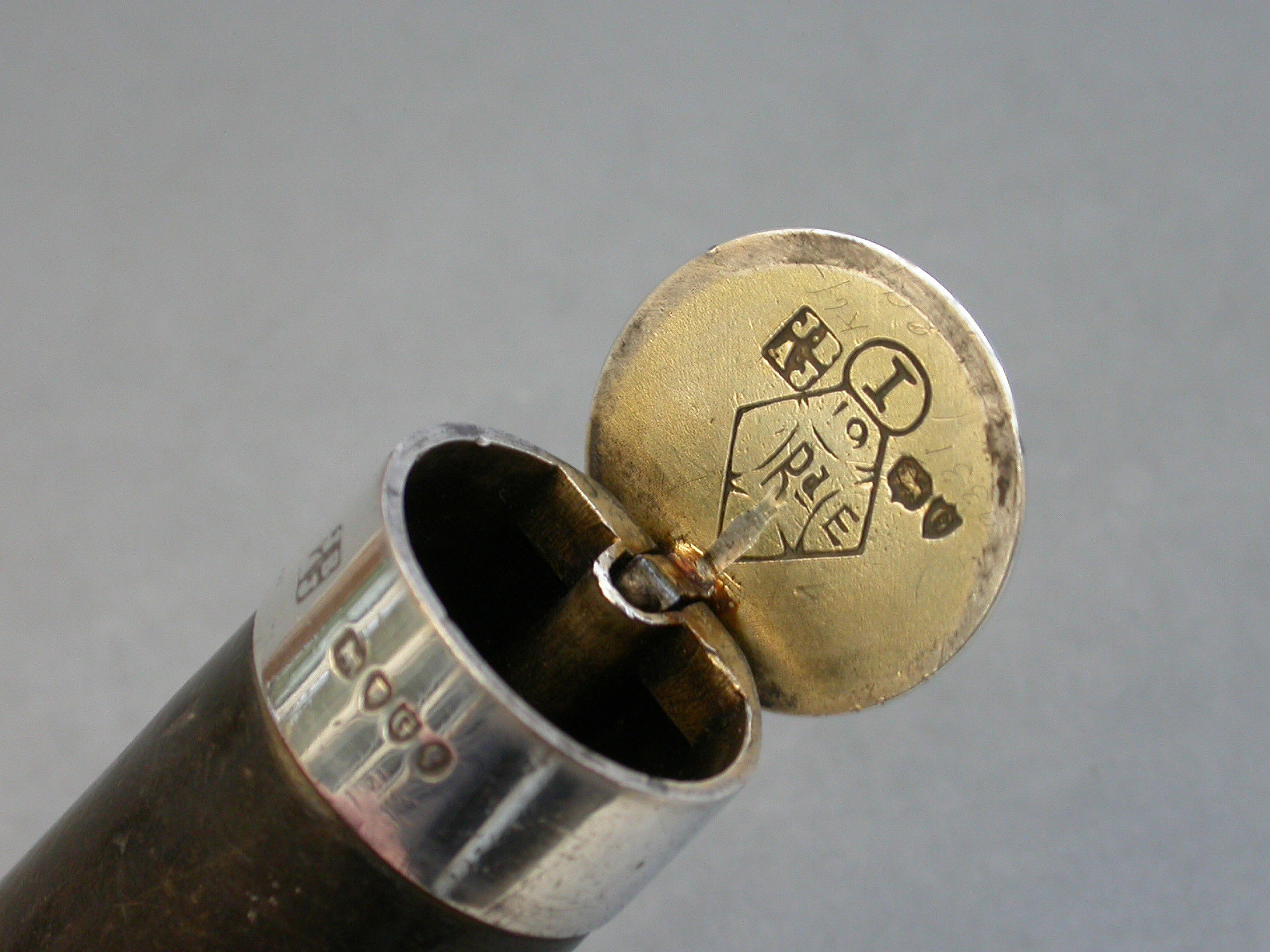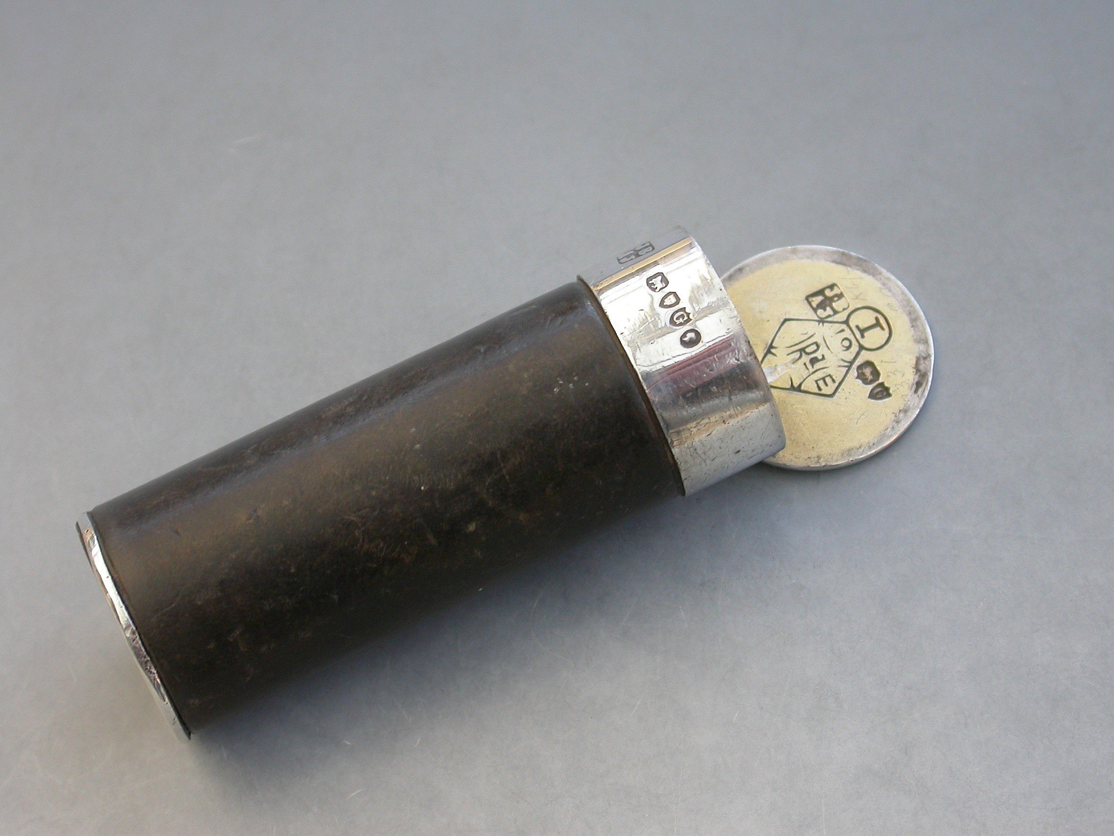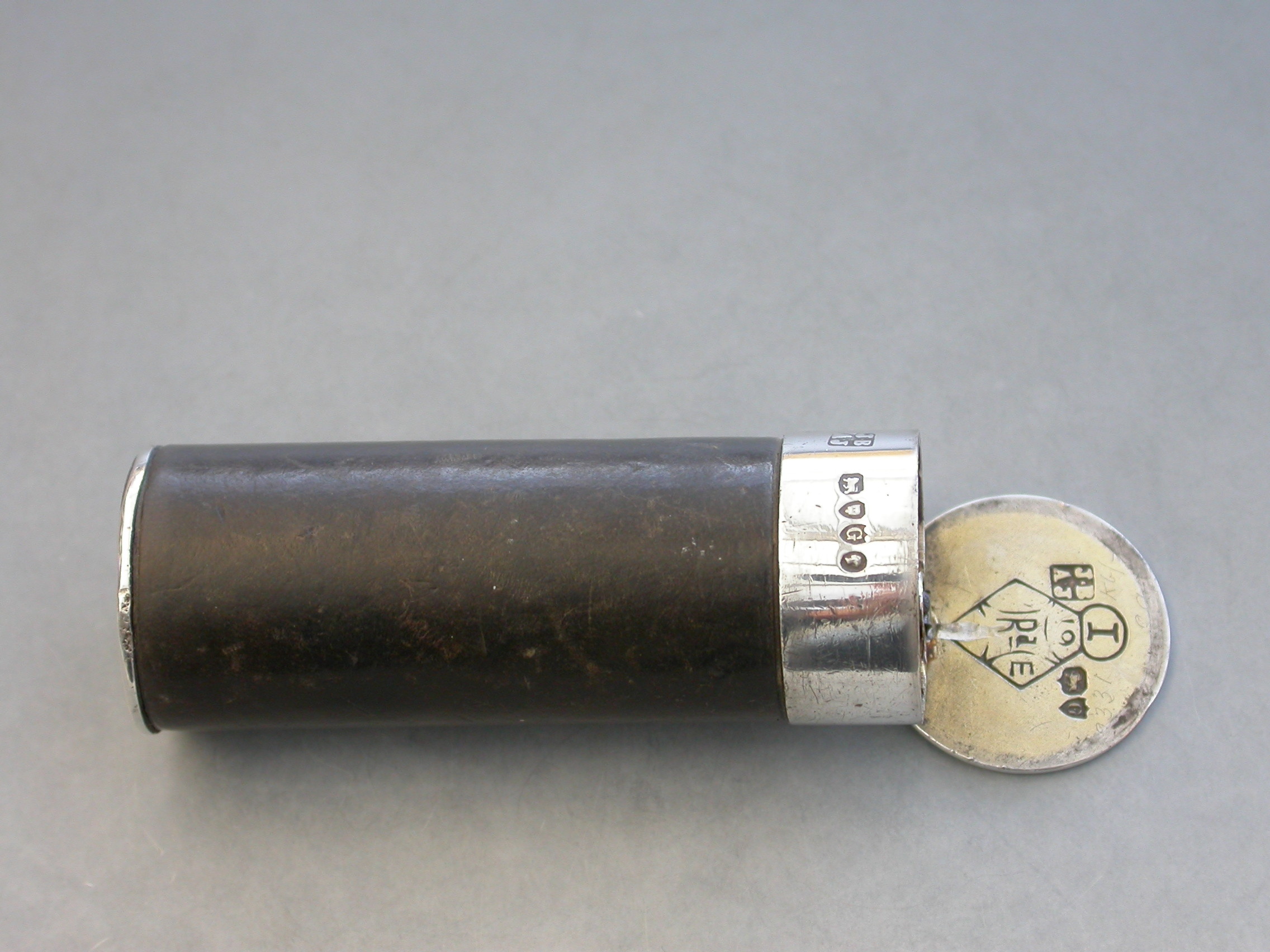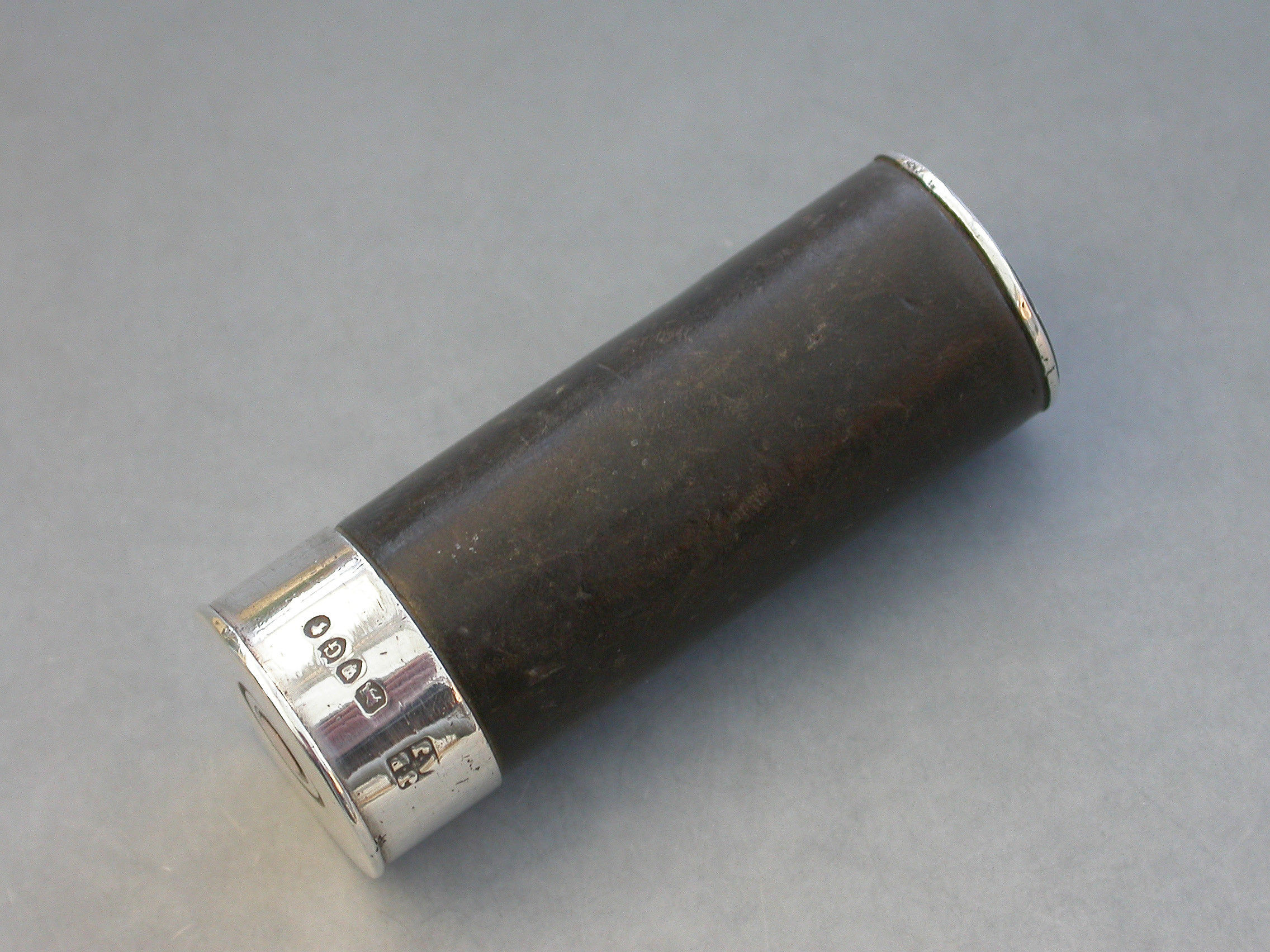 A rare Victorian novelty silver Vesta Case made in the form of a Shotgun Cartridge with leather-clad body and silver gilt interior. The steel striker to the base and a brass firing pin to the lid. The interior of the cover engraved with a registered design lozenge.