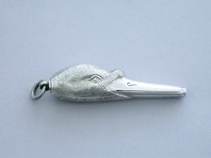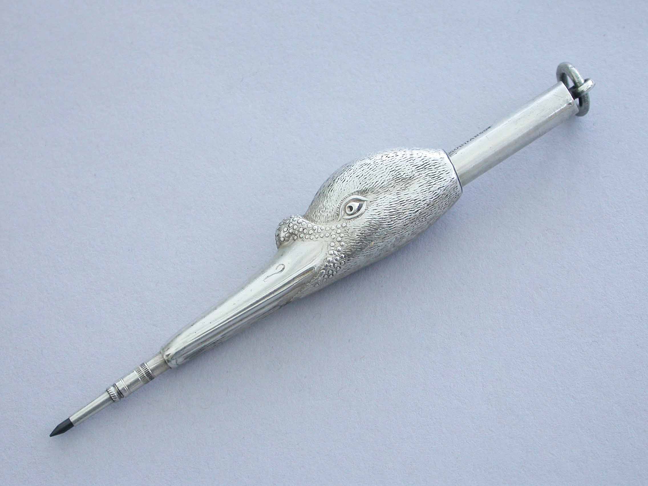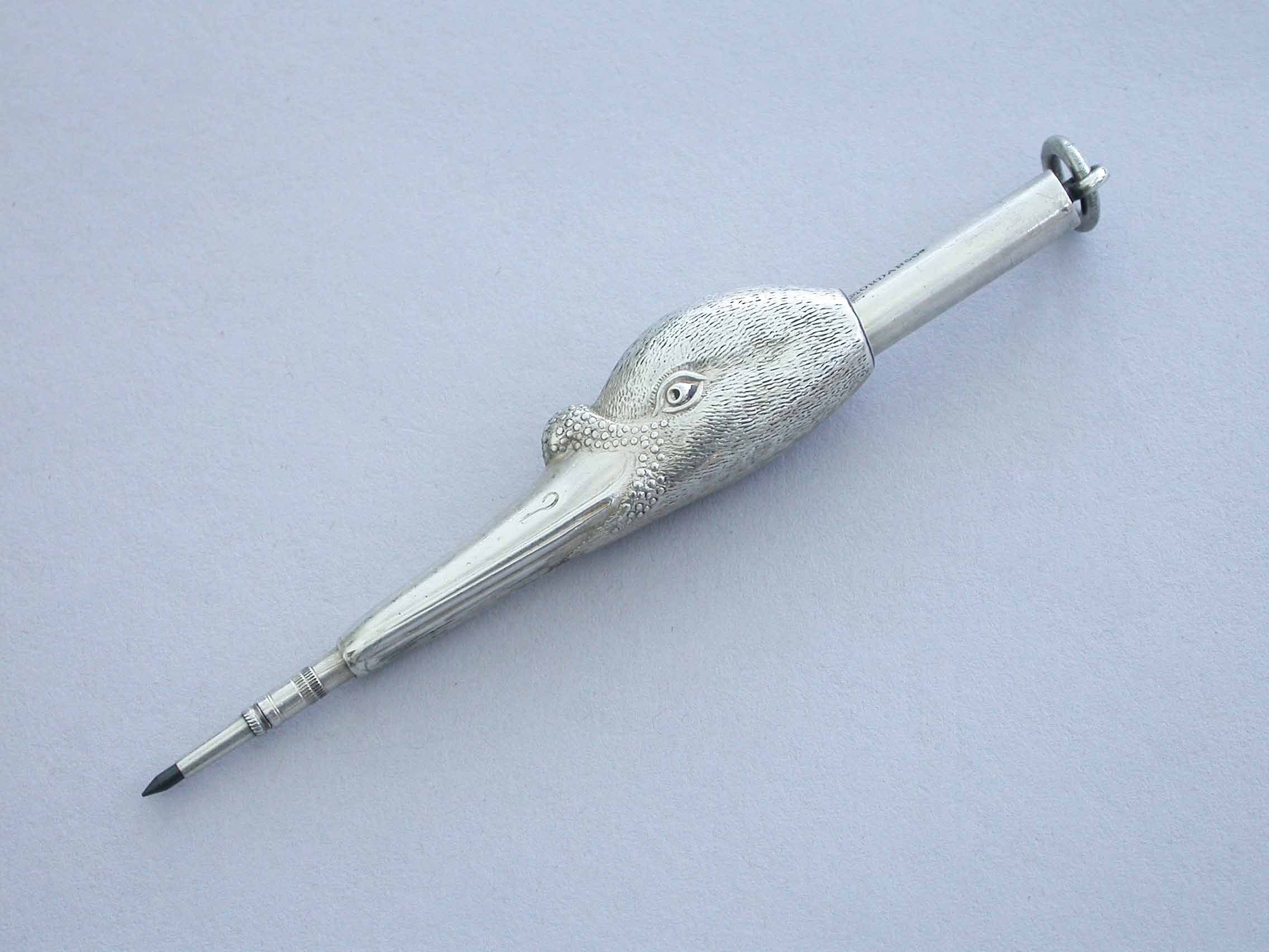 A fine and rare Victorian novelty silver telescopic Propelling Pencil made in the form of a Swans Head, with attached suspension ring.
