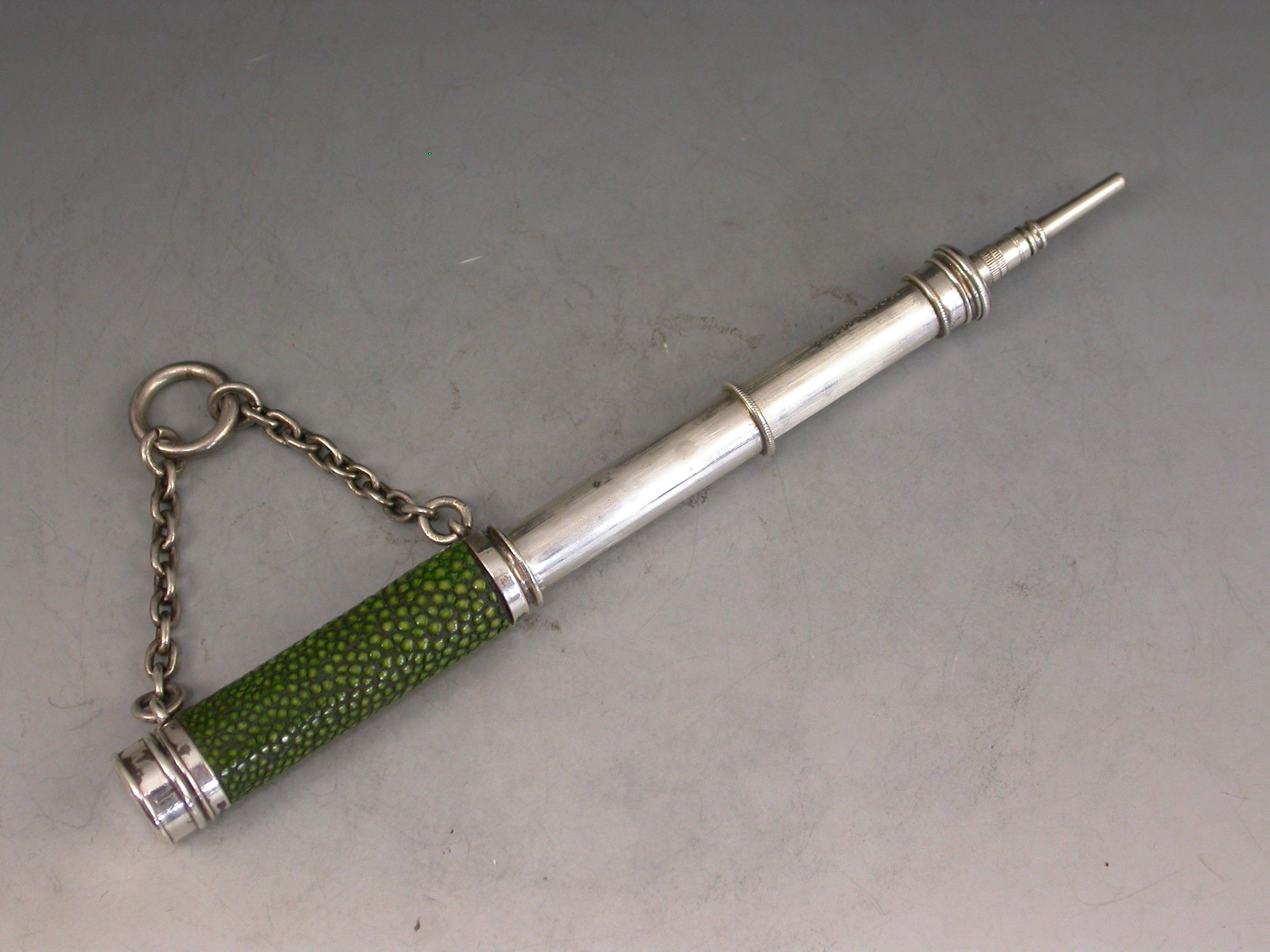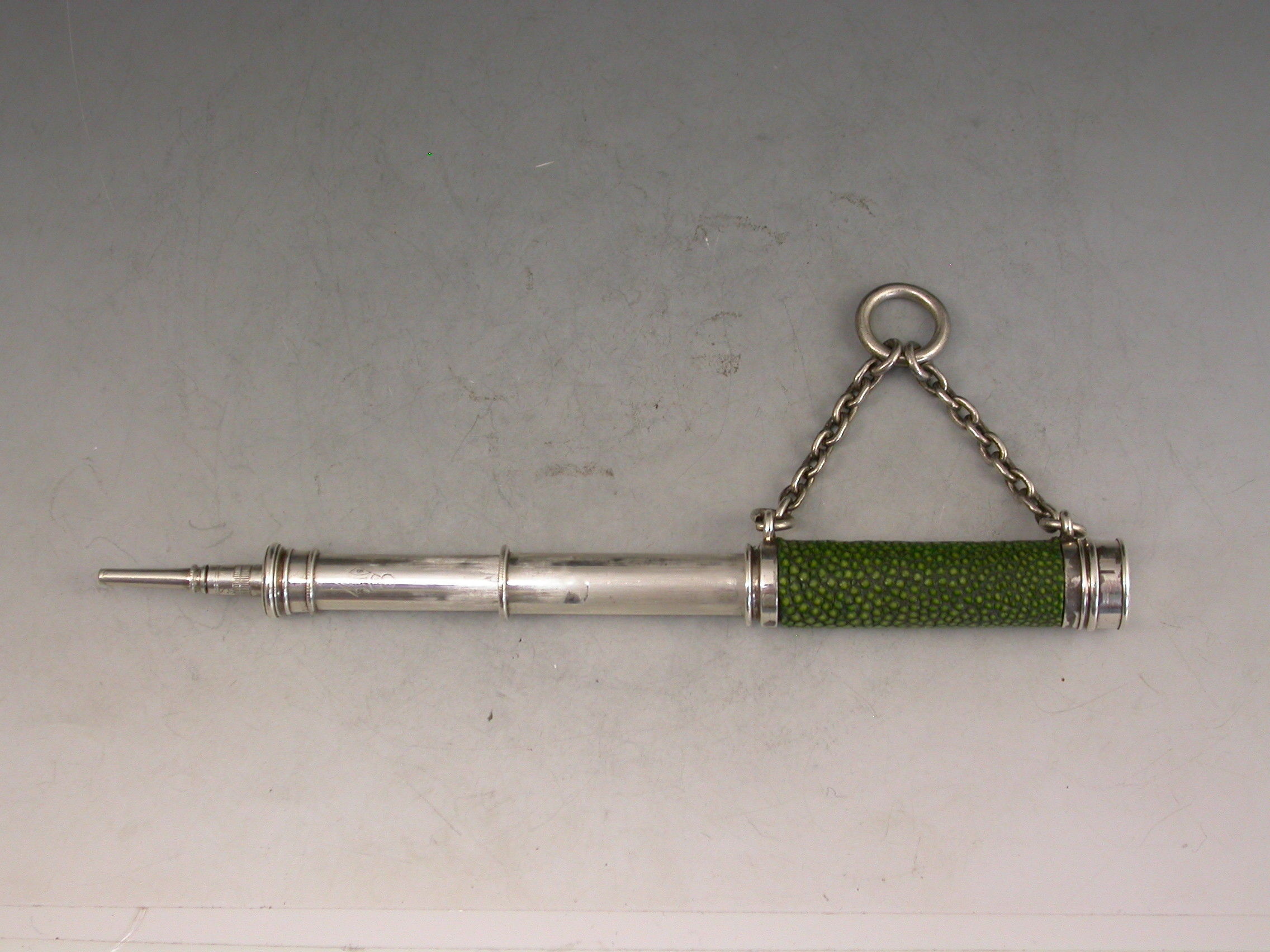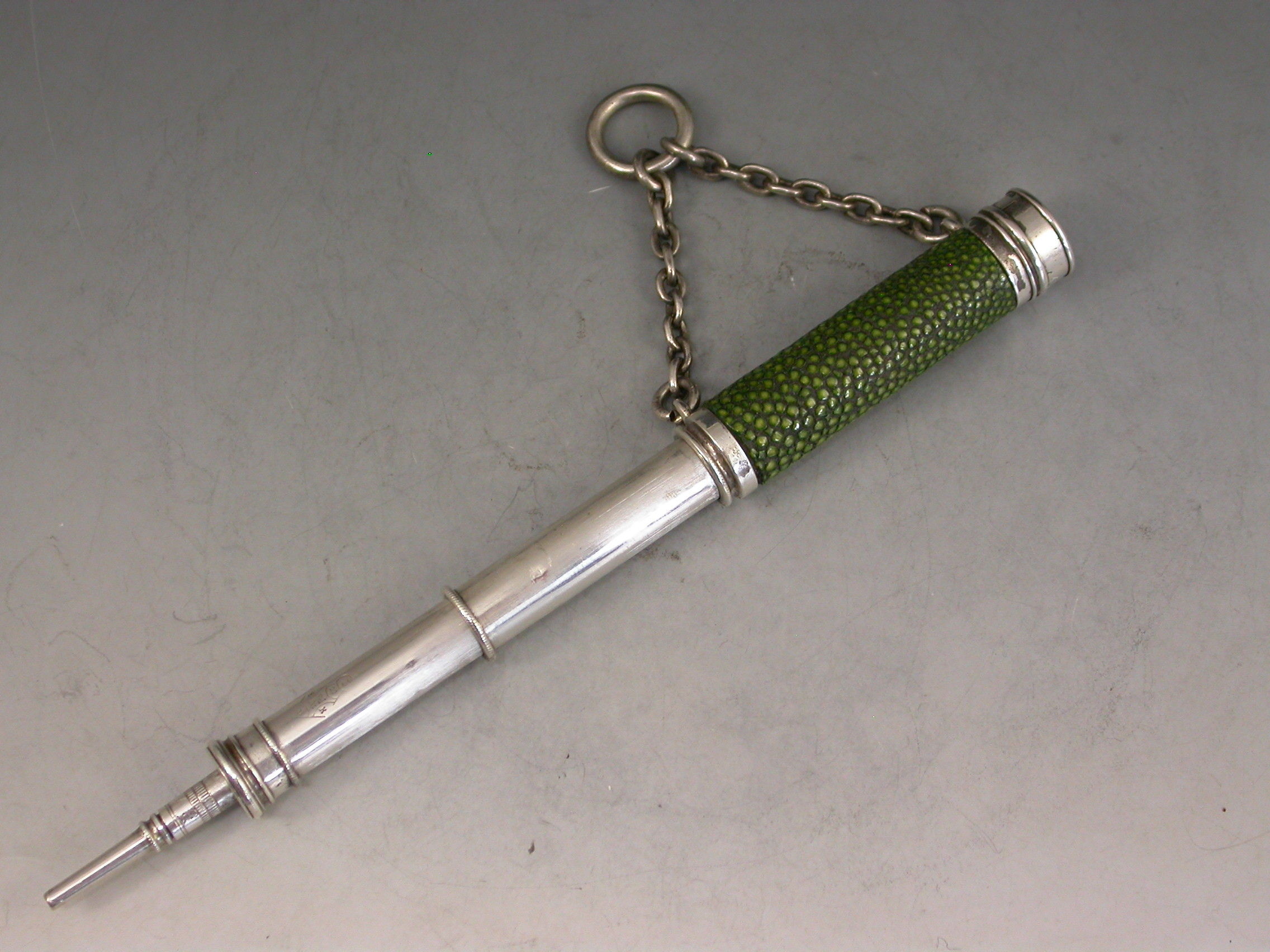 A very rare Victorian novelty silver telescopic Propelling Pencil formed as a Telescope with original shagreen cover to the barrel and attached suspension ring and chain.