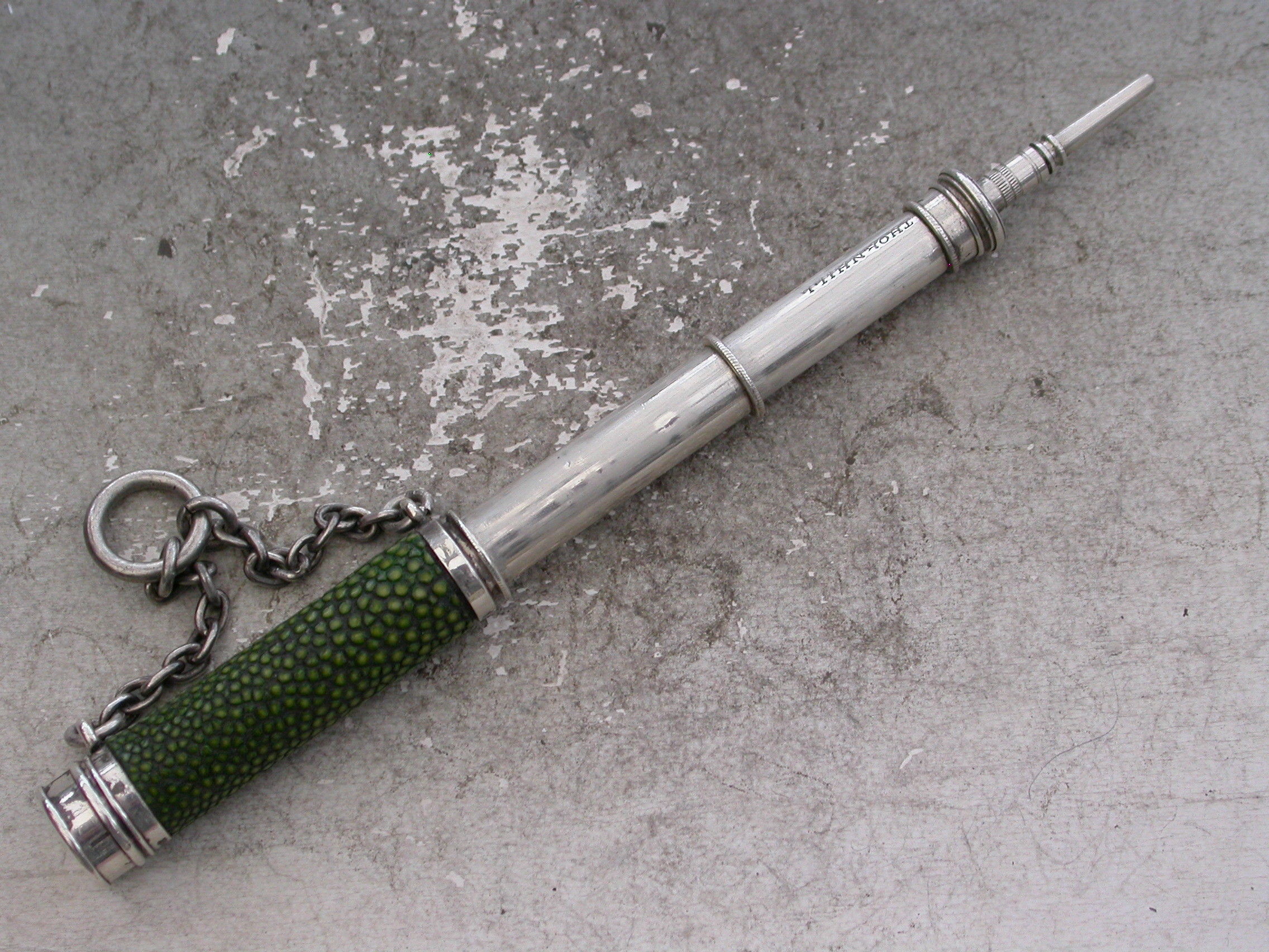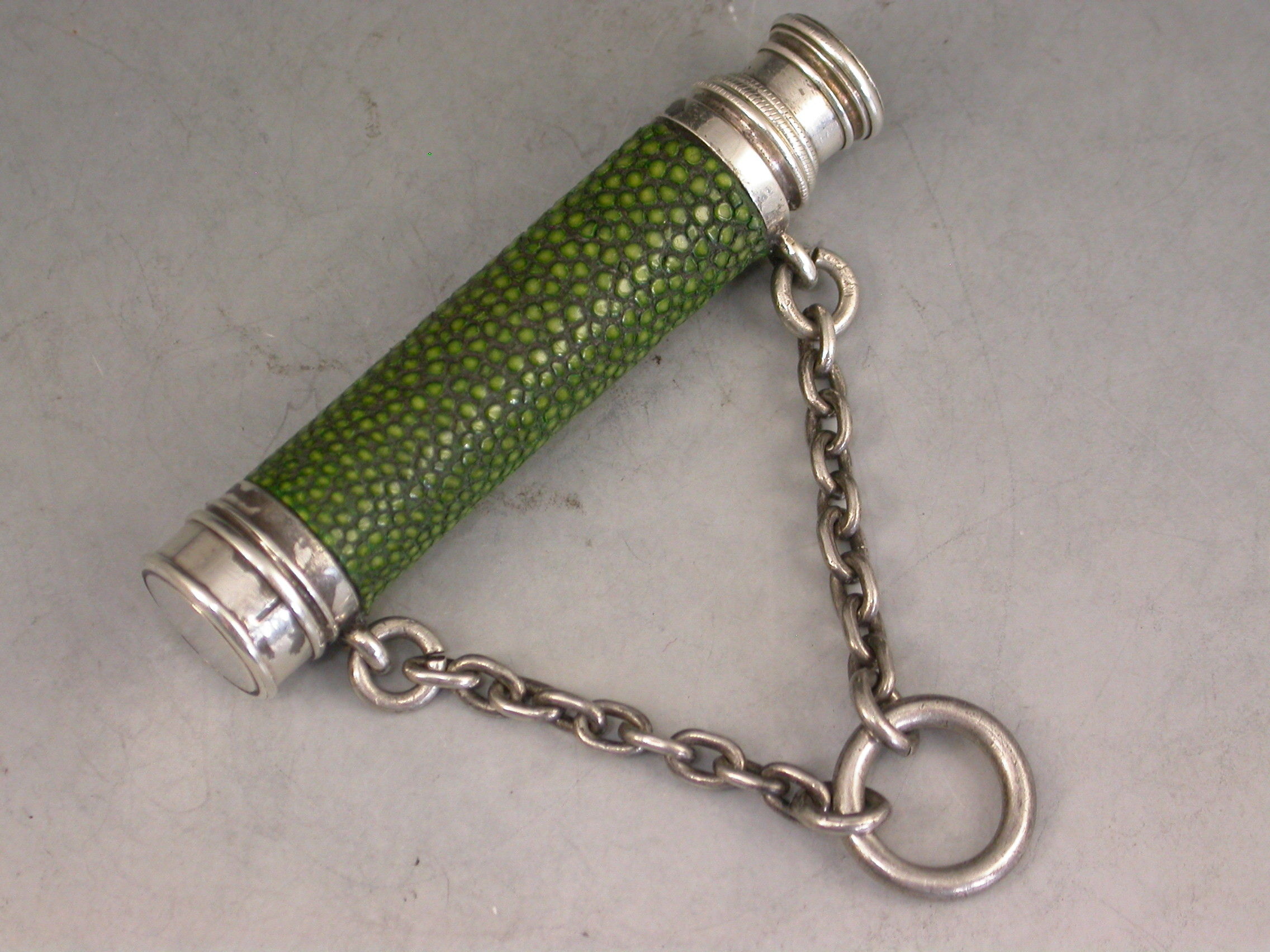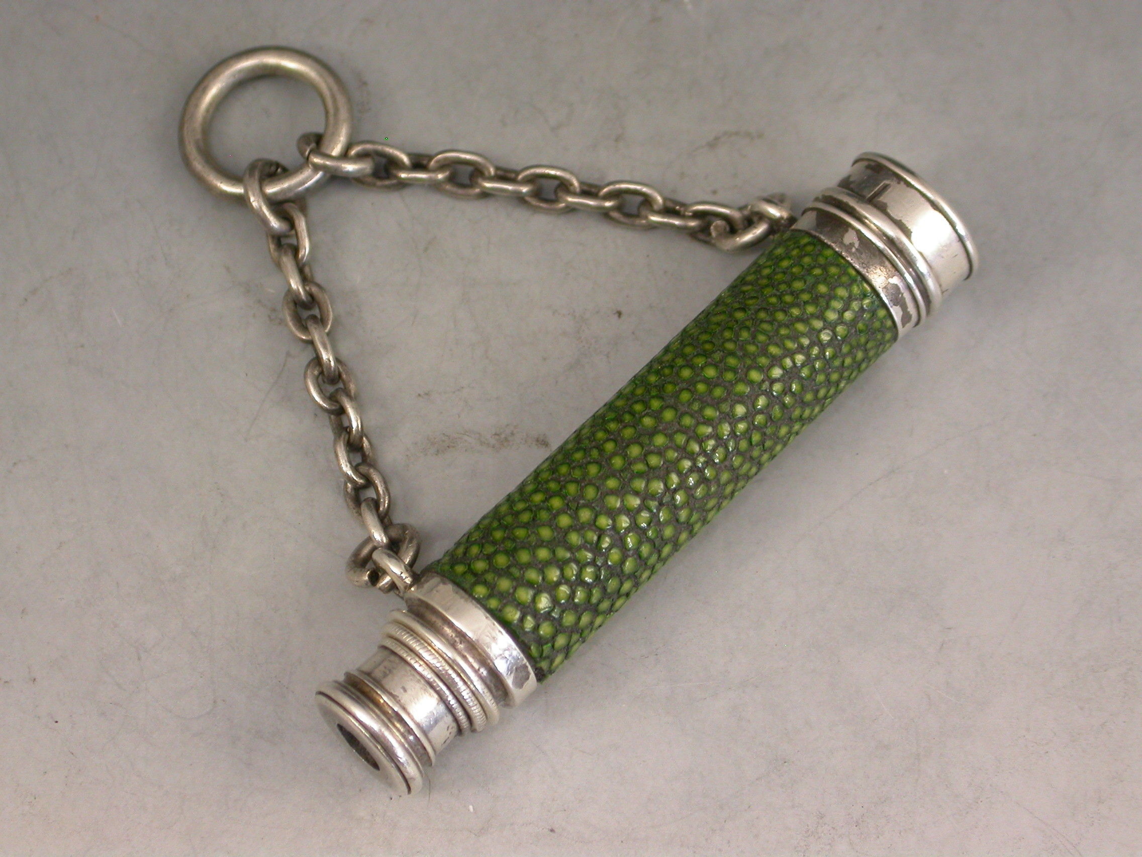 A very rare Victorian novelty silver telescopic Propelling Pencil formed as a Telescope with original shagreen cover to the barrel and attached suspension ring and chain.