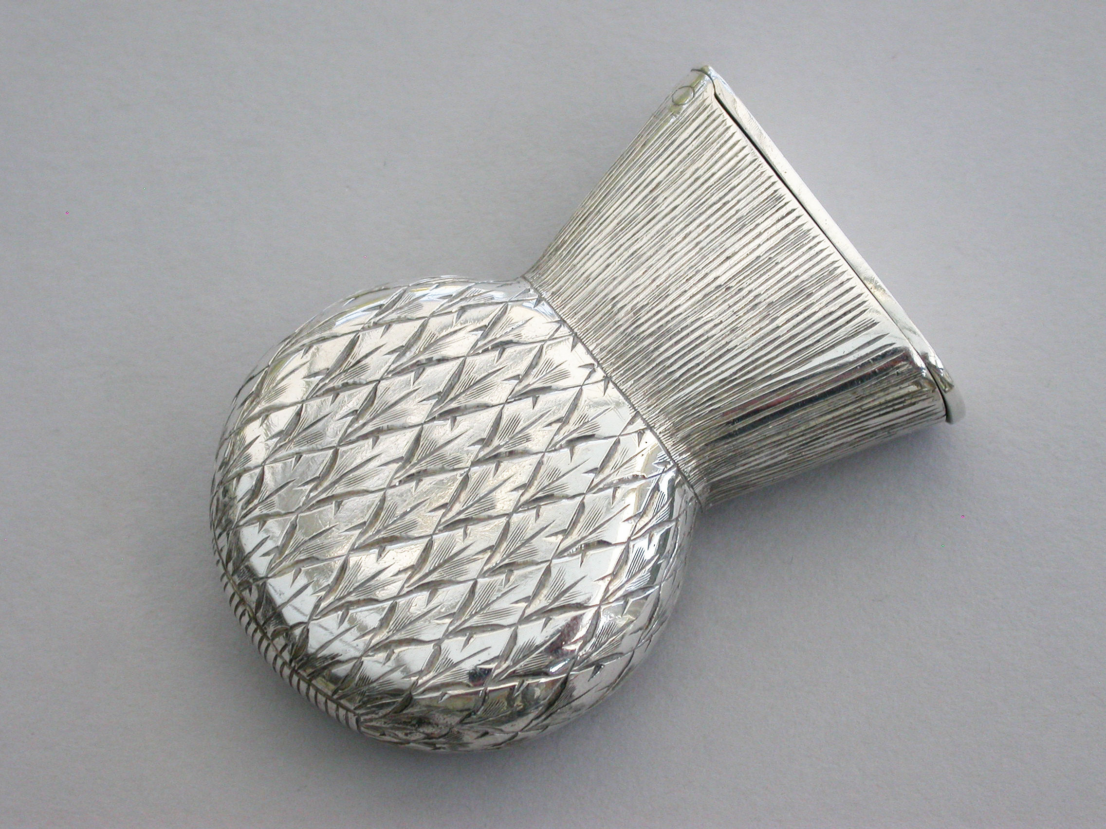 A good quality Victorian novelty Scottish silver Vesta Case made in the form of a thistle, with realistically engraved decoration, the sprung flat hinged lid engraved with the owners initials 'FDR'. Silver gilt interior.