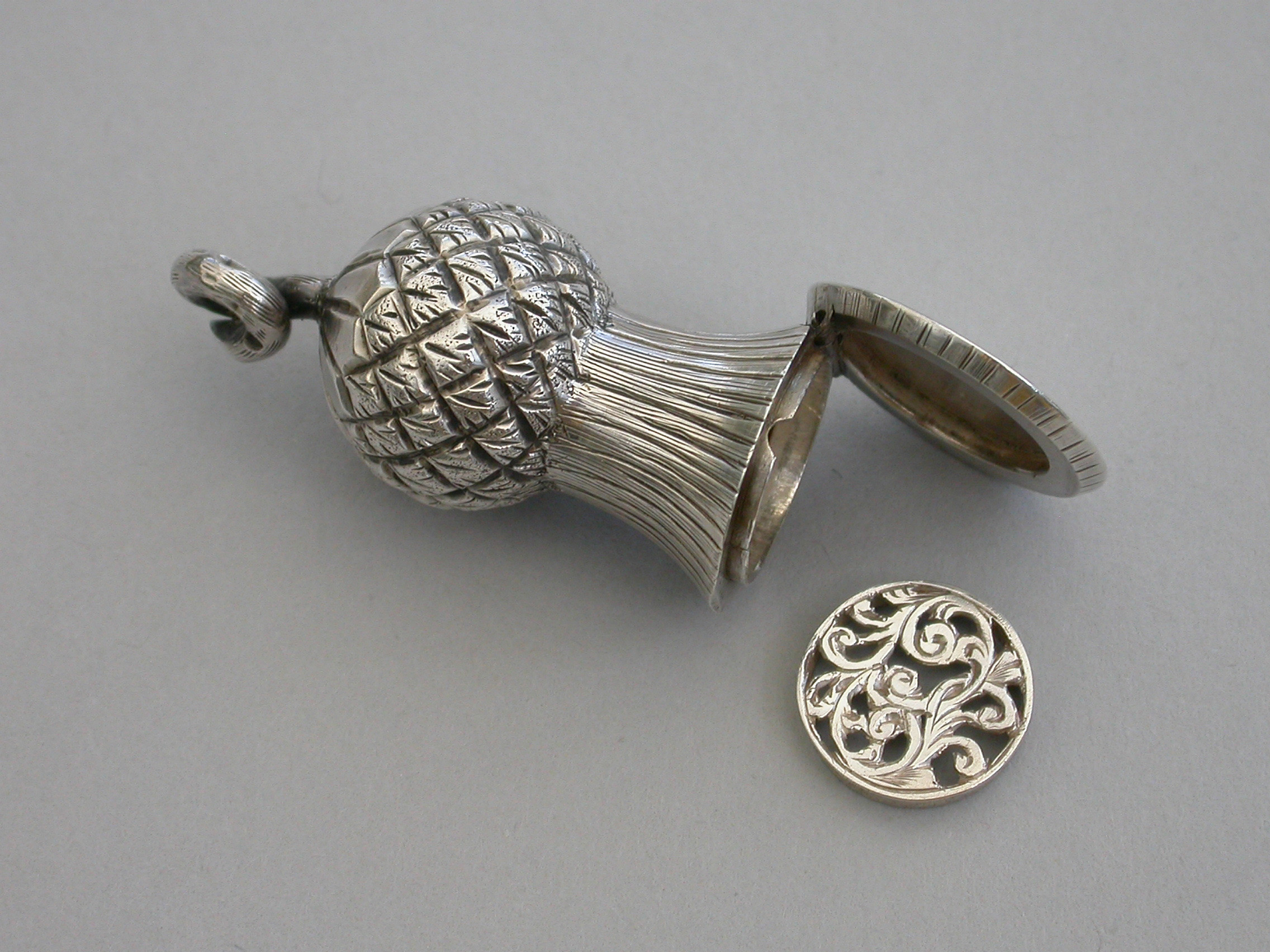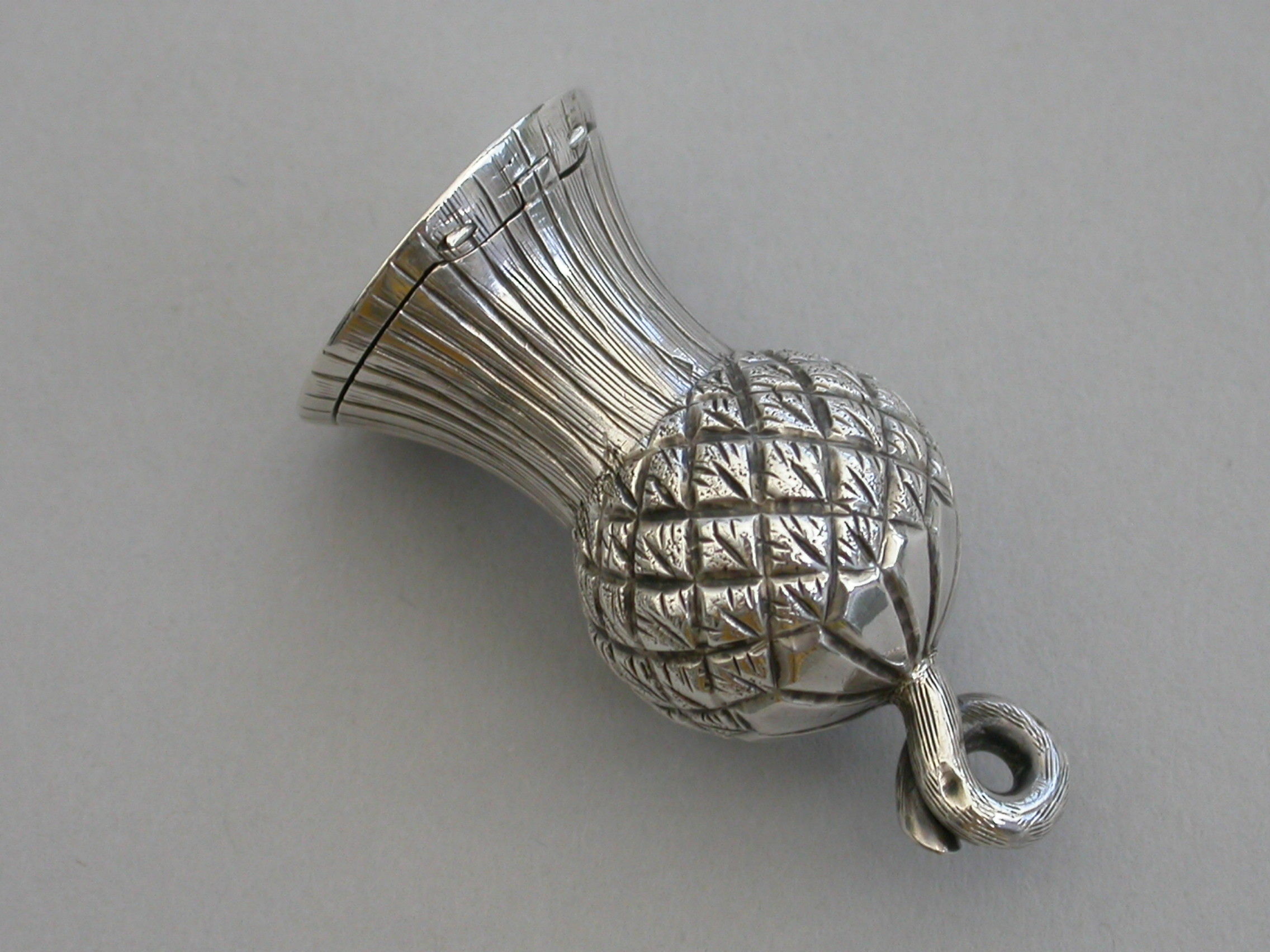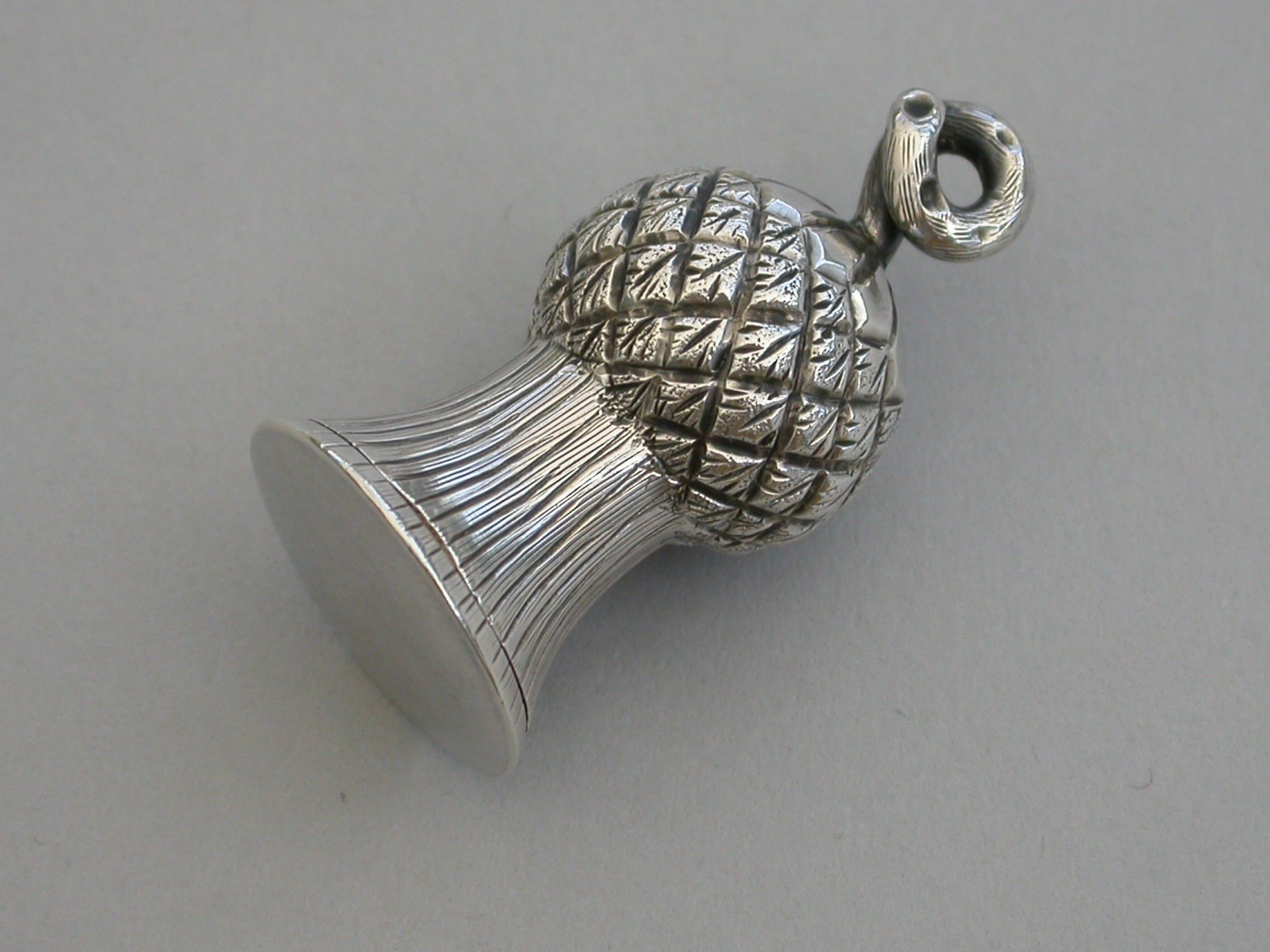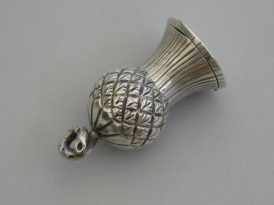 A small Victorian novelty silver Vinaigrette made in the form of a thistle, with a fine chased decoration and twisted stalk handle. The hinged lid opening to reveal a foliate scroll pierced lift-out grille.