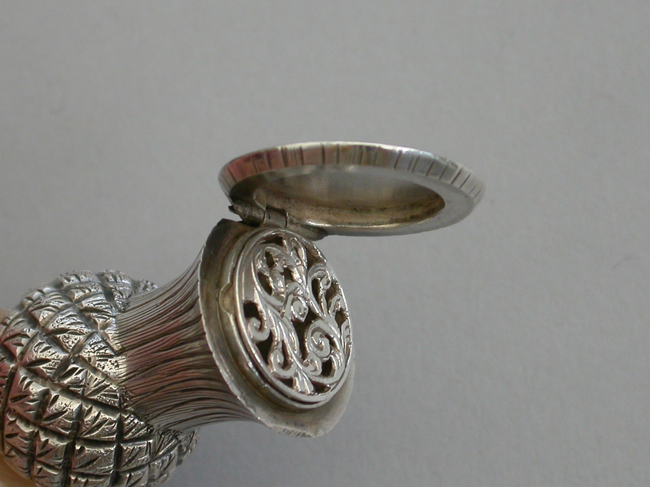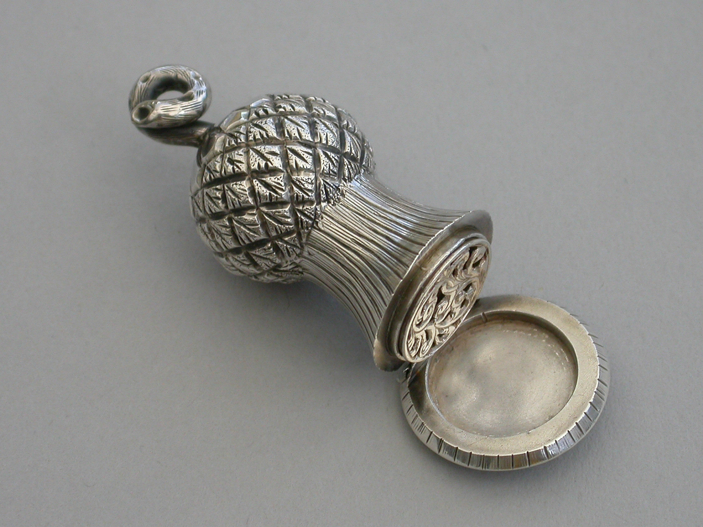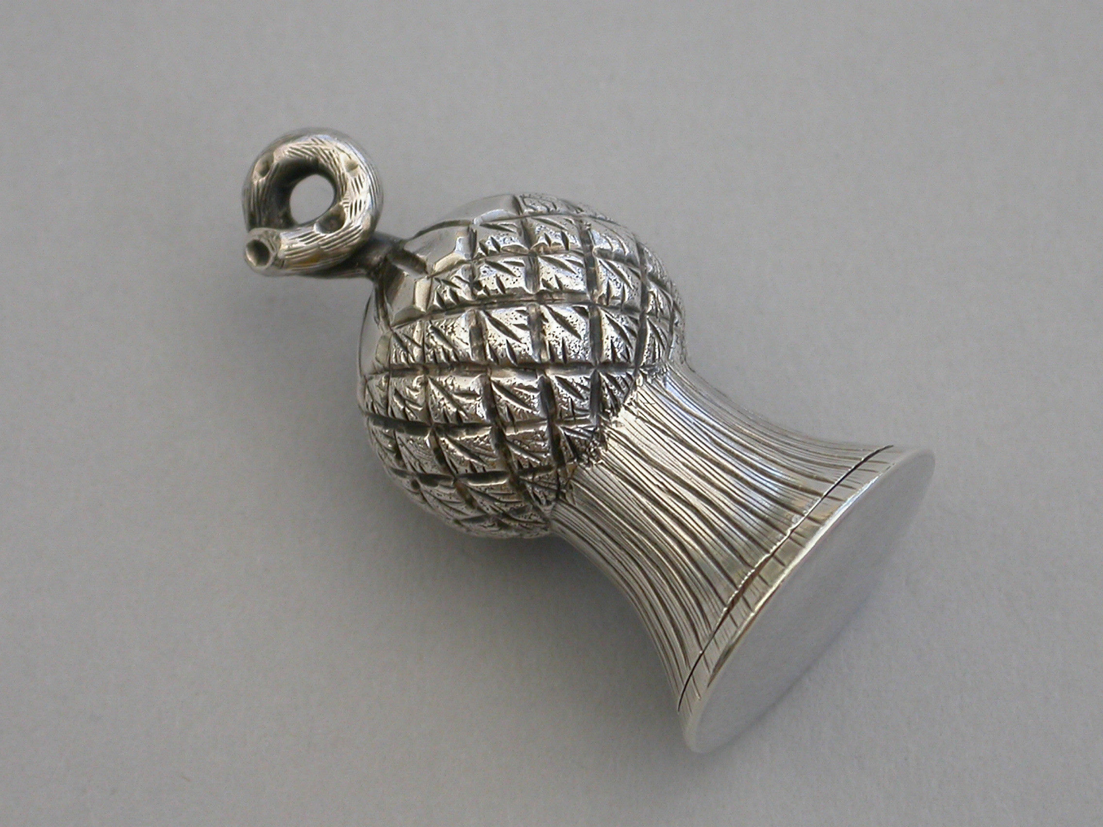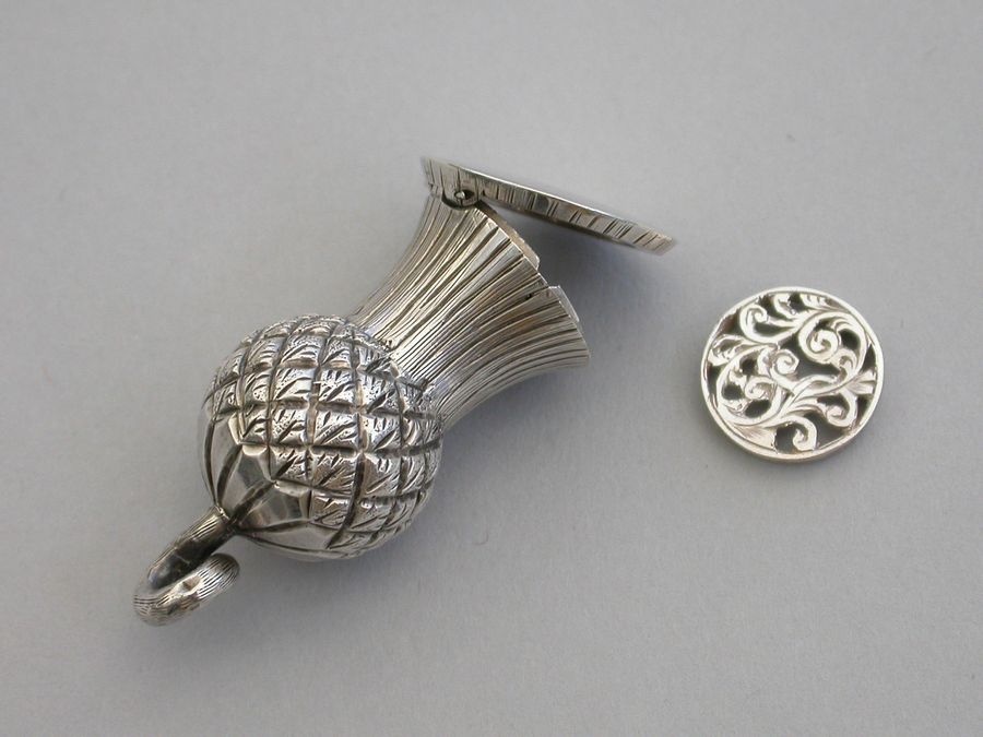 A small Victorian novelty silver Vinaigrette made in the form of a thistle, with a fine chased decoration and twisted stalk handle. The hinged lid opening to reveal a foliate scroll pierced lift-out grille.