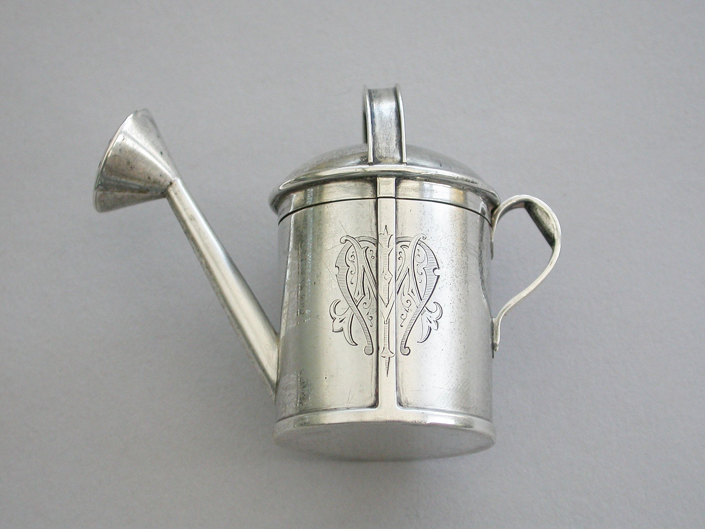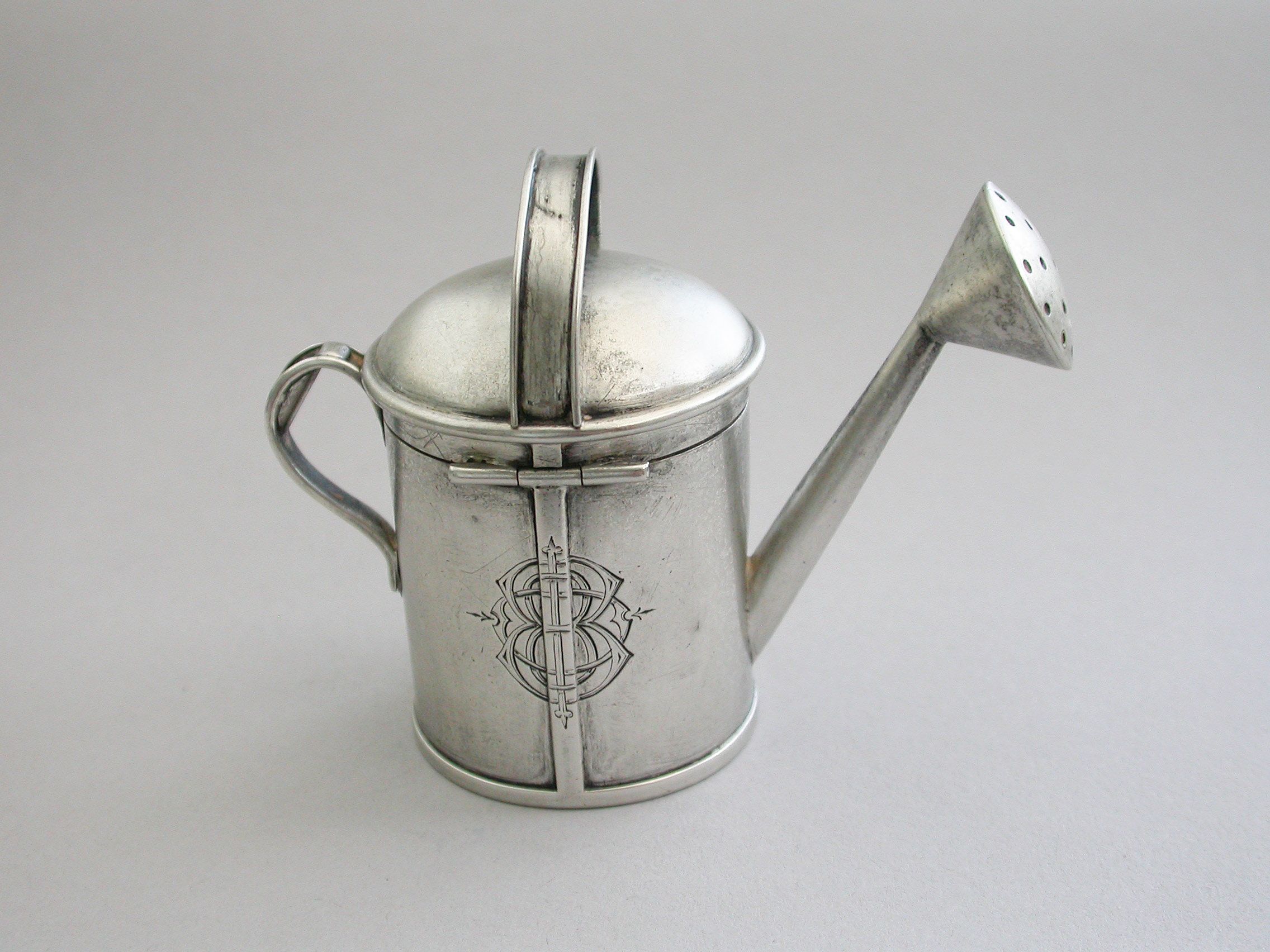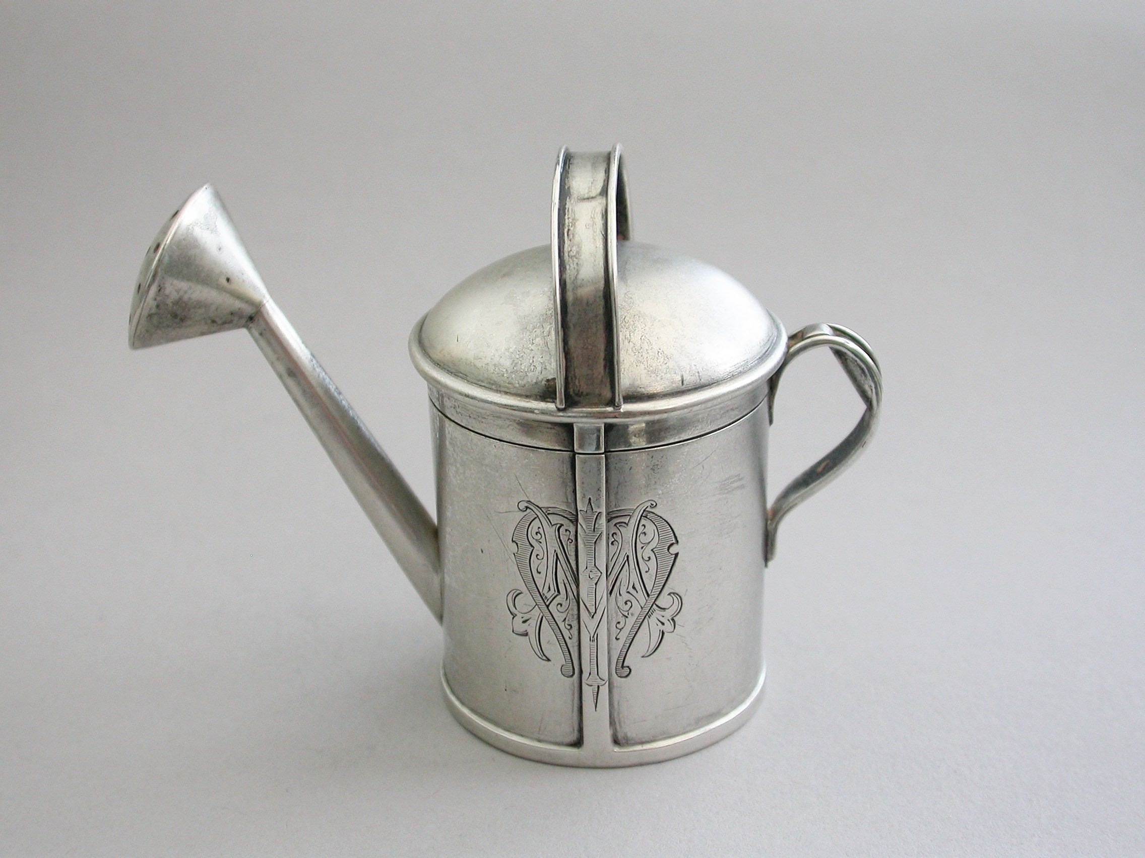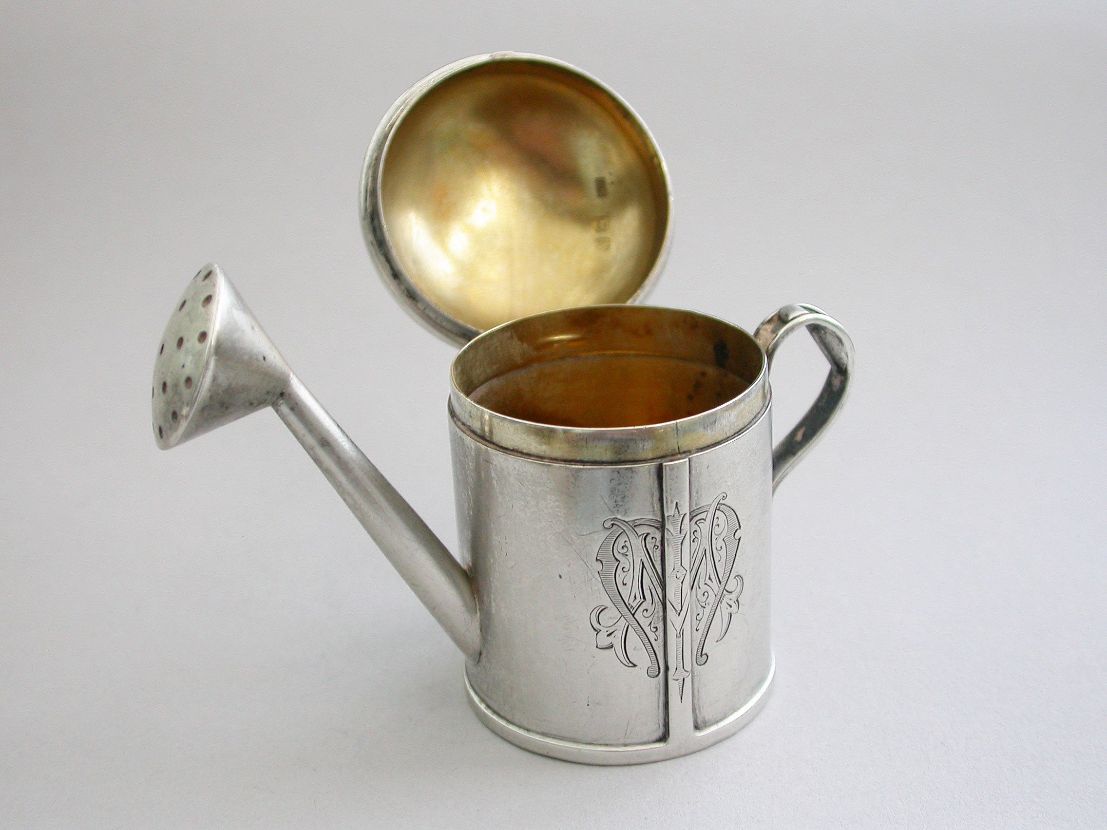 A good quality Victorian novelty silver Pepperette, made in the form of a watering can, with hinged lid and pierced rose to dispense the contents. Engraved on both sides with contemporary monograms, gilded interior.