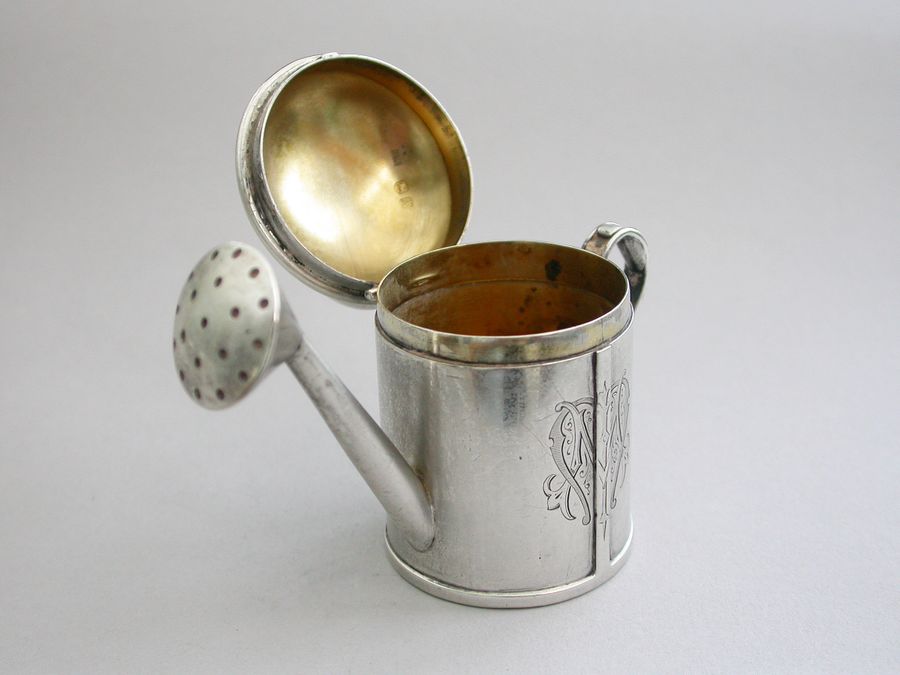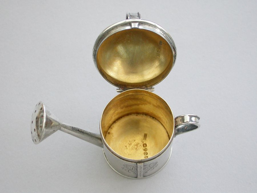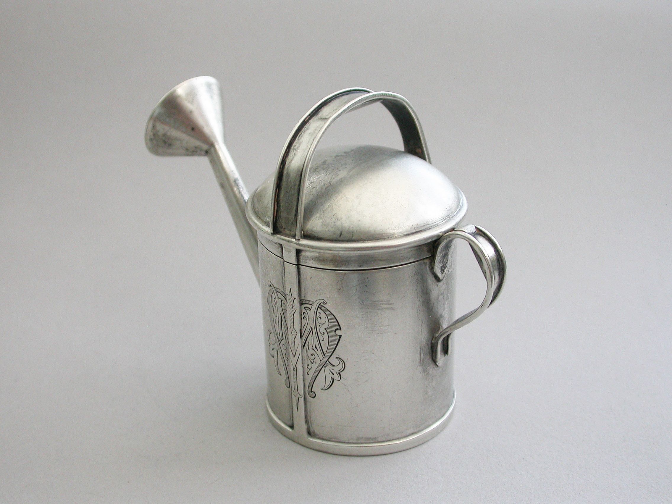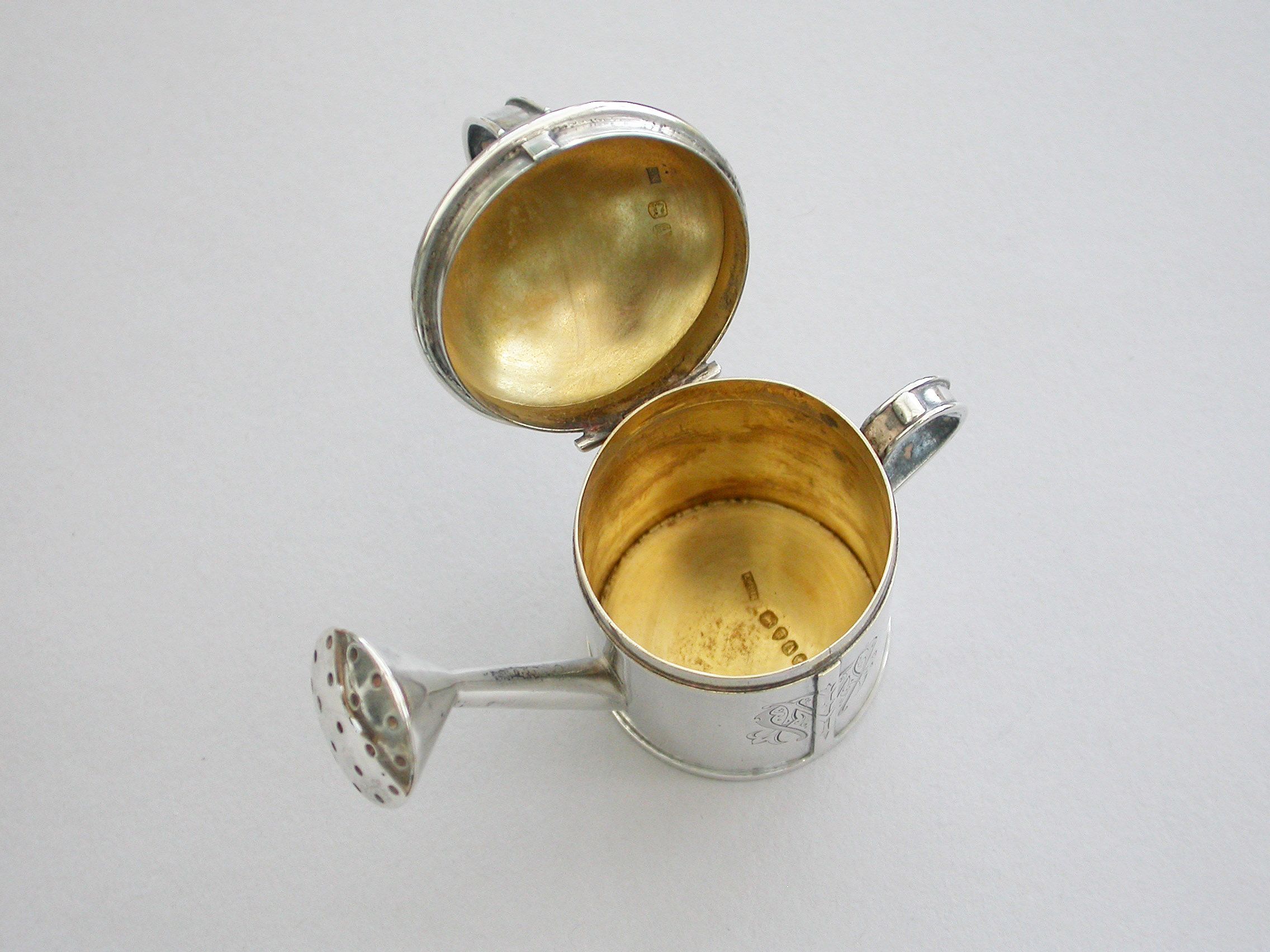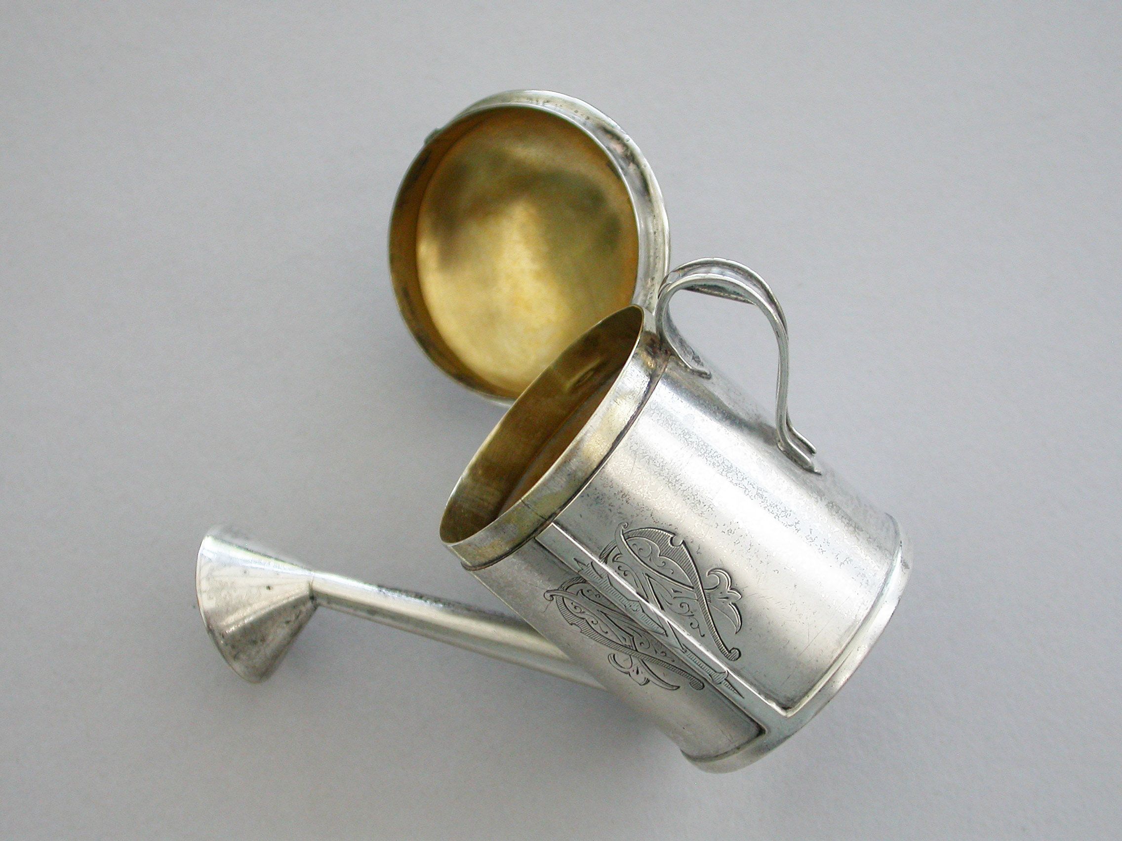 A good quality Victorian novelty silver Pepperette, made in the form of a watering can, with hinged lid and pierced rose to dispense the contents. Engraved on both sides with contemporary monograms, gilded interior.