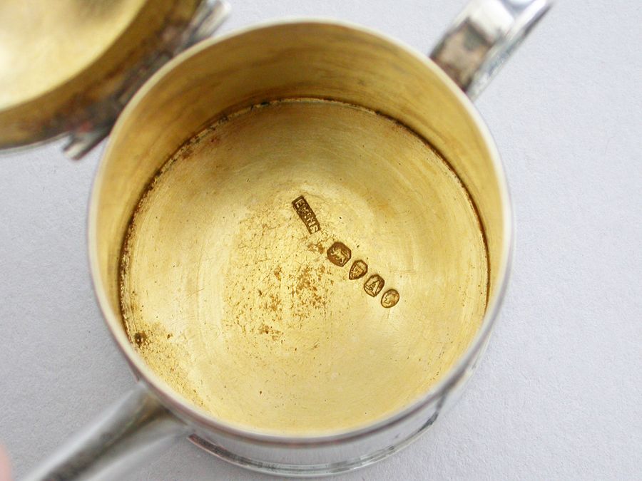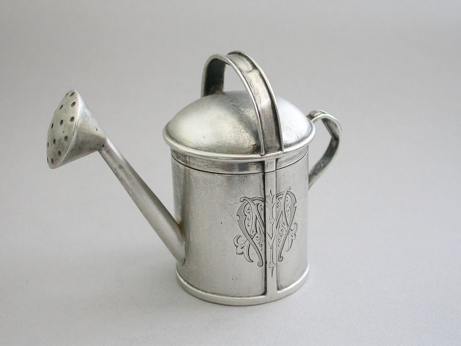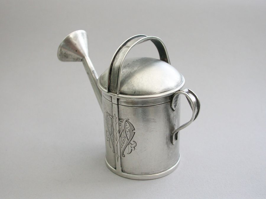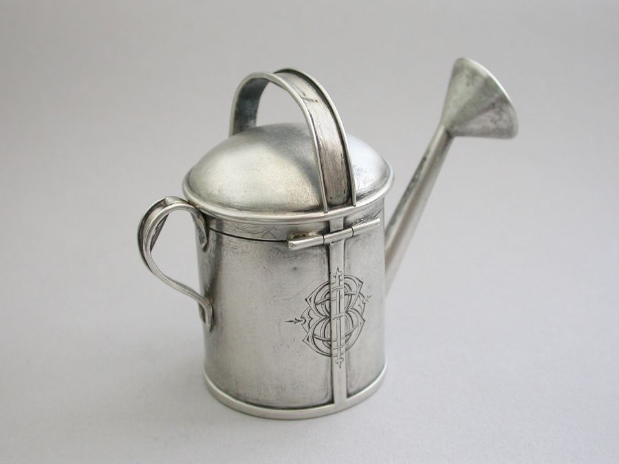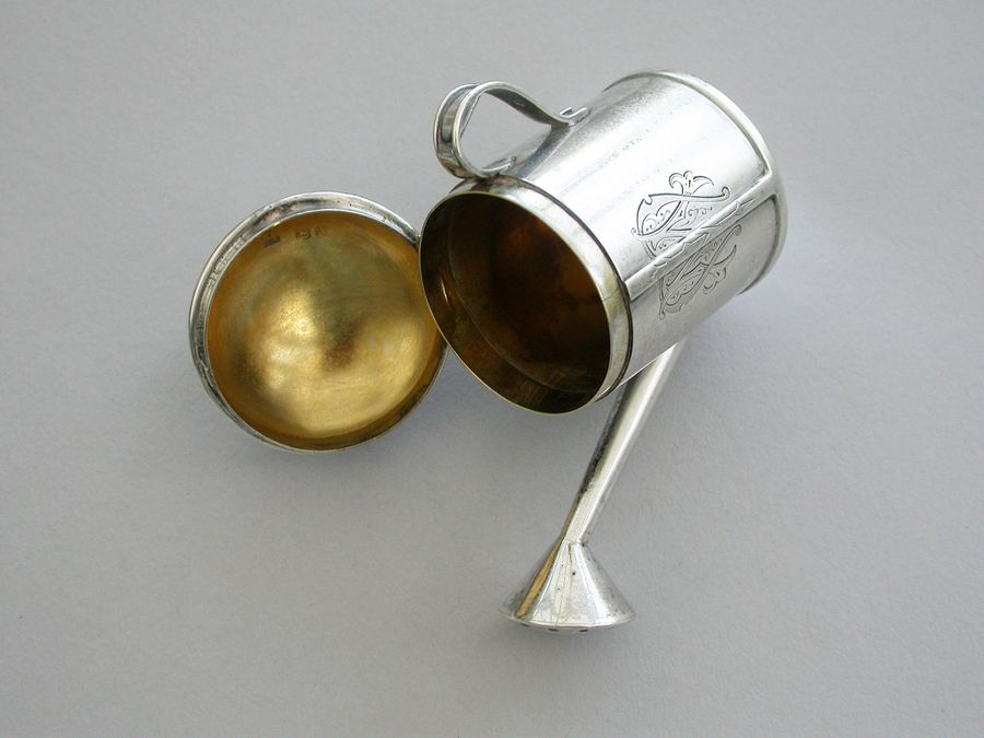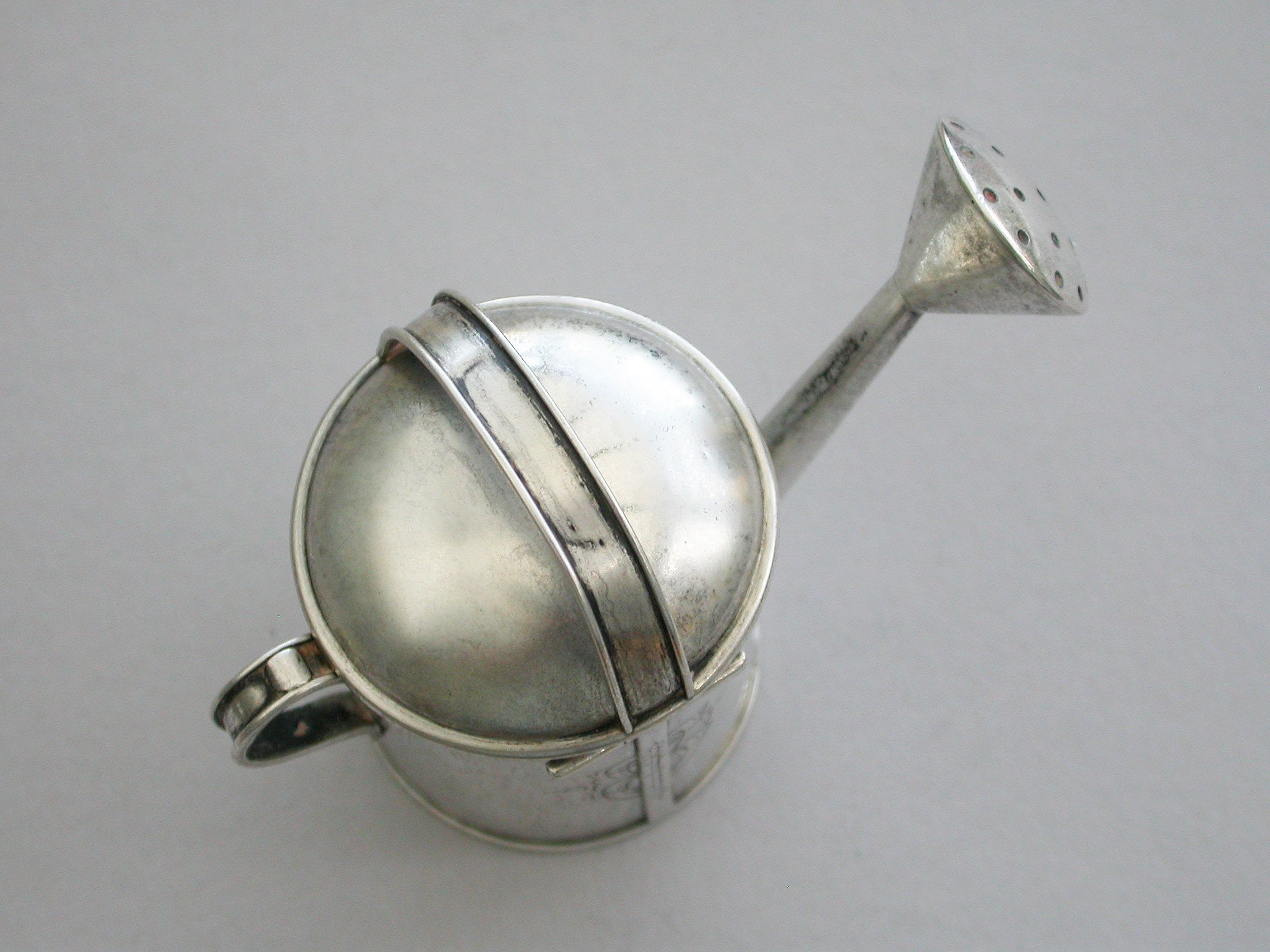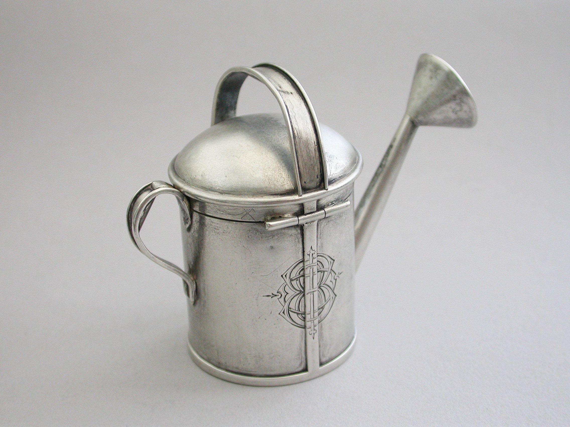 A good quality Victorian novelty silver Pepperette, made in the form of a watering can, with hinged lid and pierced rose to dispense the contents. Engraved on both sides with contemporary monograms, gilded interior.