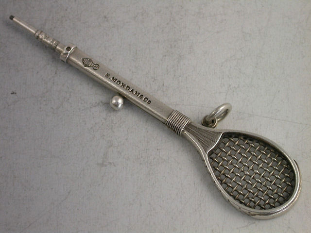 A rare Victorian Novelty silver Propelling Pencil in the form of a Tennis or Rackets Racket, with slide out pencil. Stamped - S.Mordan & Co and with Diamond Registration mark for 7th September 1878.