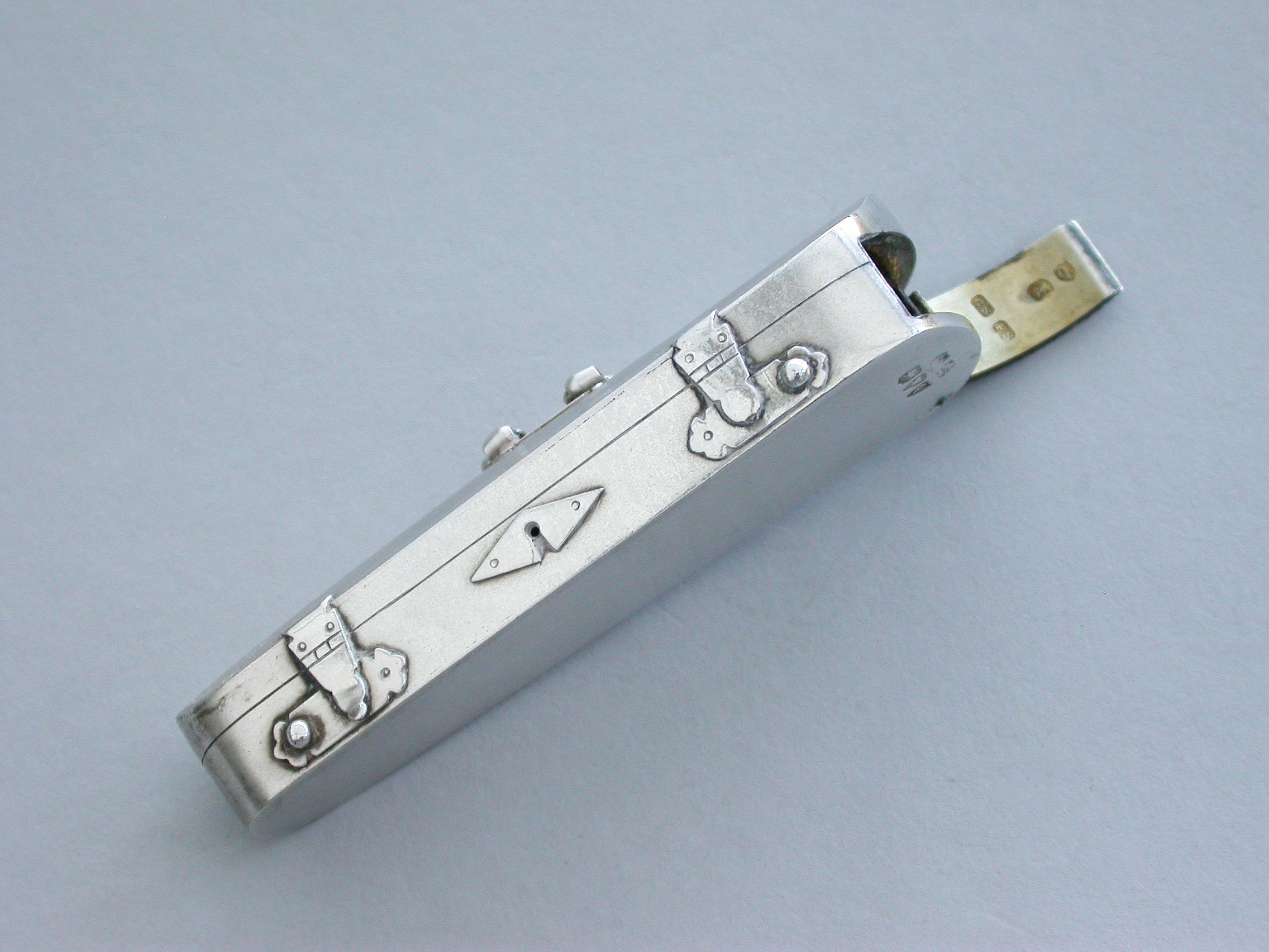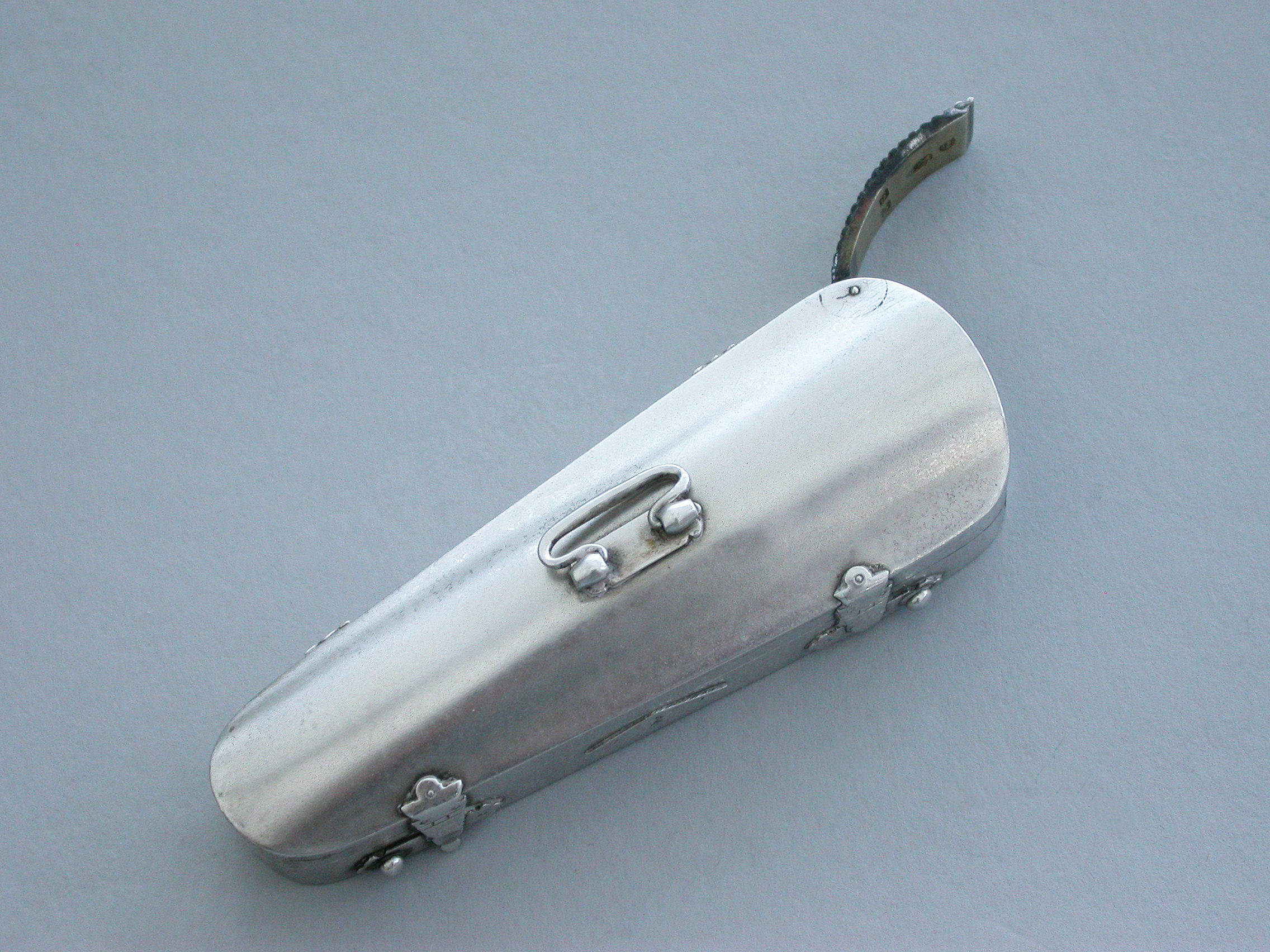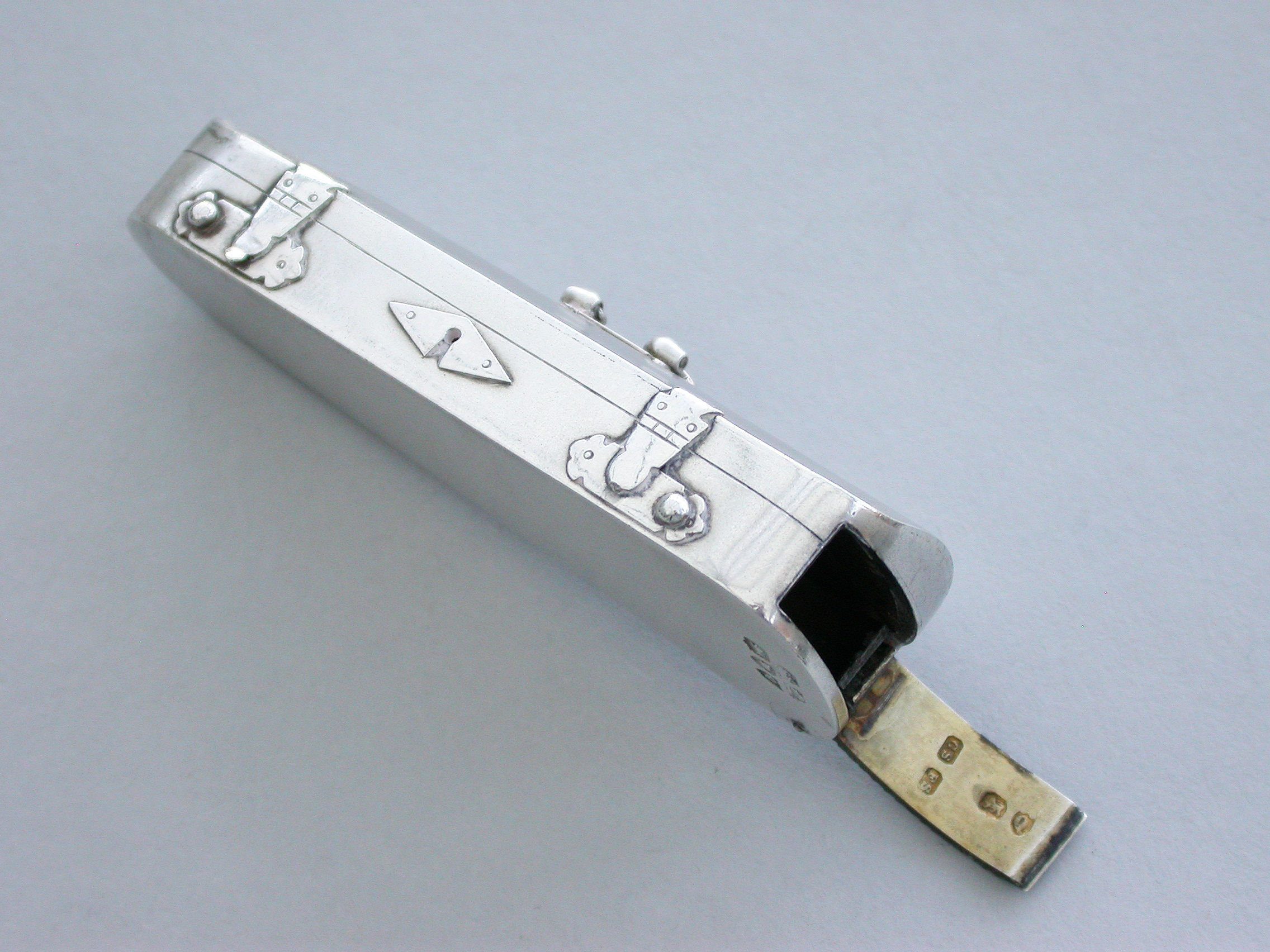 A rare and good quality Victorian novelty silver Vesta Case made in the form of a violin case with swing-handle. The striker hinging open to reveal a silver gilt interior.
