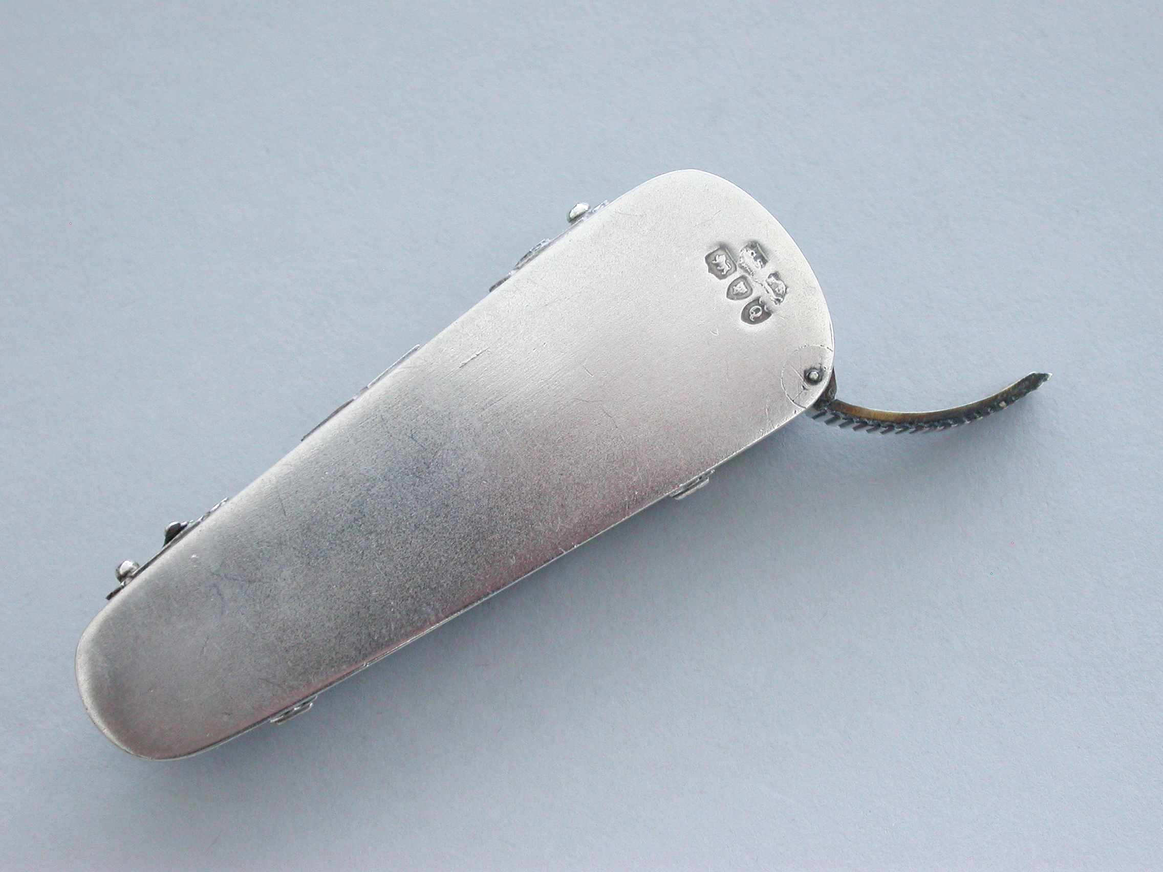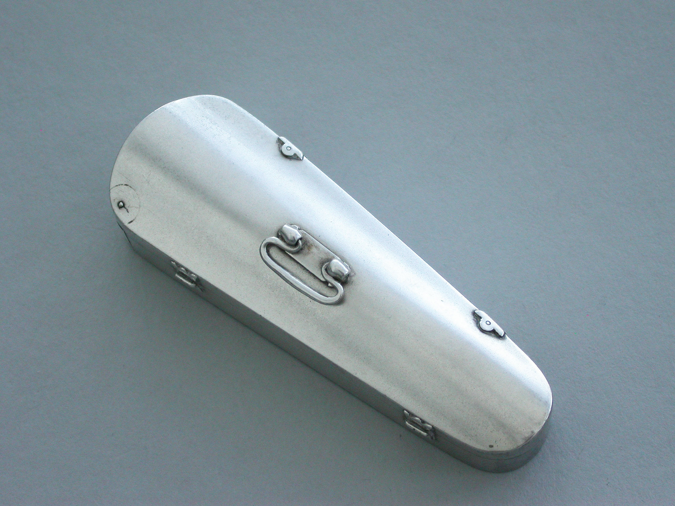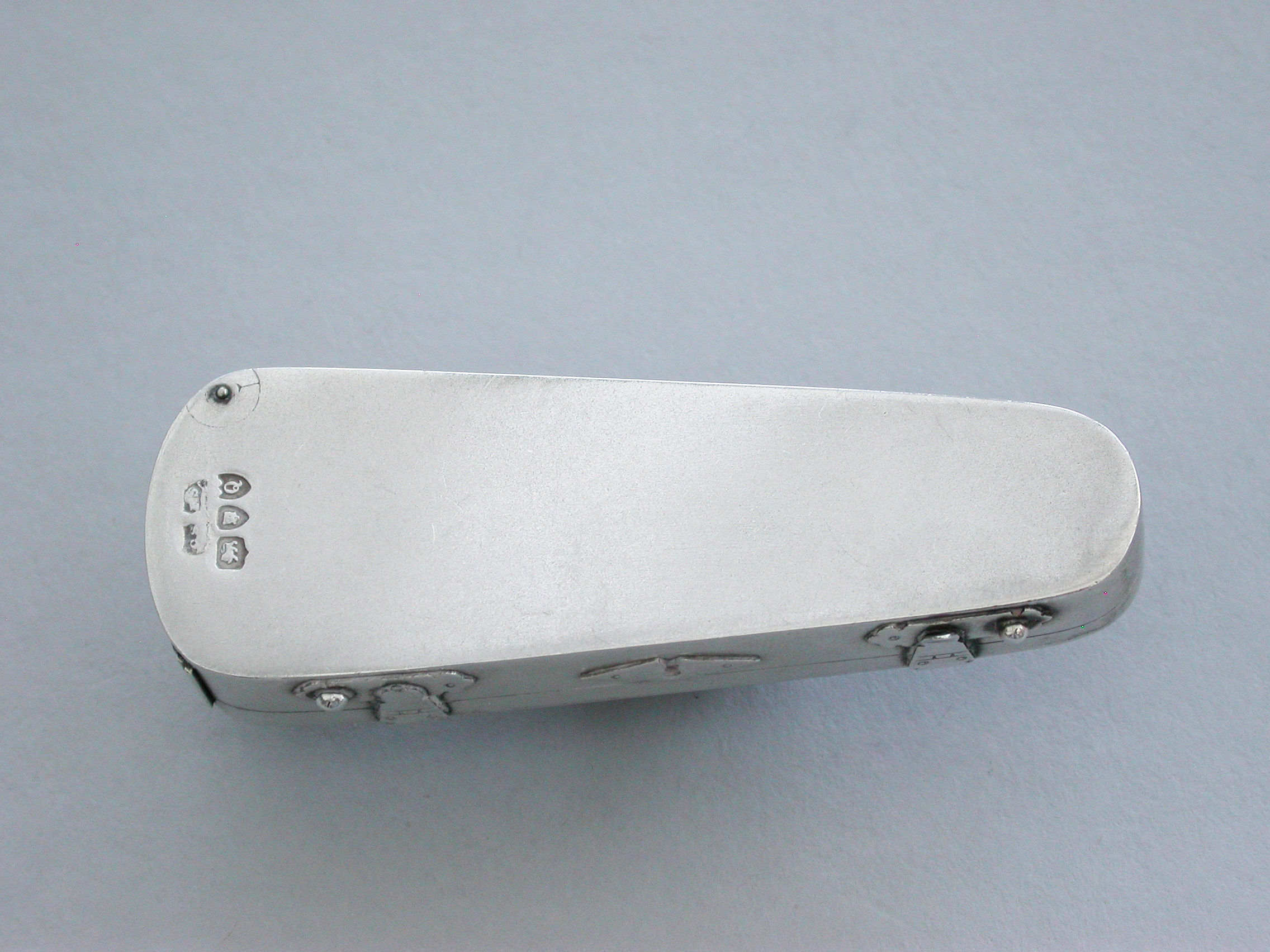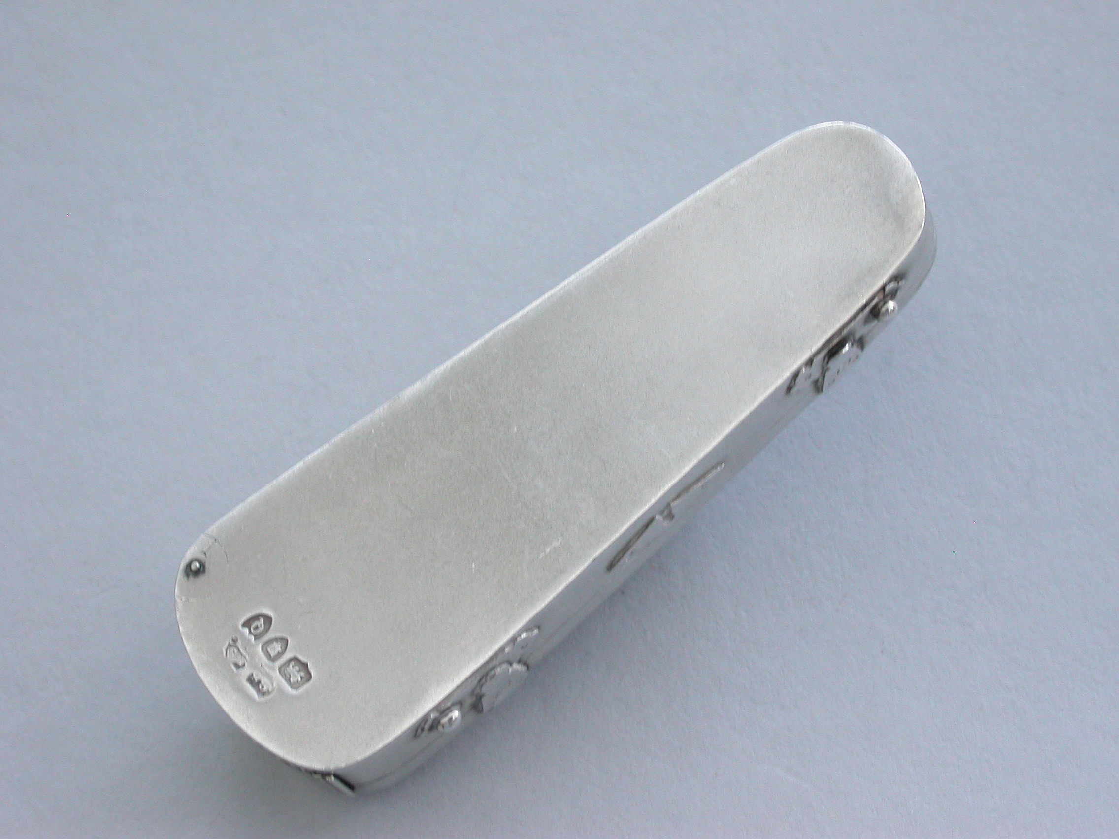 A rare and good quality Victorian novelty silver Vesta Case made in the form of a violin case with swing-handle. The striker hinging open to reveal a silver gilt interior.
