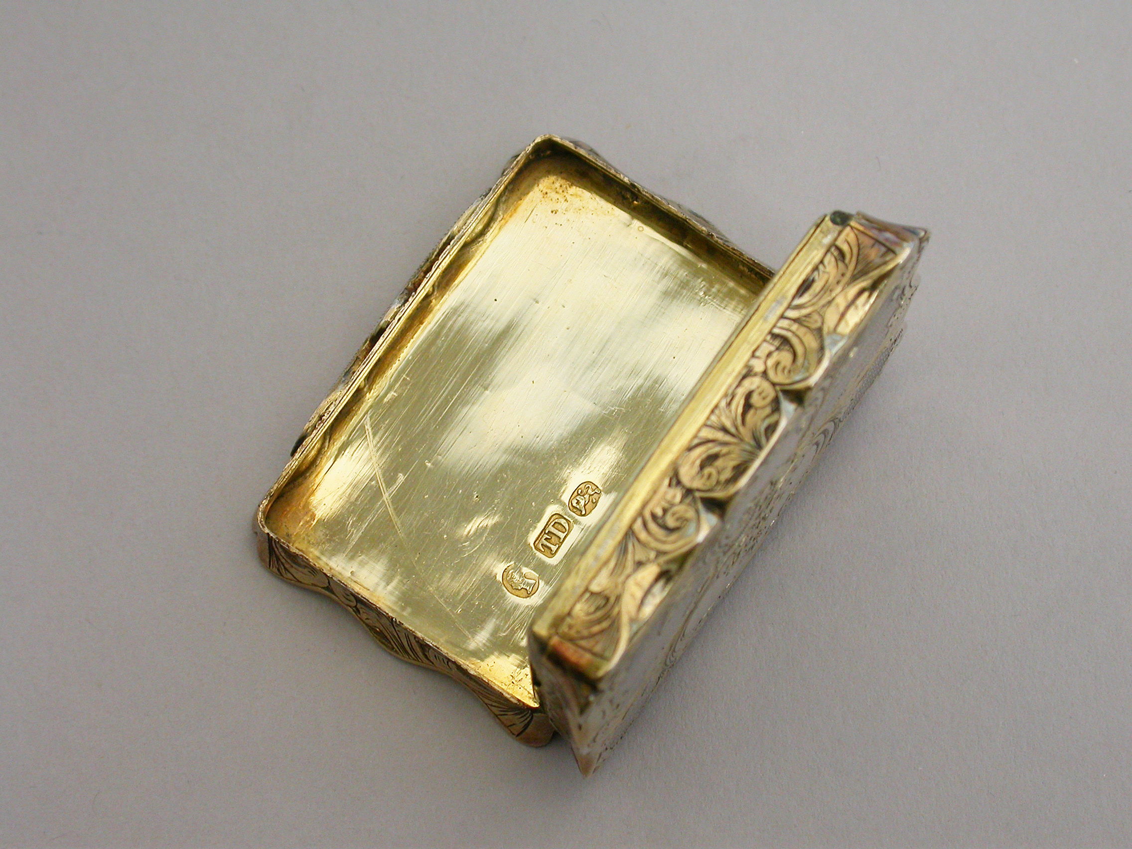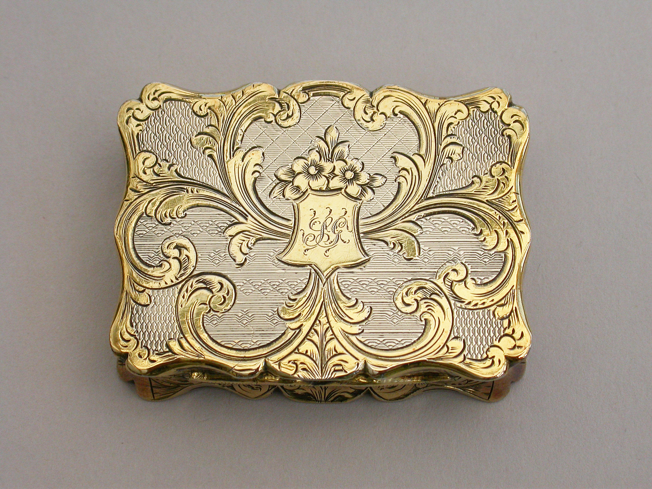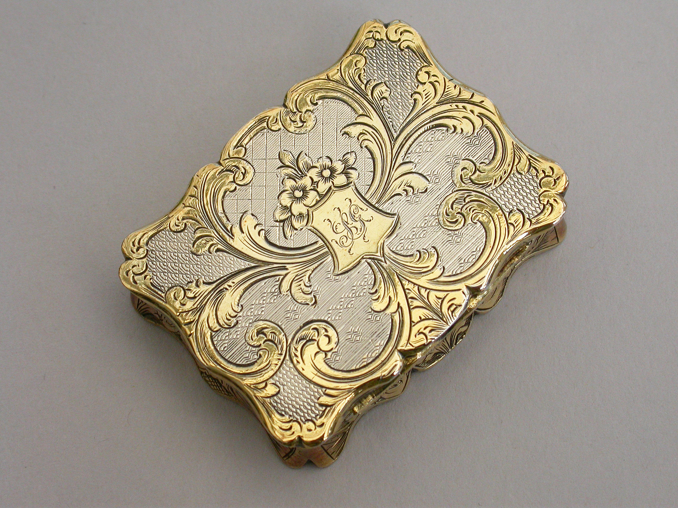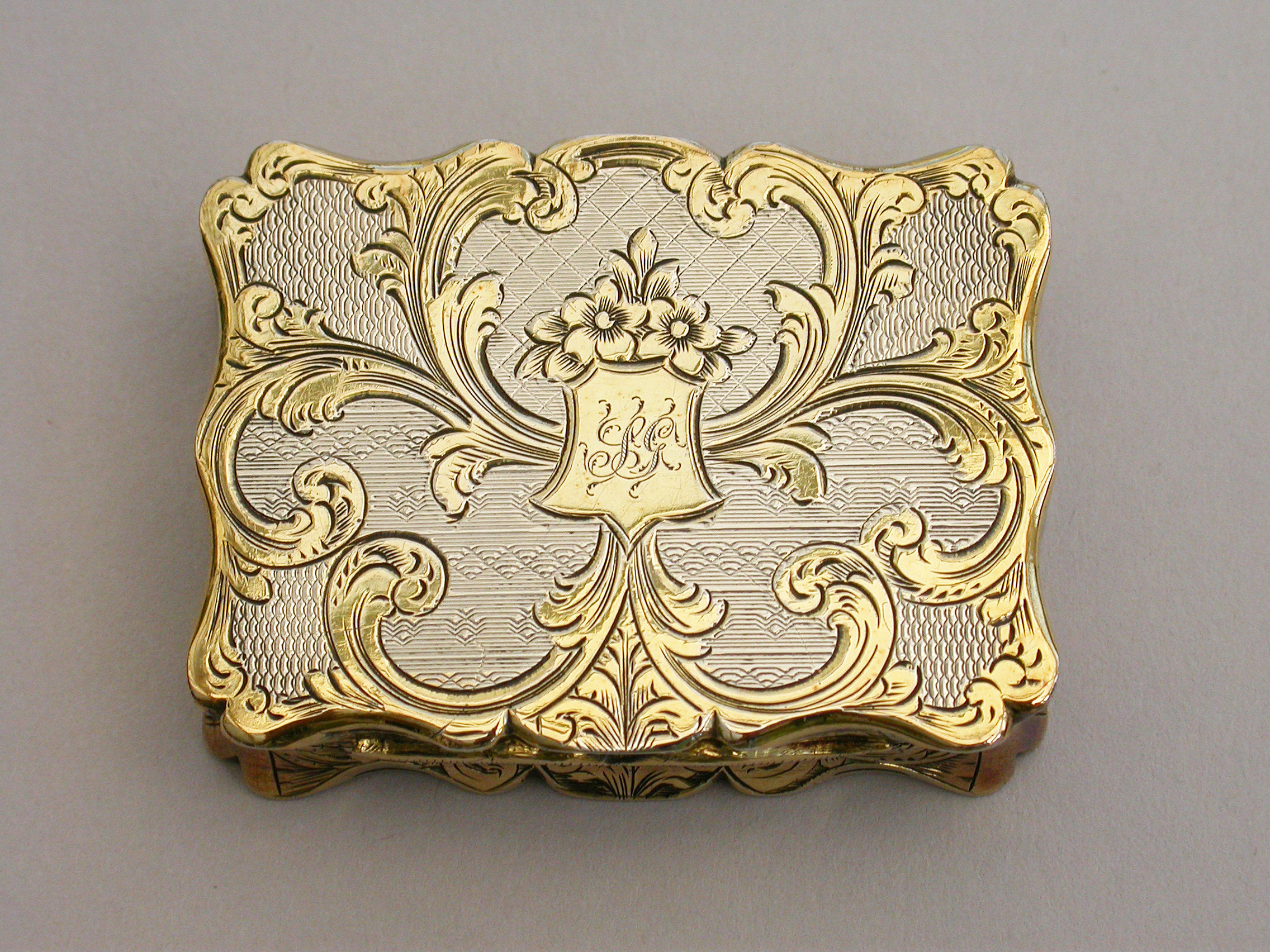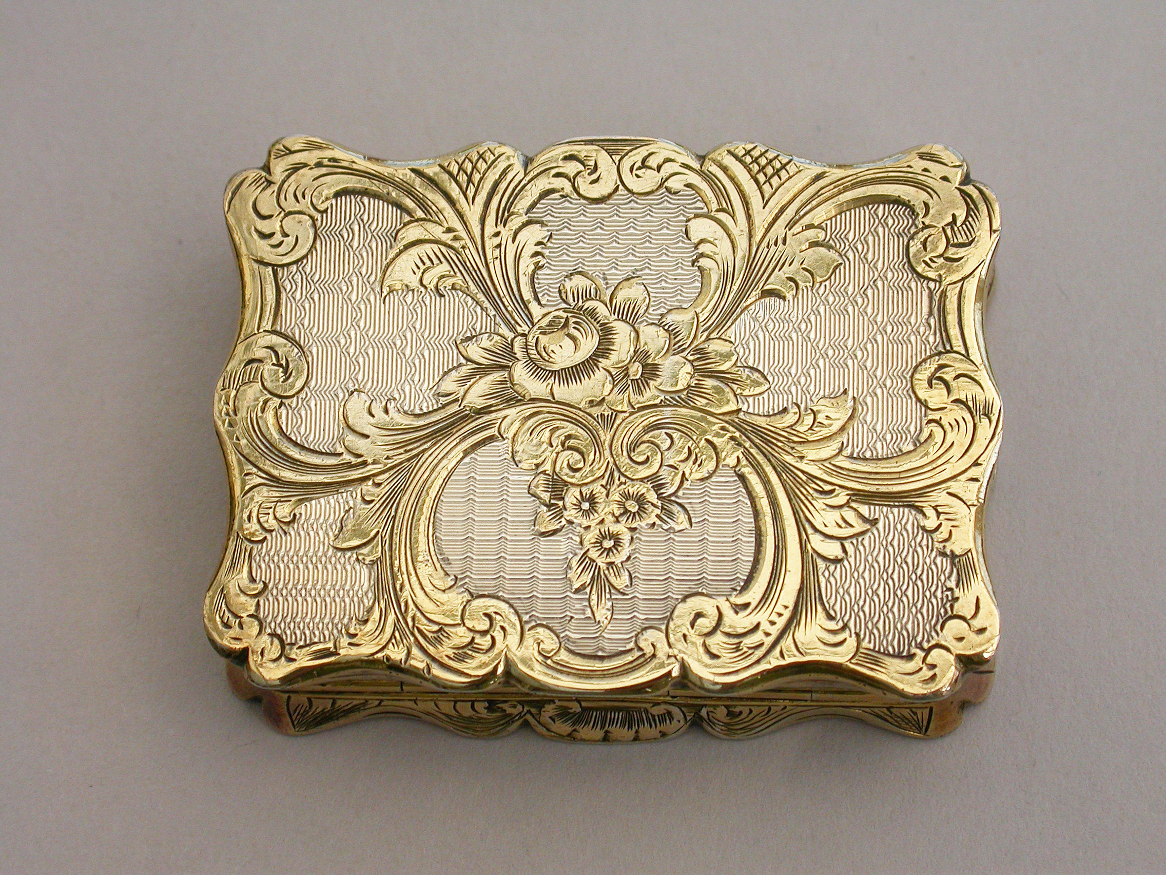 A very fine and large Victorian parcel-gilt silver Vinaigrette of shaped rectangular form with all over decoration of engine turned panes separated by gilt scrolls and flowers, a central shield shaped cartouche engraved with contemporary initials. The pierced silver gilt grille with flower heads and scrolls arising from base left.