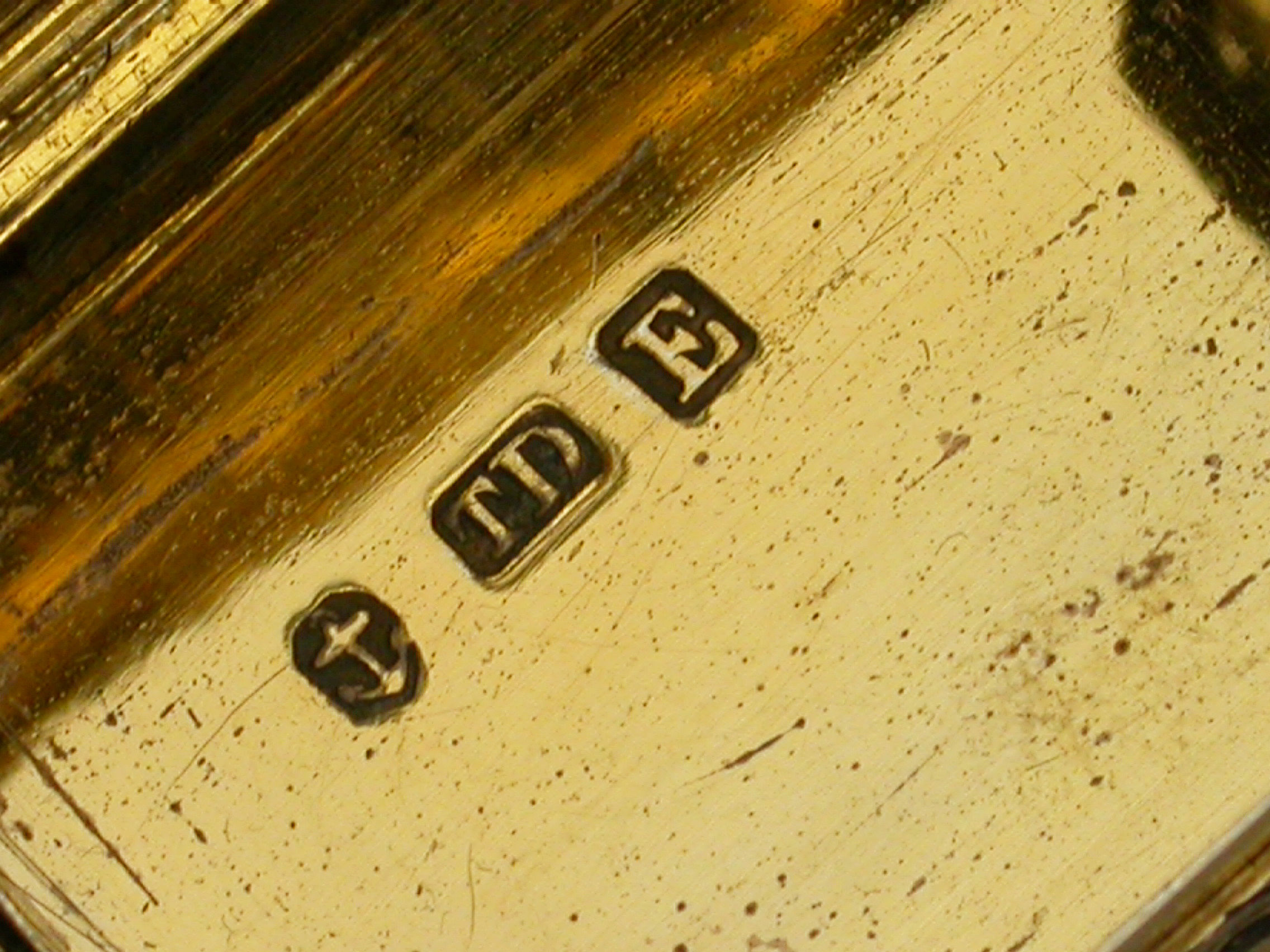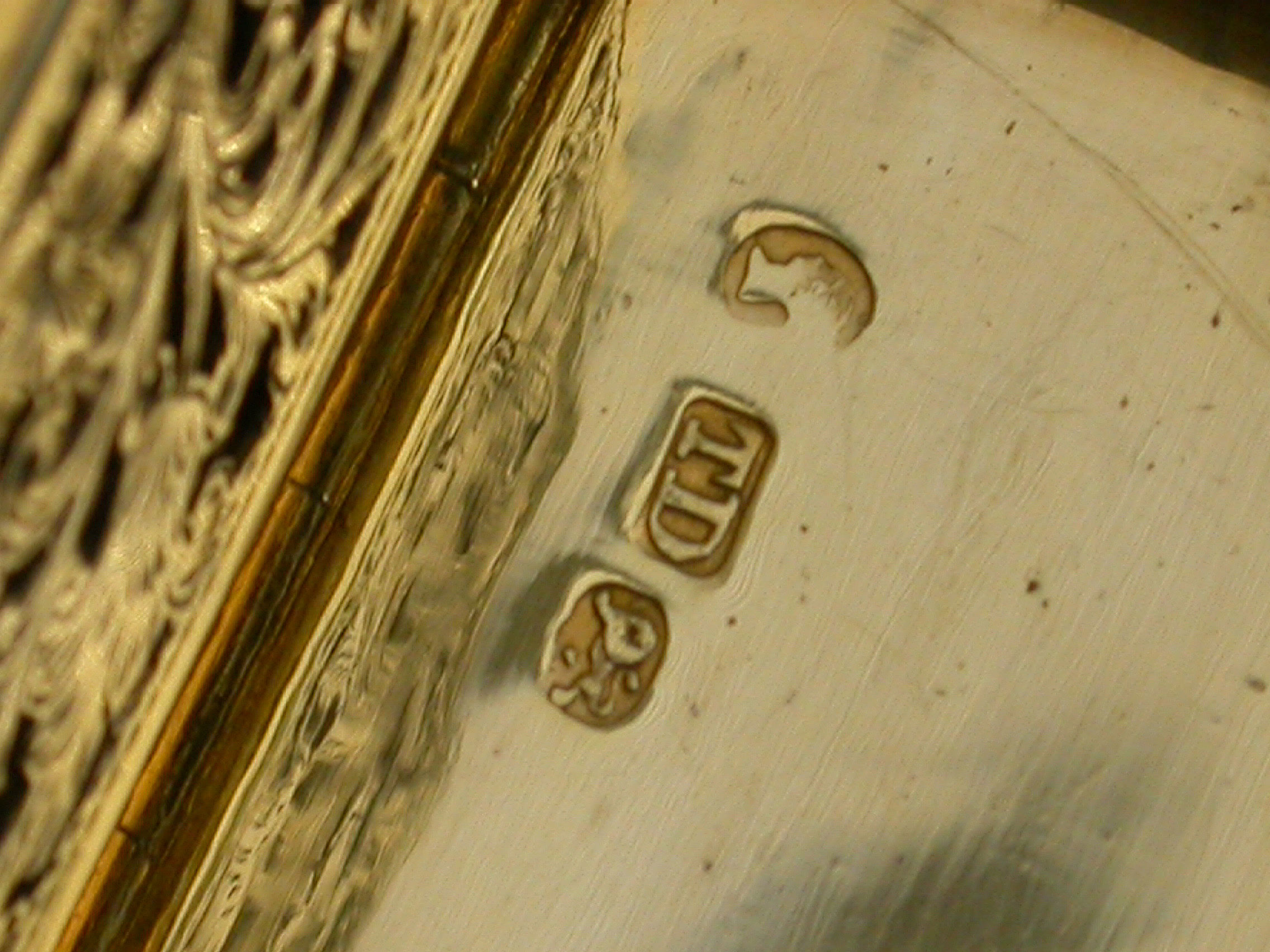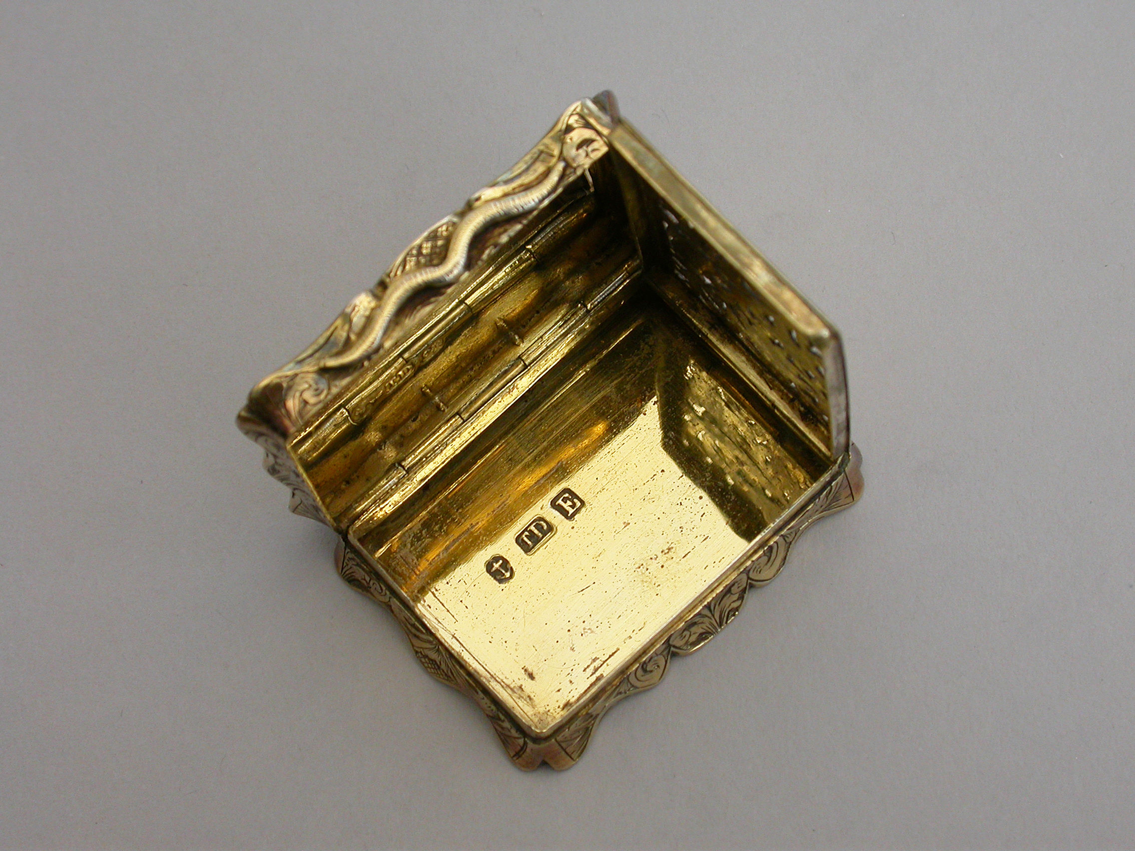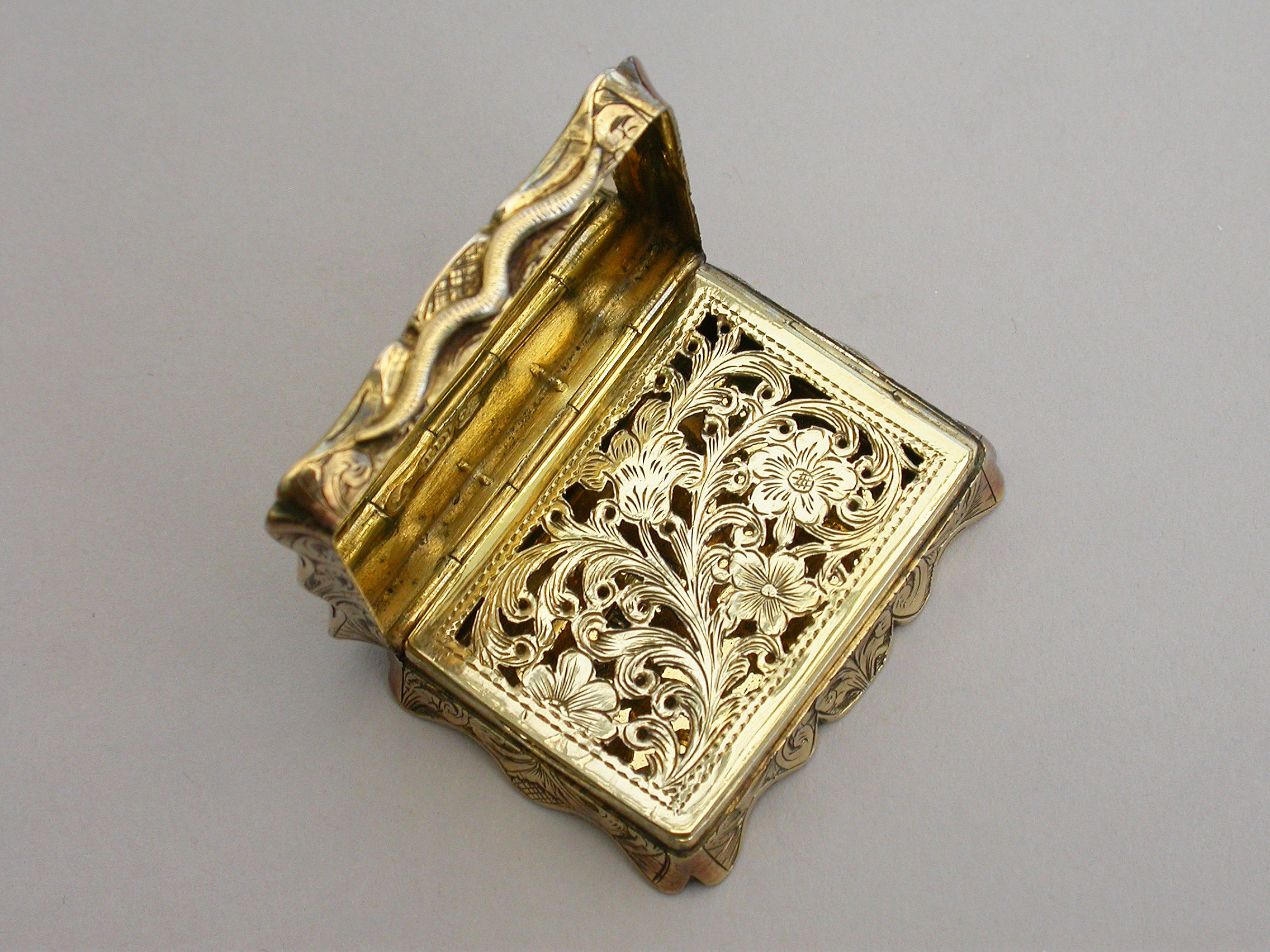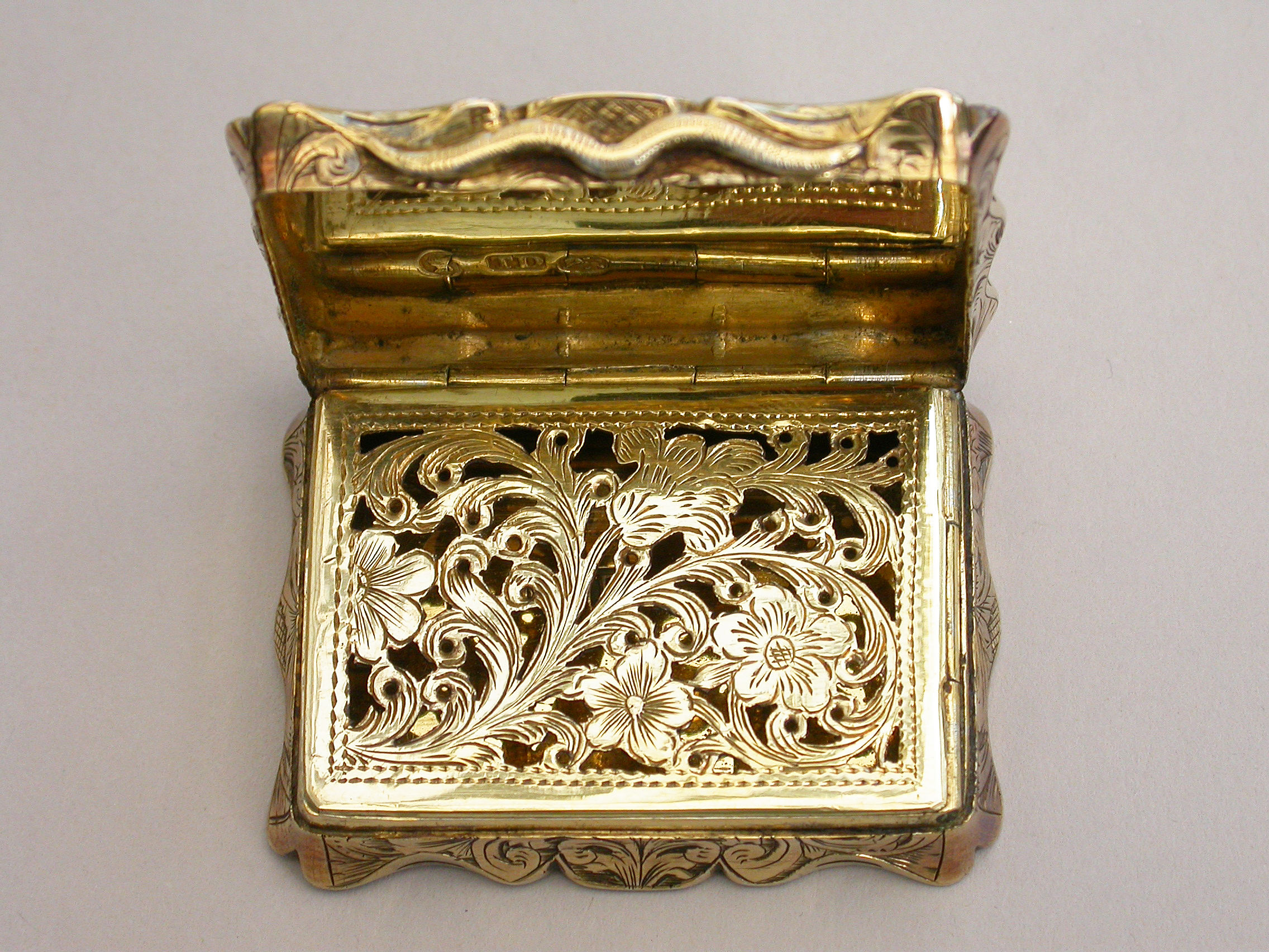 A very fine and large Victorian parcel-gilt silver Vinaigrette of shaped rectangular form with all over decoration of engine turned panes separated by gilt scrolls and flowers, a central shield shaped cartouche engraved with contemporary initials. The pierced silver gilt grille with flower heads and scrolls arising from base left.