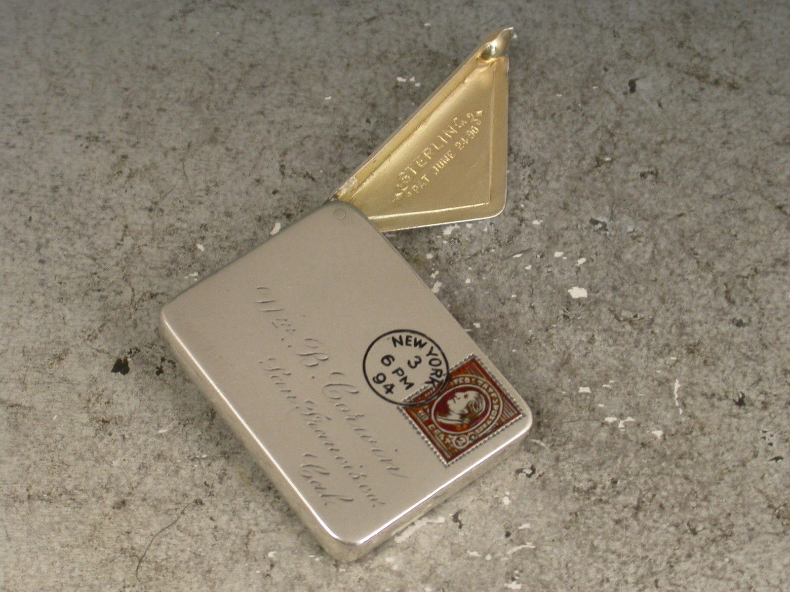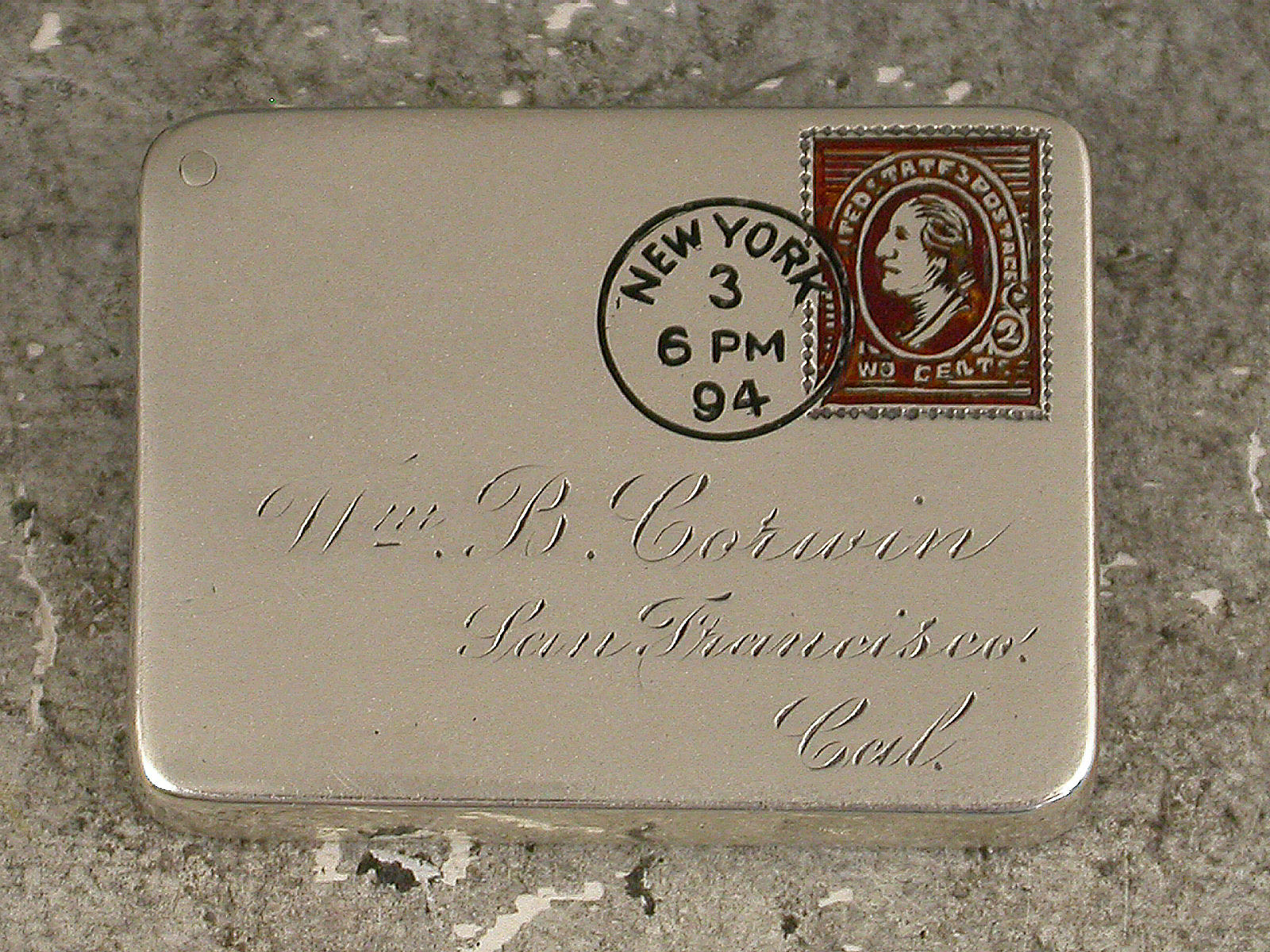A very fine late 19th century patented American sterling silver and enamel novelty Stamp Case made in the form of an Envelope. The front enamelled with a 2 cent stamp and a New York cancellation mark for 1894, the reverse enamelled with a received mark for 3.12.94, the cover engraved with a name and address for Miss B. Corwin, San Francisco, Cal. The silver gilt interior stamped: Sterling and the Patent mark for June 24 90.