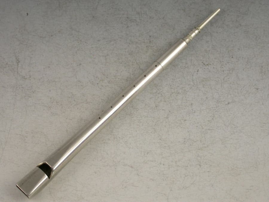 A rare Victorian novelty silver Propelling Pencil in the form of a Penny or Tin Whistle. Engraved with six dots to simulate the holes. Twist action to propel the pencil.
