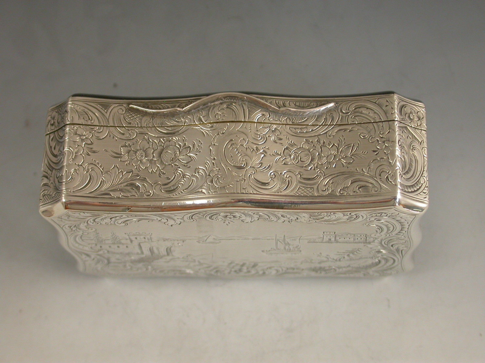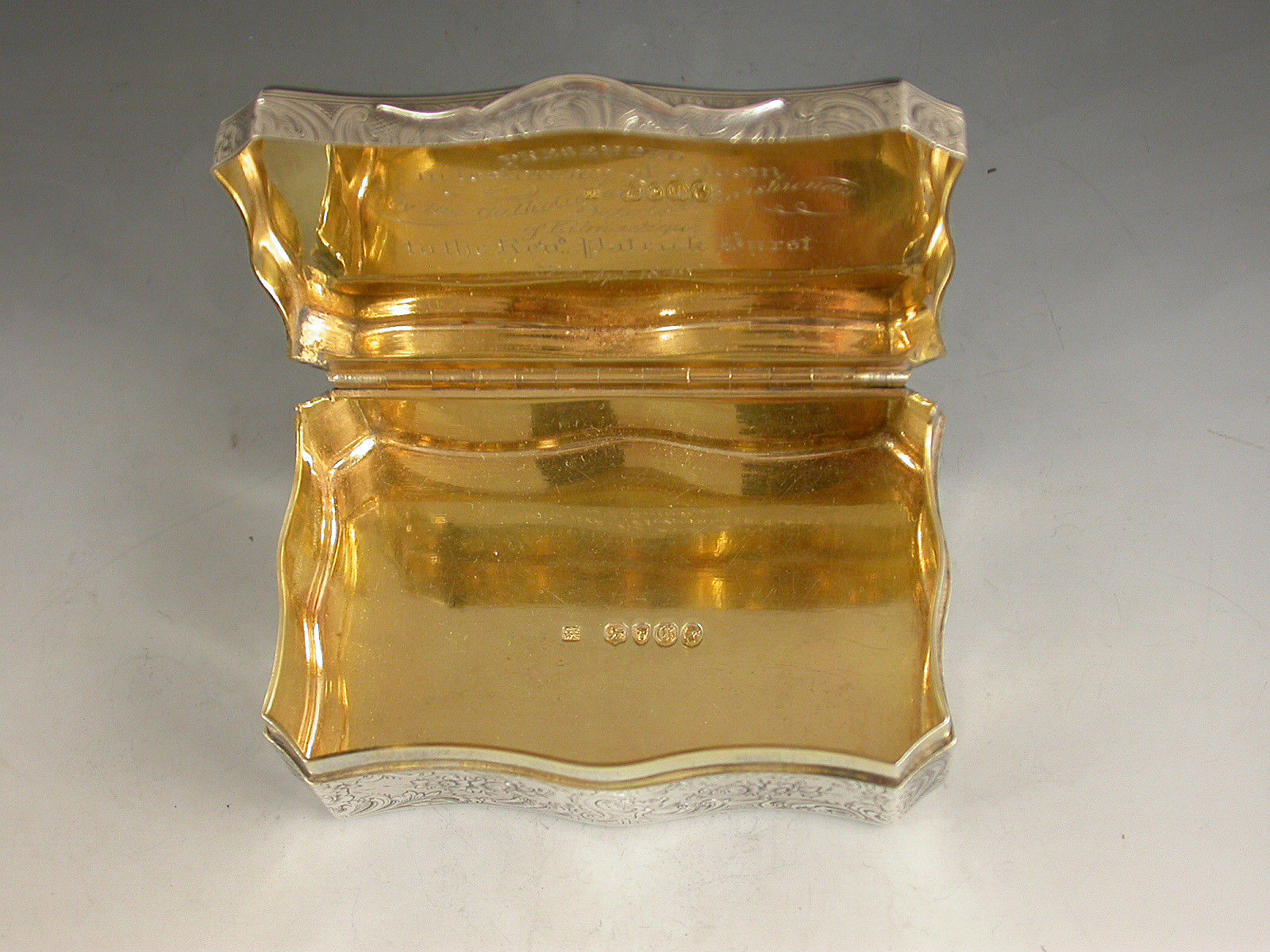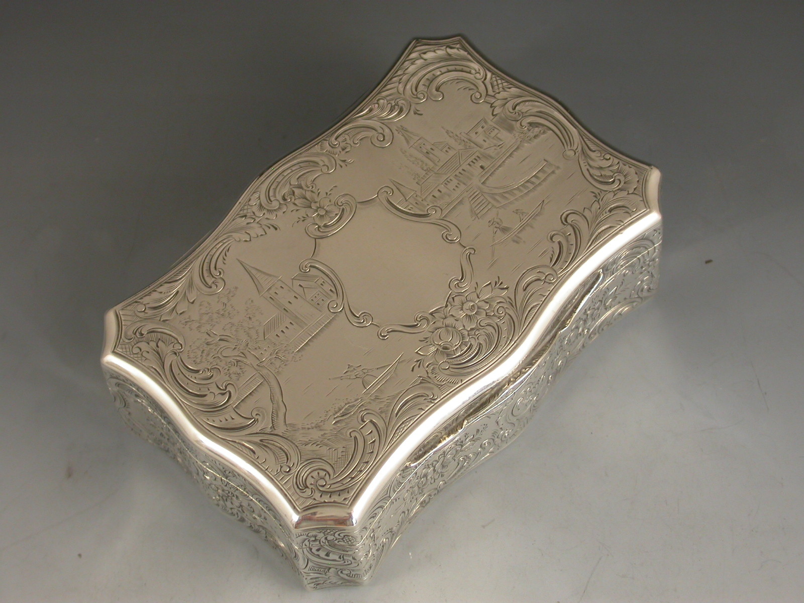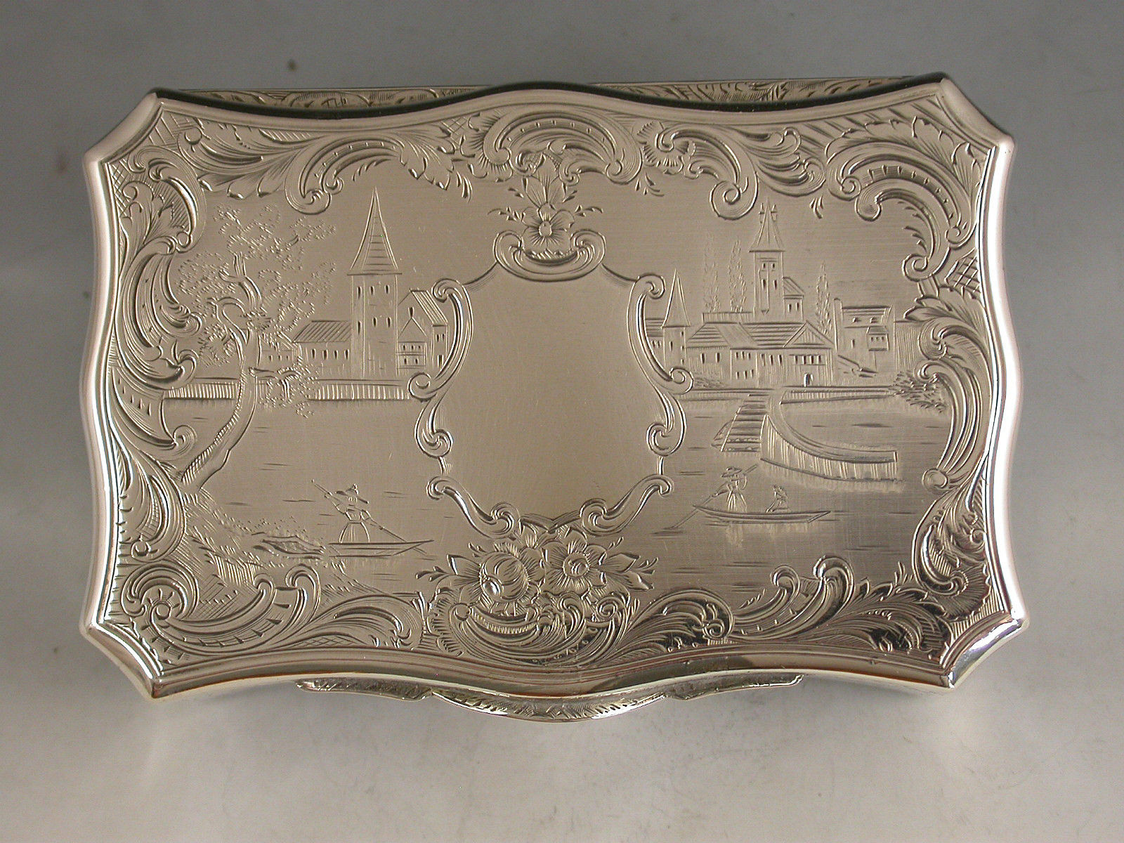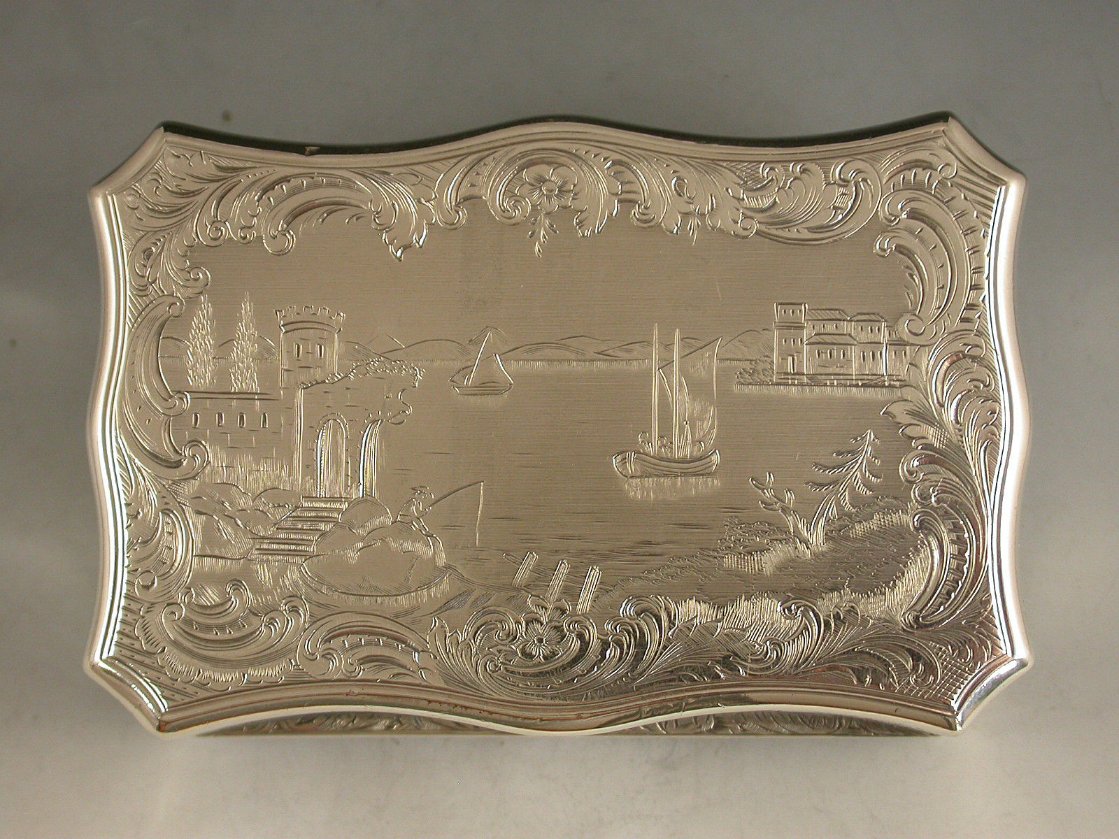 A fine quality Victorian silver Snuff Box of shaped rectangular form with re-entrant corners, serpentine sides engraved with foliate scroll decoration, the base engraved with a boating scene with a ruined castle in the foreground and other buildings and mountains in the background. The cover engraved with a similar scene depicting boats and buildings surrounding a vacant shield shaped cartouche. The silver gilt interior with presentation inscription to: The Reverend Patrick Hurst from The Parishioners of Kilmactigue (Kilmactigue is a Parish in County Sligo, Ireland).
