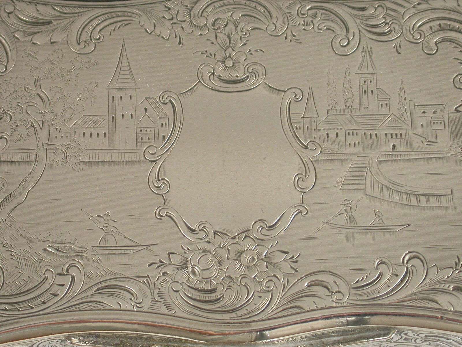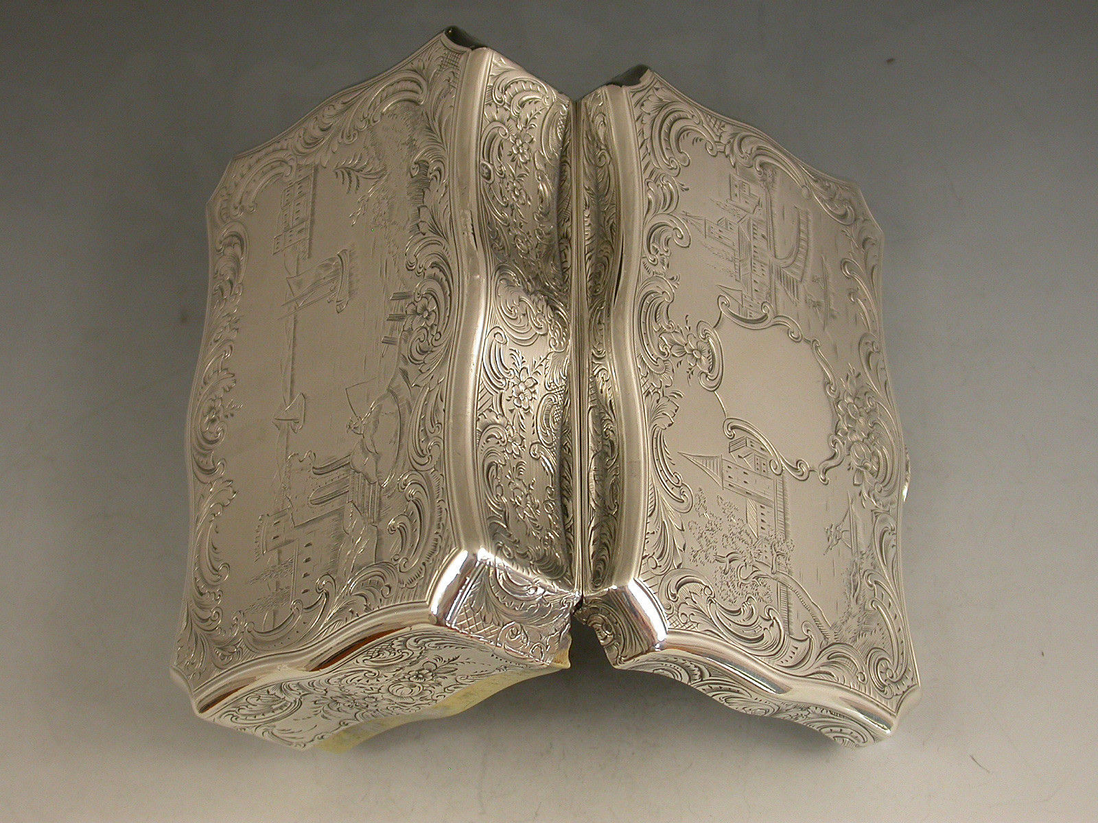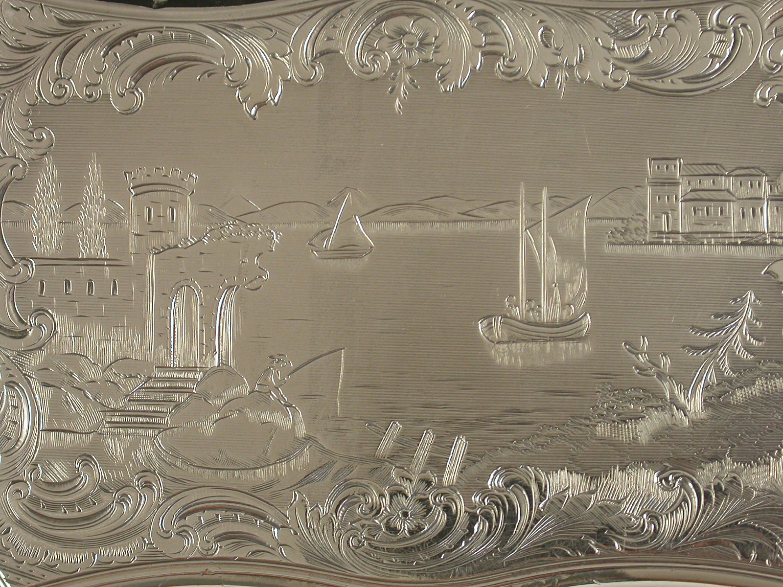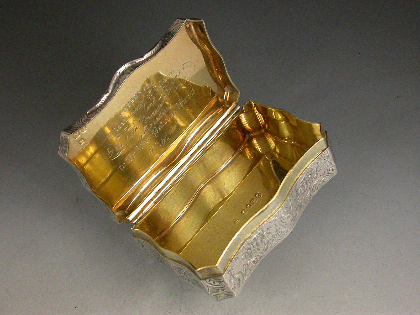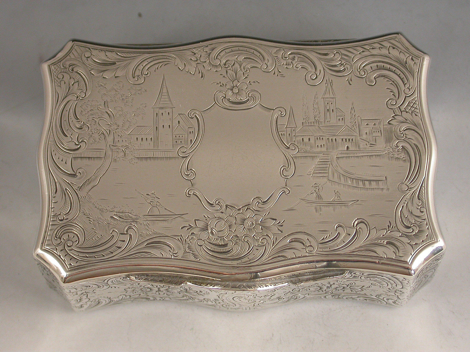 A fine quality Victorian silver Snuff Box of shaped rectangular form with re-entrant corners, serpentine sides engraved with foliate scroll decoration, the base engraved with a boating scene with a ruined castle in the foreground and other buildings and mountains in the background. The cover engraved with a similar scene depicting boats and buildings surrounding a vacant shield shaped cartouche. The silver gilt interior with presentation inscription to: The Reverend Patrick Hurst from The Parishioners of Kilmactigue (Kilmactigue is a Parish in County Sligo, Ireland).