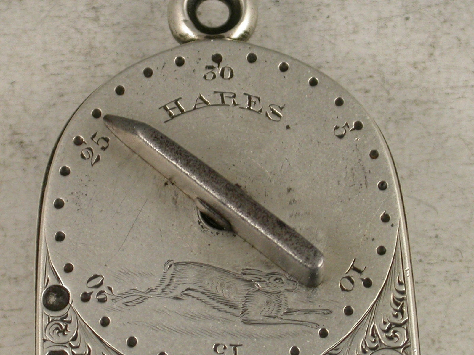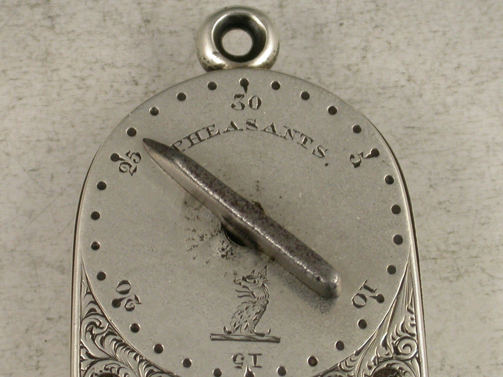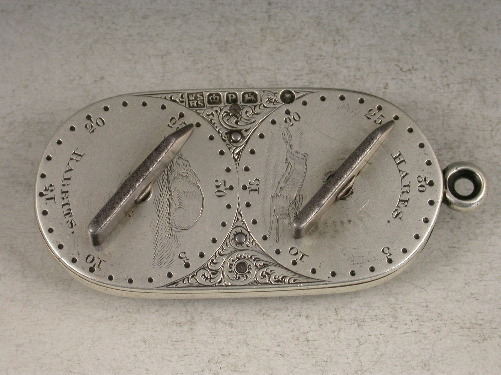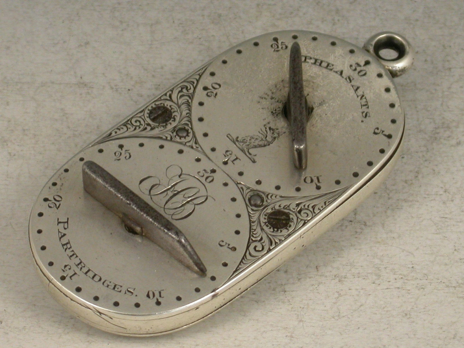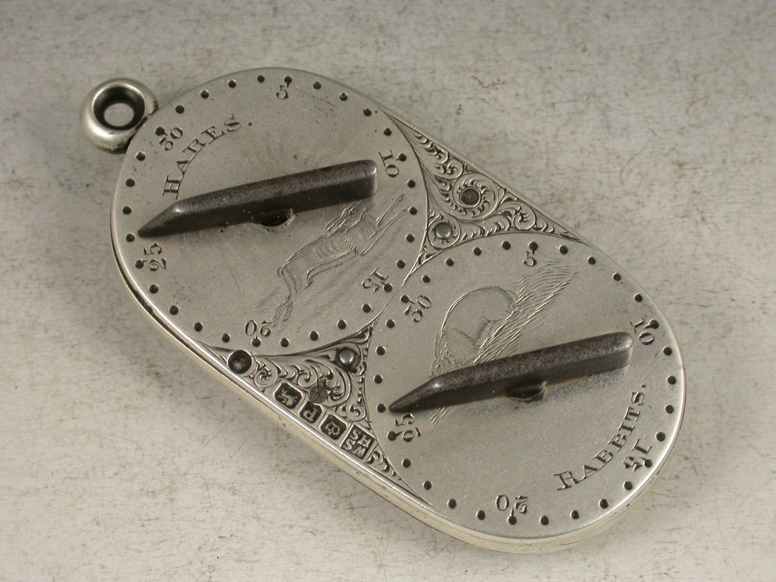 An exceptionally fine and rare Victorian Provincial silver 4 dial Game Counter, of rounded rectangular form, comprising four circular calibrated gauges numbered from 0-30 to reflect the numbers of game shot. Partridges and Pheasants on one face and Rabbits and Hares to the other. The dials are operated by rotating the steel pointers held by internal ratchet mechanisms. The Partridge face carries the initials of the original owner and the Pheasant face his crest. The Rabbit and Hare faces are engraved with images of the respective animals. Fine scroll engraving between the dials. The whole is of robust construction with attachment loop to one end.