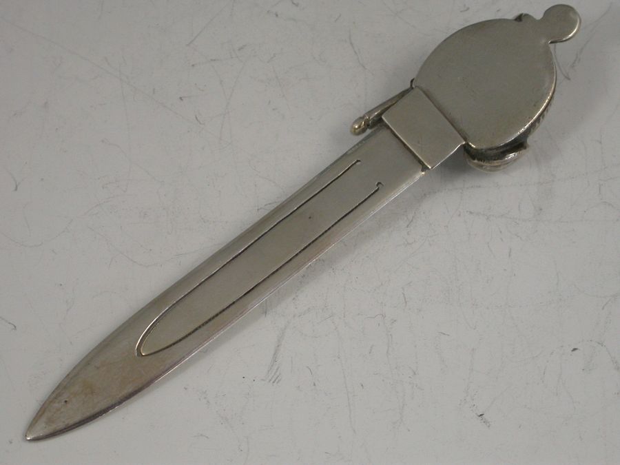 A good Victorian silver Bookmark formed as a Scottish Claymore Broadsword, the basket hilted handle set with coloured agate stones.