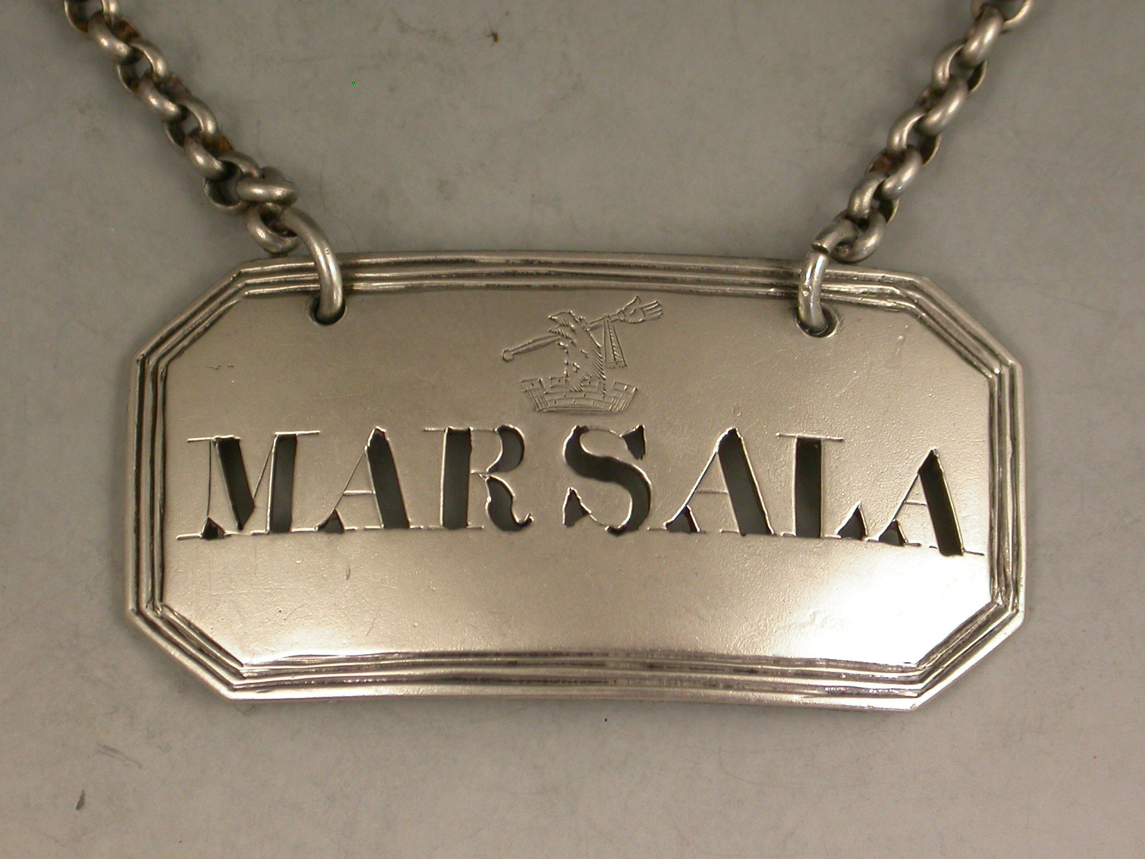 A Victorian Scottish silver Wine Label of cut-cornered rectangular form with triple reeded border, pierced for Marsala, engraved with a crest above the title.