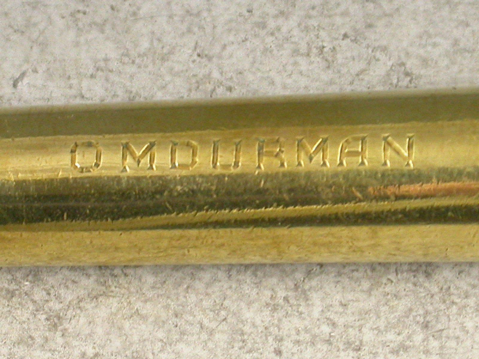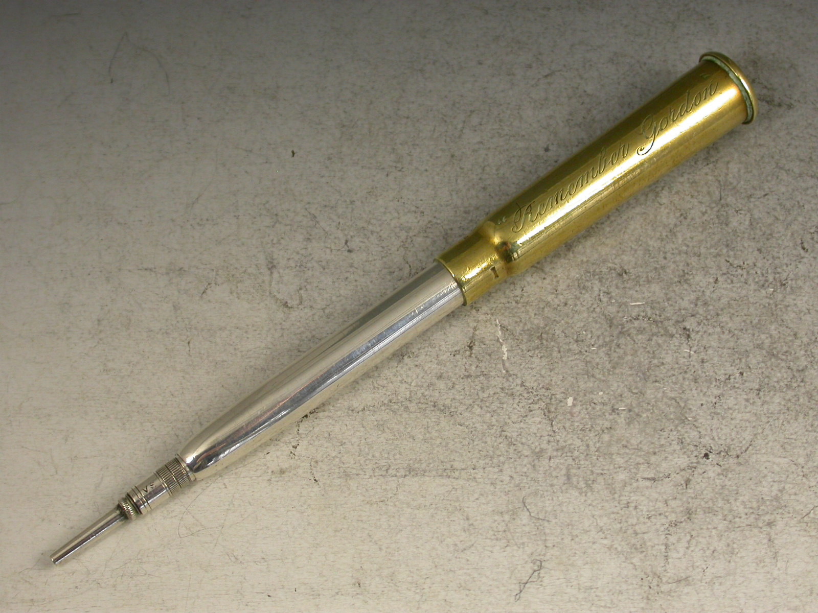 This pencil was made to commemorate the battle of Omdurman, fought in Sudan in 1898. It is made from a real .303 rifle cartridge, the headstamps are for a Woolwich-made Mark IV Ball cartridge, a hollow-point round introduced shortly before Omdurman and pulled from service not long thereafter.