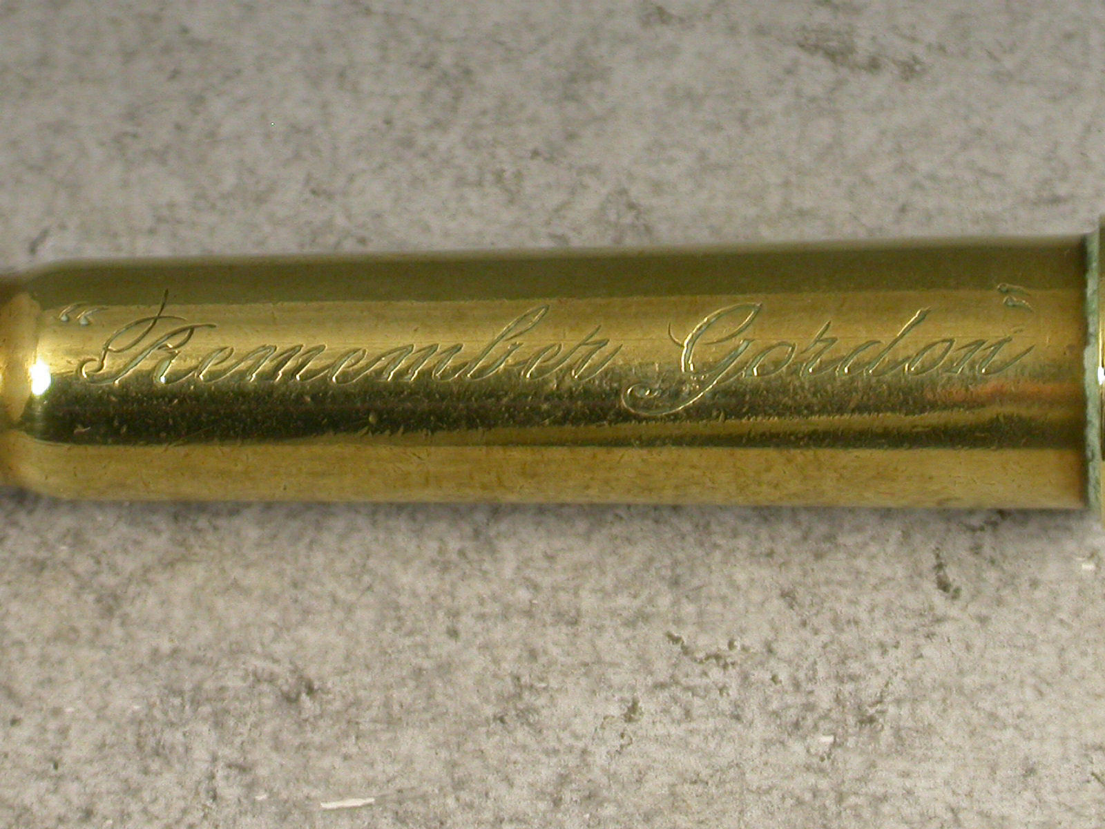One side of the brass cartridge is engraved ""OMDURMAN"". The other bears the slogan, ""Remember Gordon"".