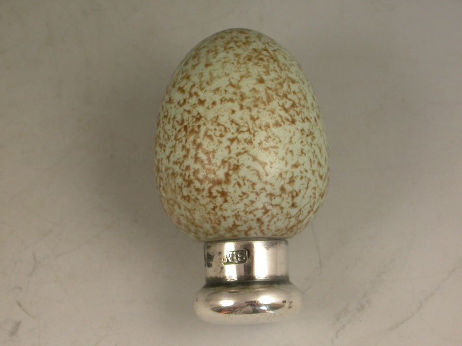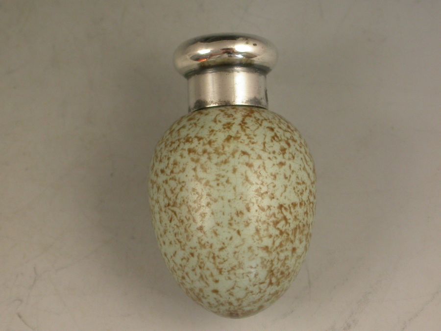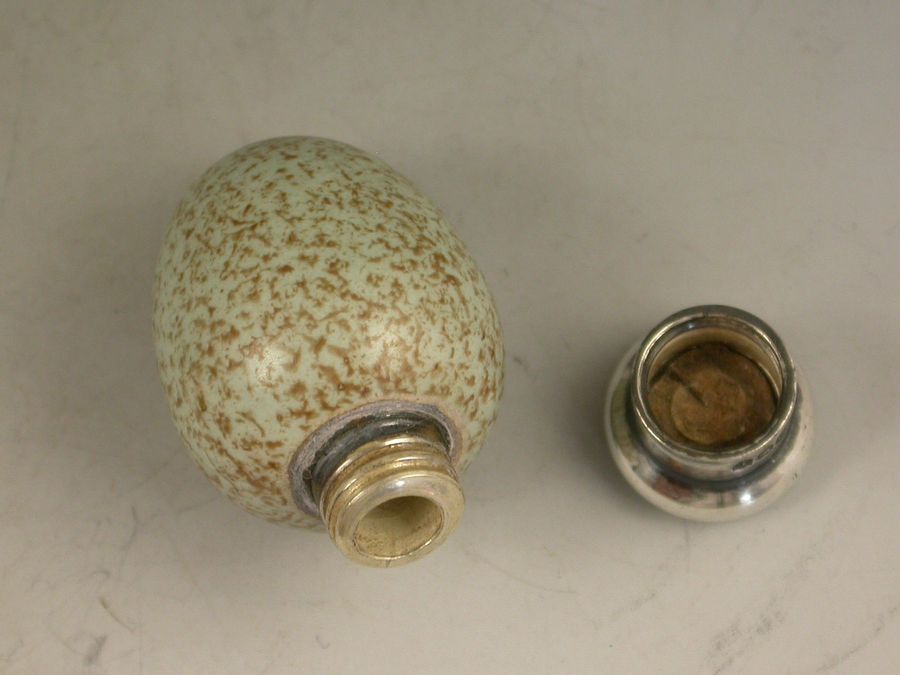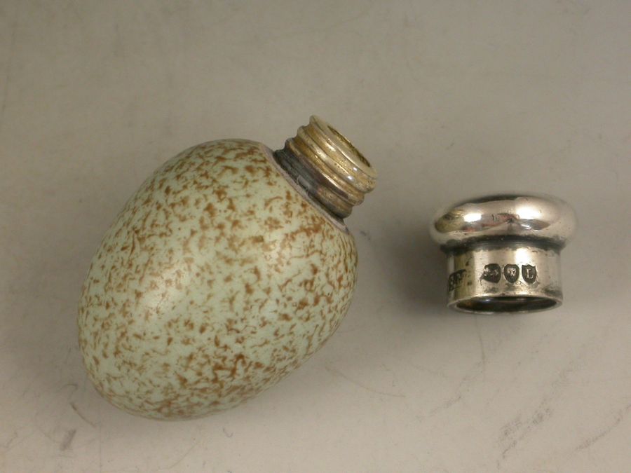 A good Victorian novelty silver and ceramic Scent Bottle made in the form of a Blackbirds Egg, with screw-off silver top and of small size. The egg stamped with a registered design number: 20772.
