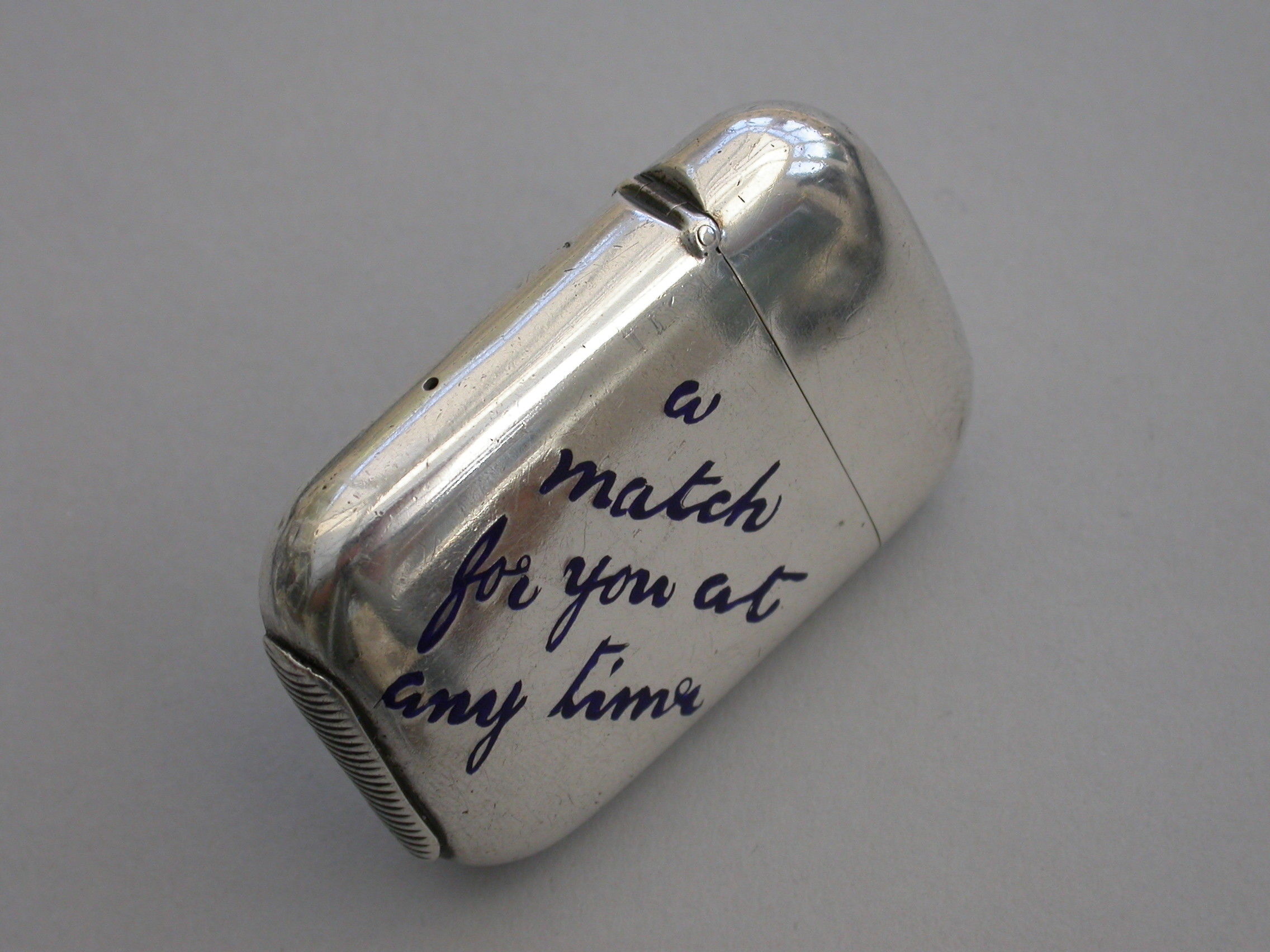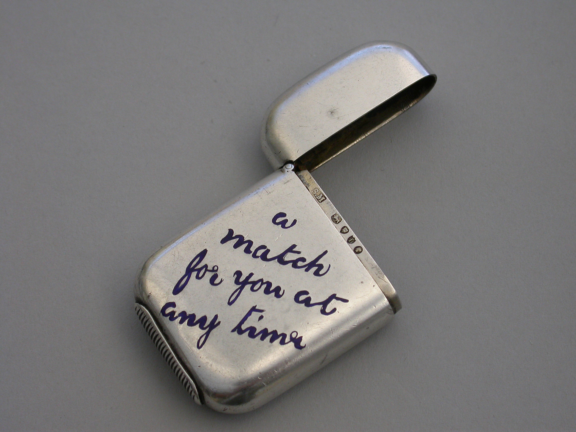 A good Victorian silver Vesta Case of rounded rectangular form with sprung hinged lid, the face with blue enamel legend - "" A match for you at any time"".