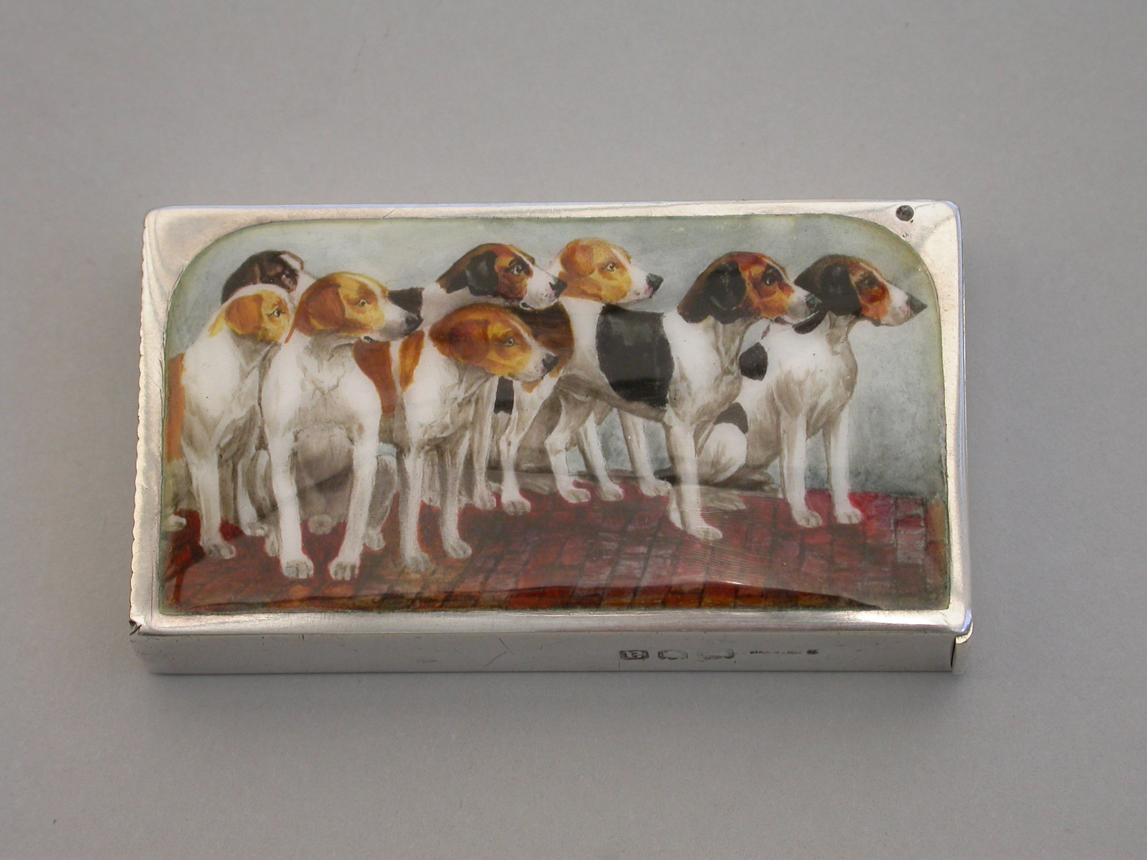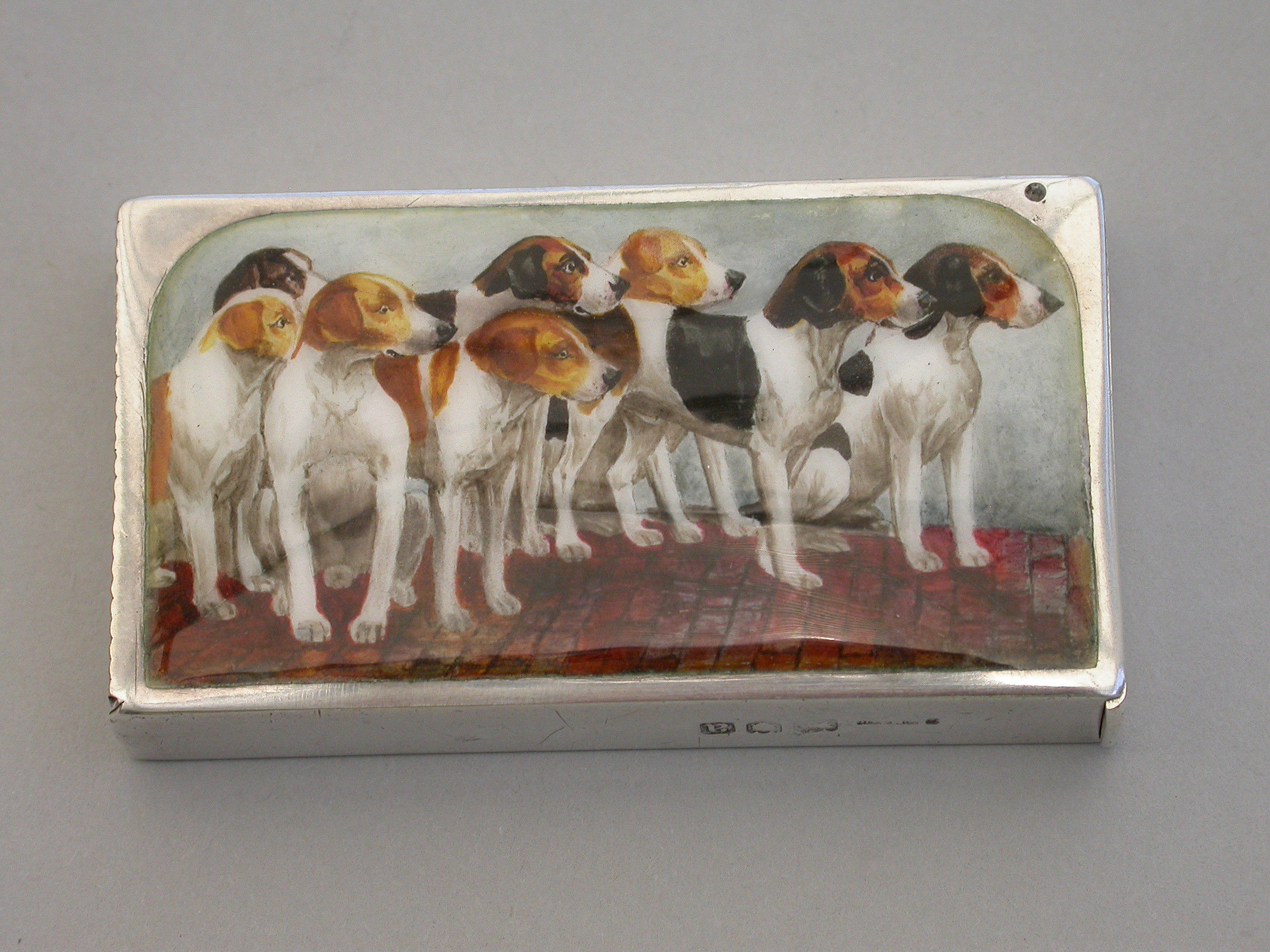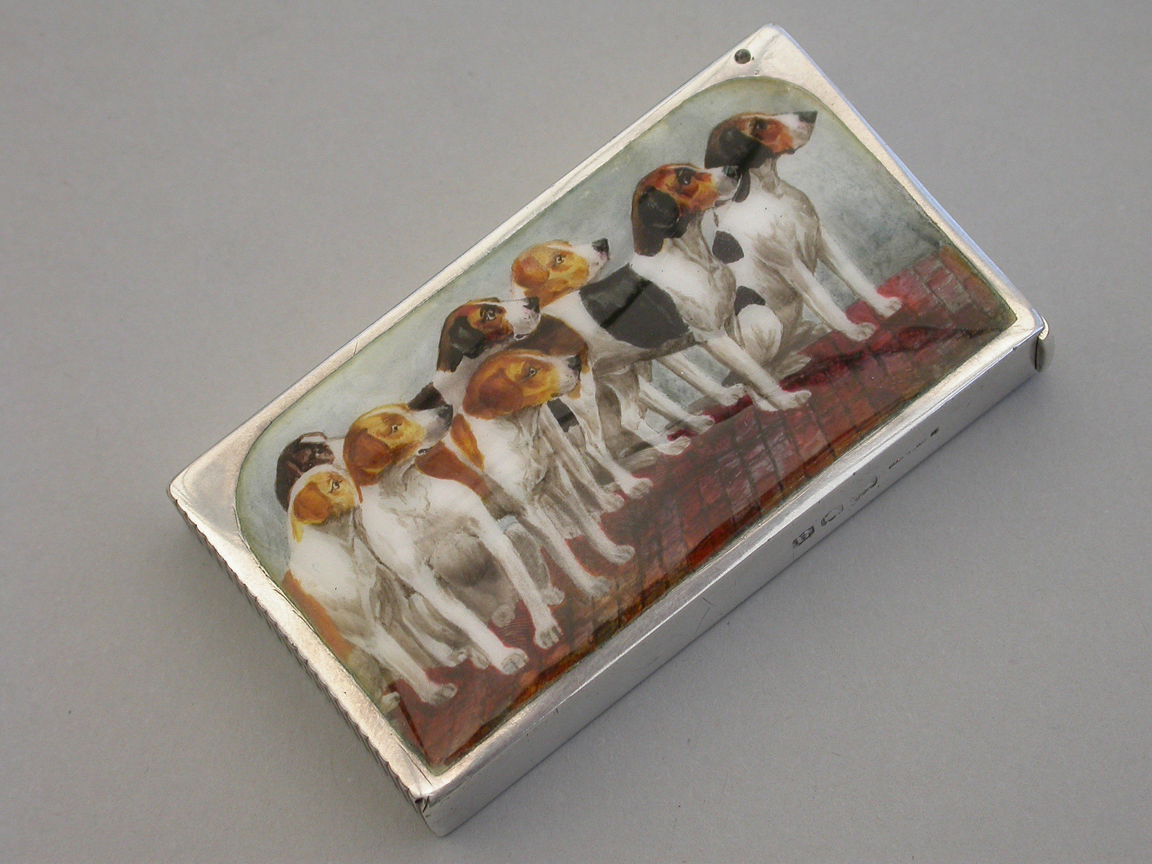 A fine quality Victorian silver and enamel Vesta Case of plain rectangular form with flat-top hinged lid, the face enamelled with a scene depicting eight expectant beagles on a red brick kennel floor.