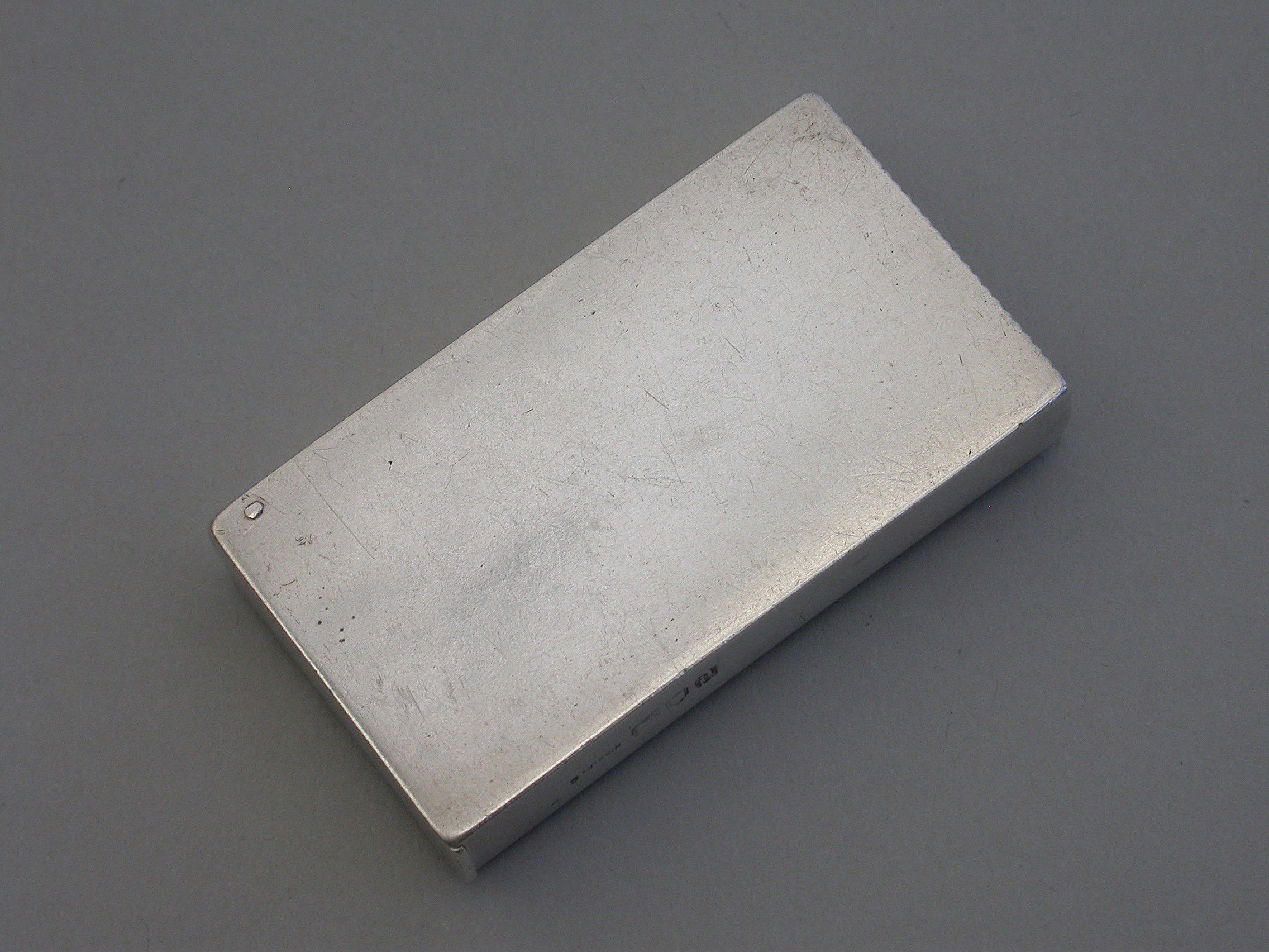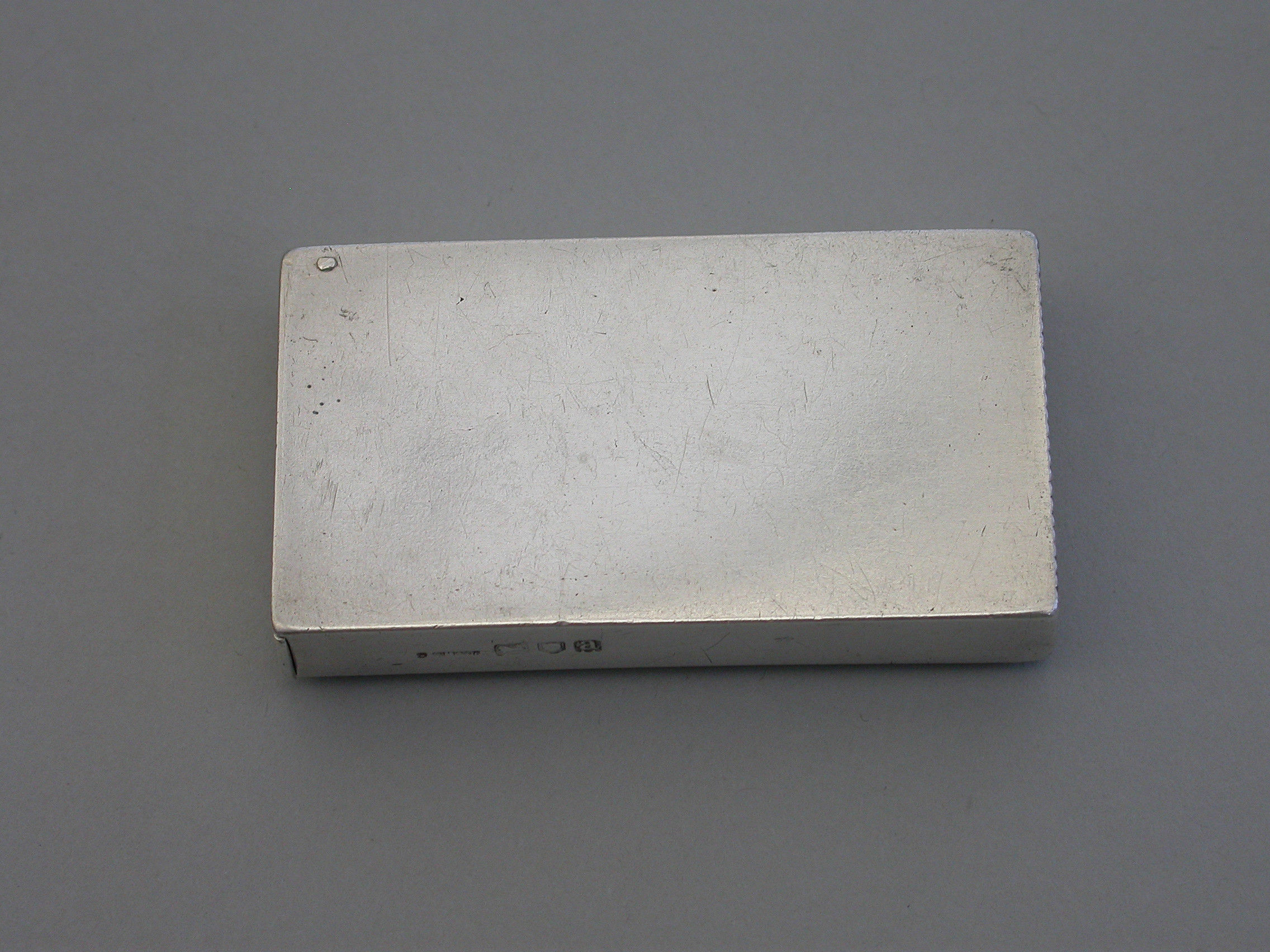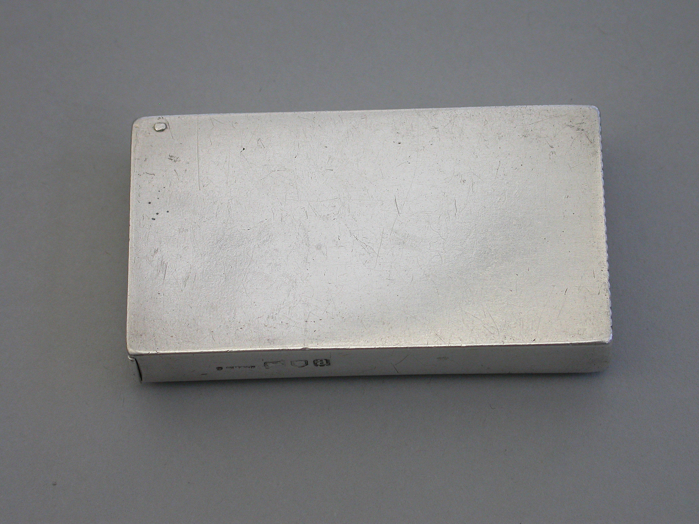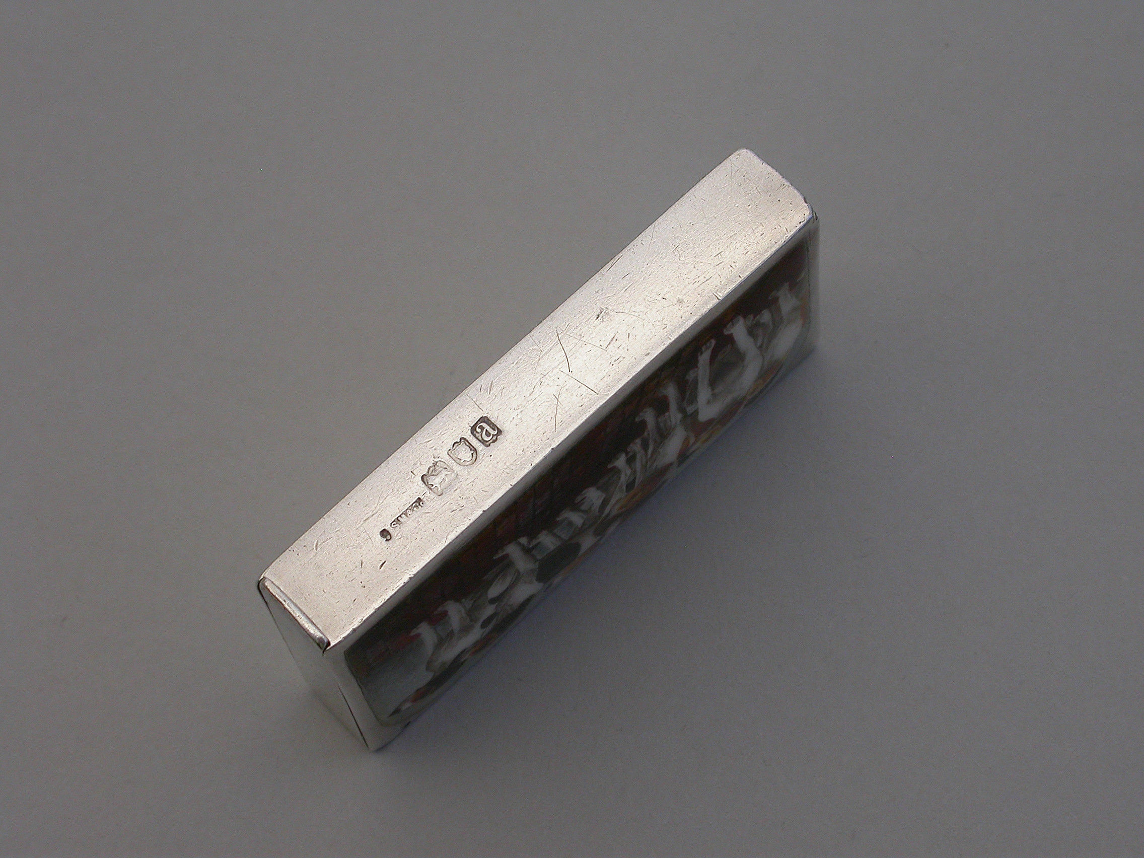 A fine quality Victorian silver and enamel Vesta Case of plain rectangular form with flat-top hinged lid, the face enamelled with a scene depicting eight expectant beagles on a red brick kennel floor.