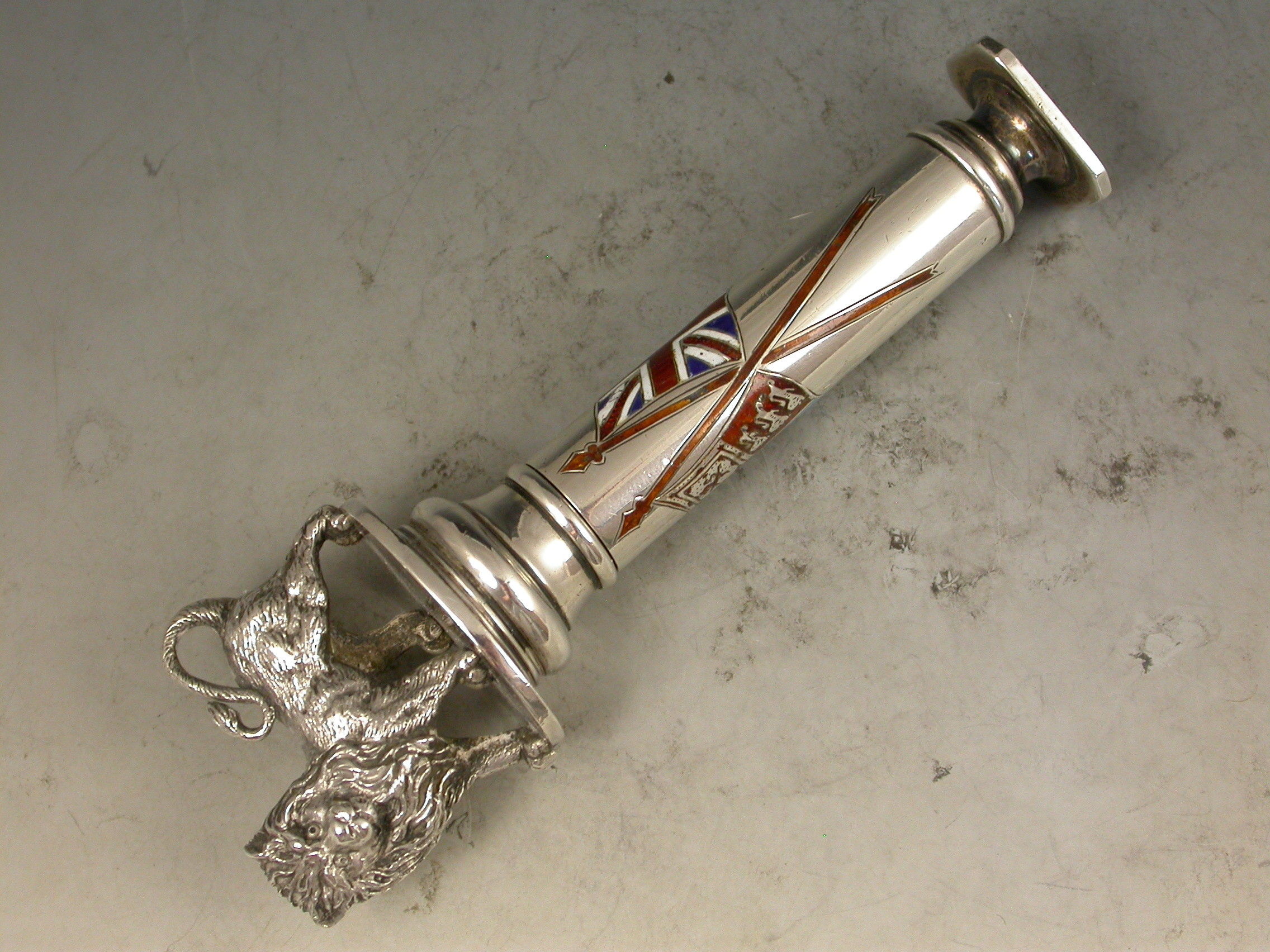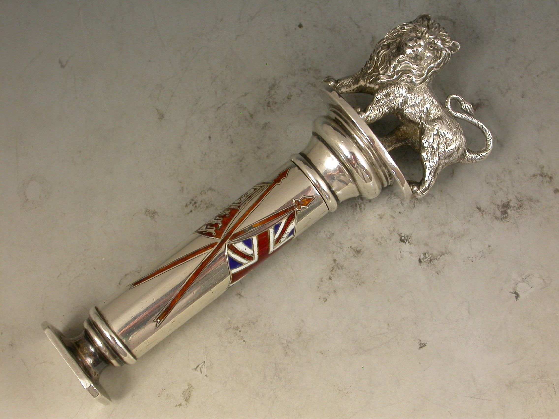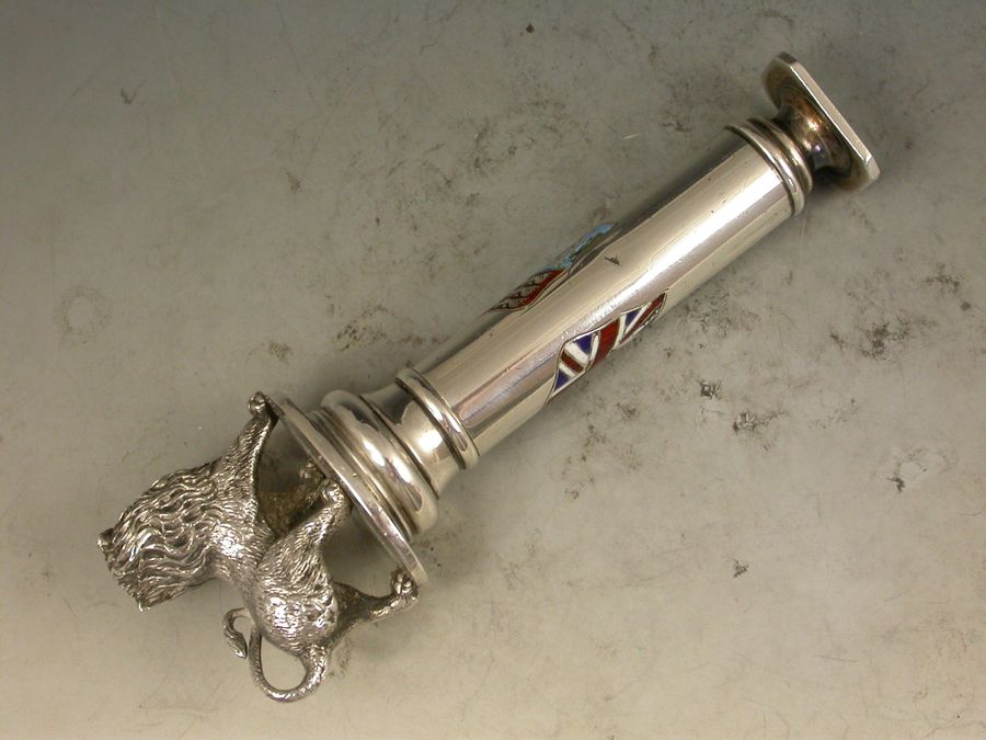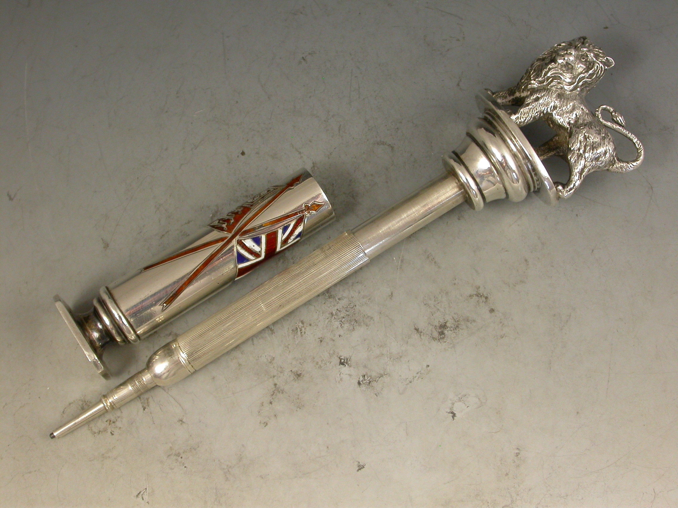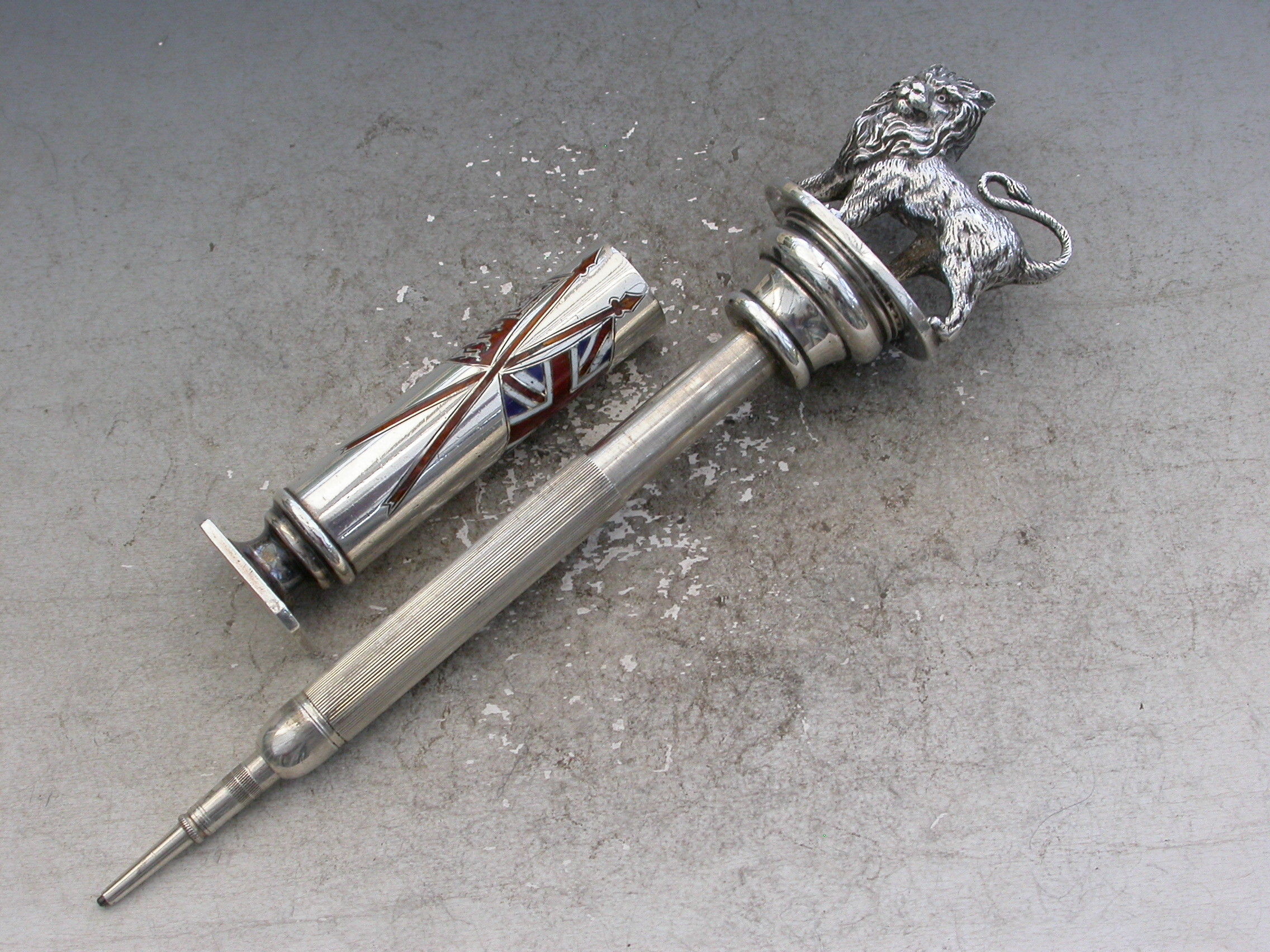A fabulous quality Victorian silver and enamel Propelling Pencil with heavy cast British Lion finial, the column shaped sheath with plain seal end and enamelled with the crossed flags of the British Empire - The Royal Standard and The Union Jack.