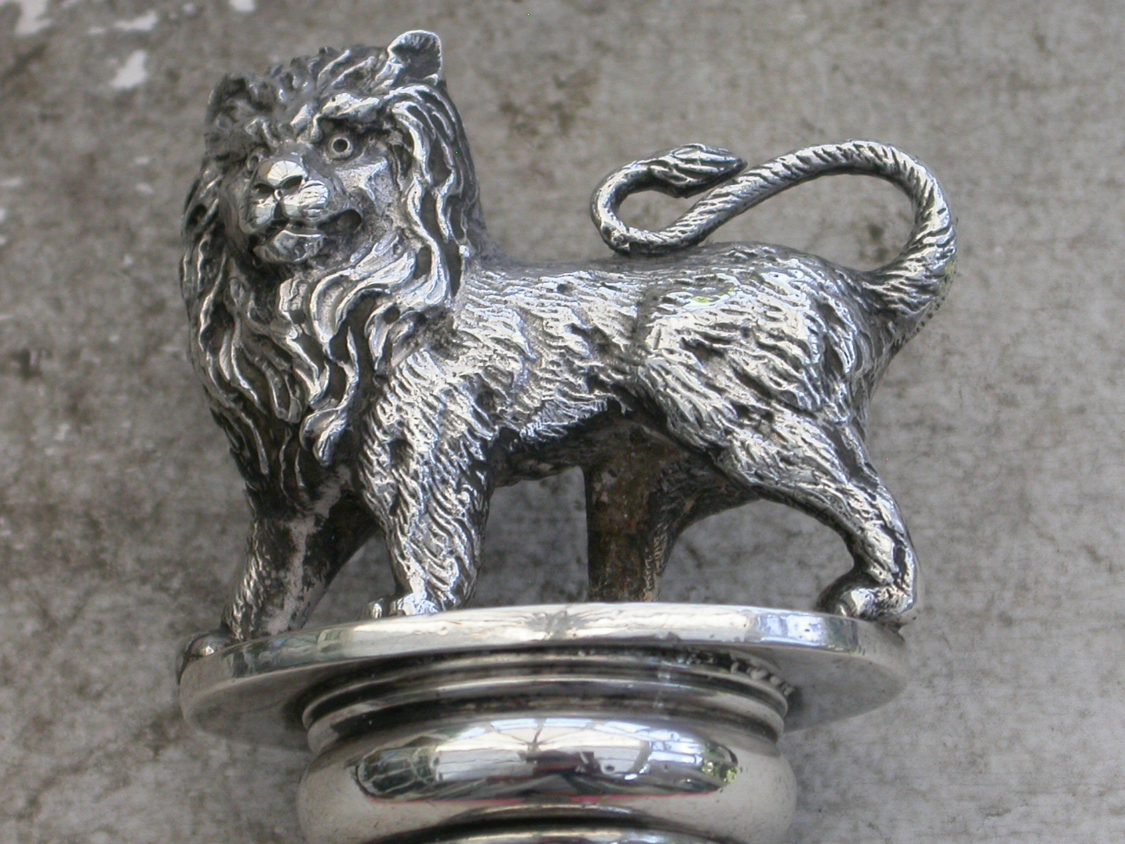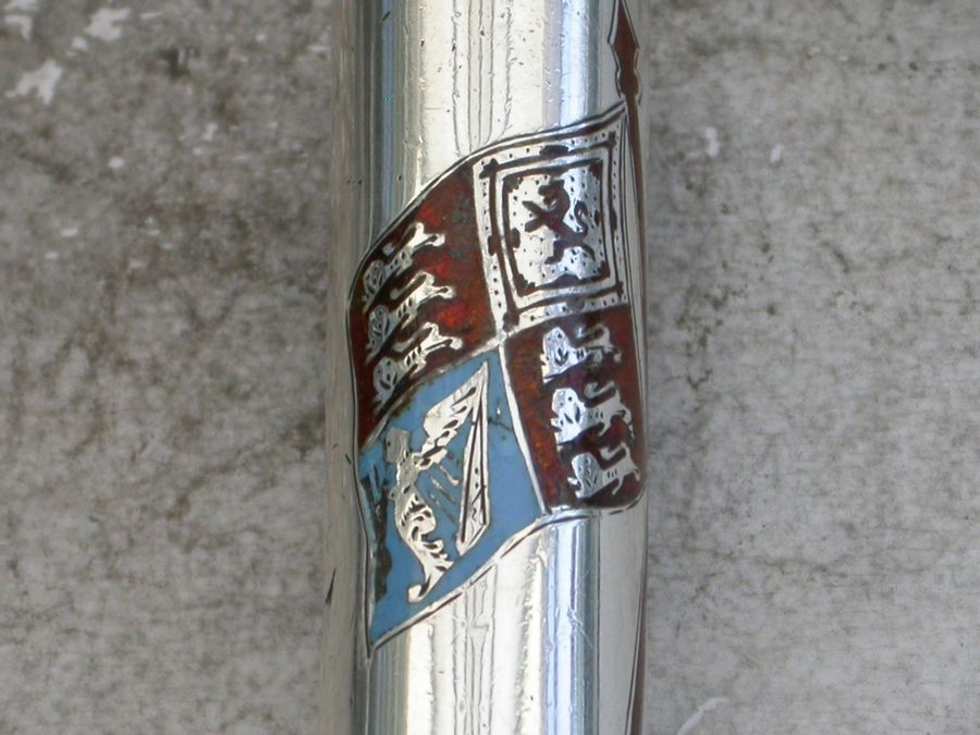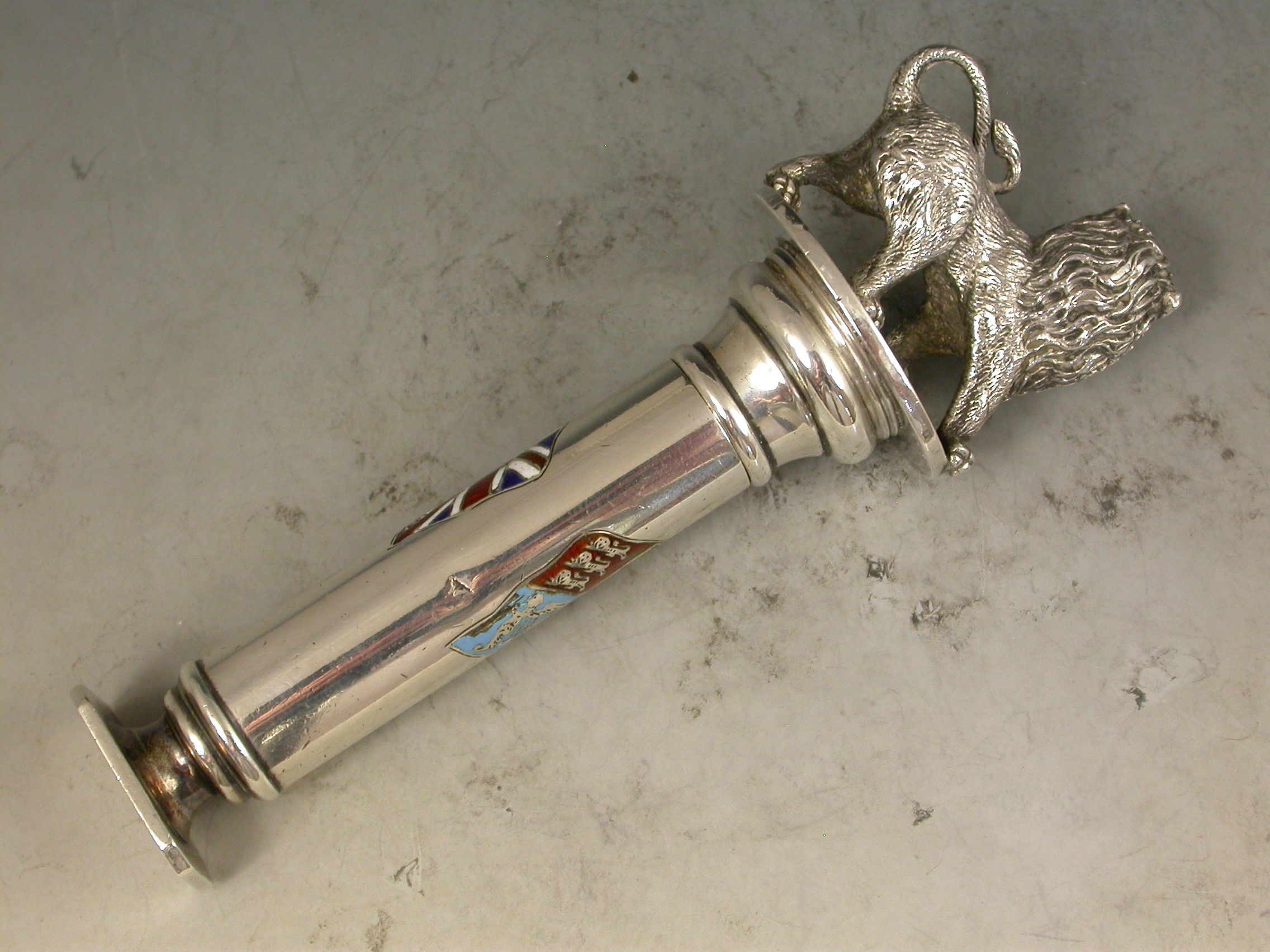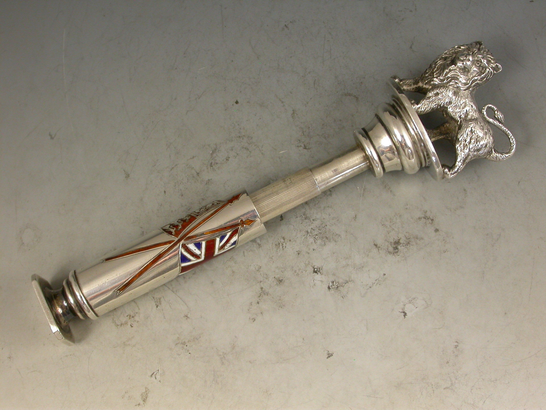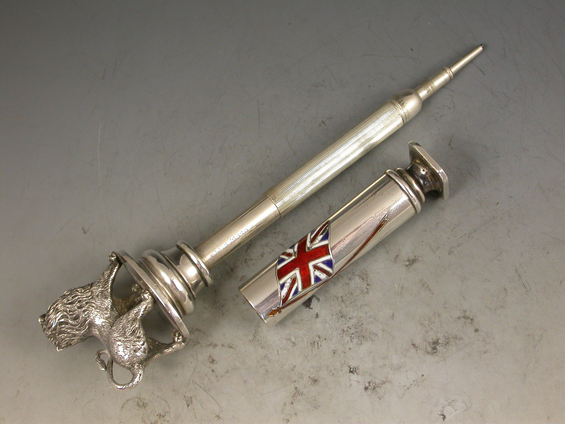 A fabulous quality Victorian silver and enamel Propelling Pencil with heavy cast British Lion finial, the column shaped sheath with plain seal end and enamelled with the crossed flags of the British Empire - The Royal Standard and The Union Jack.