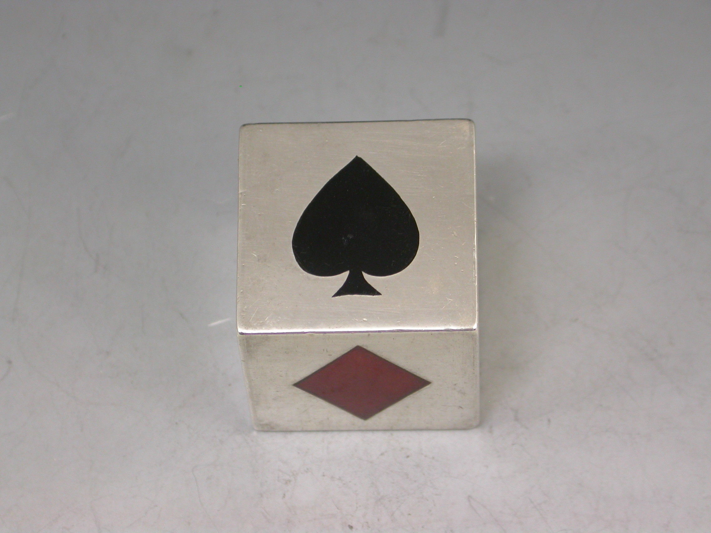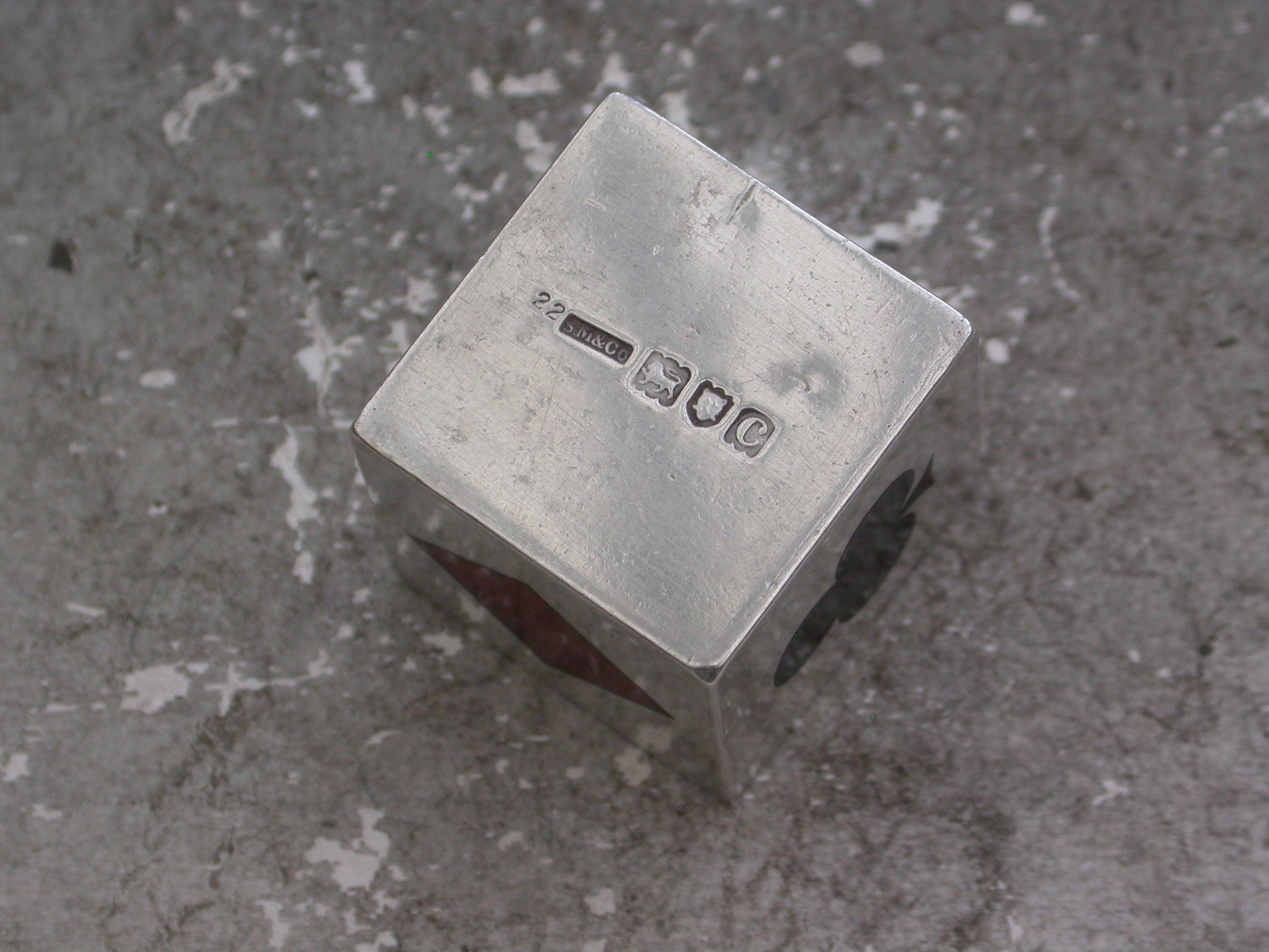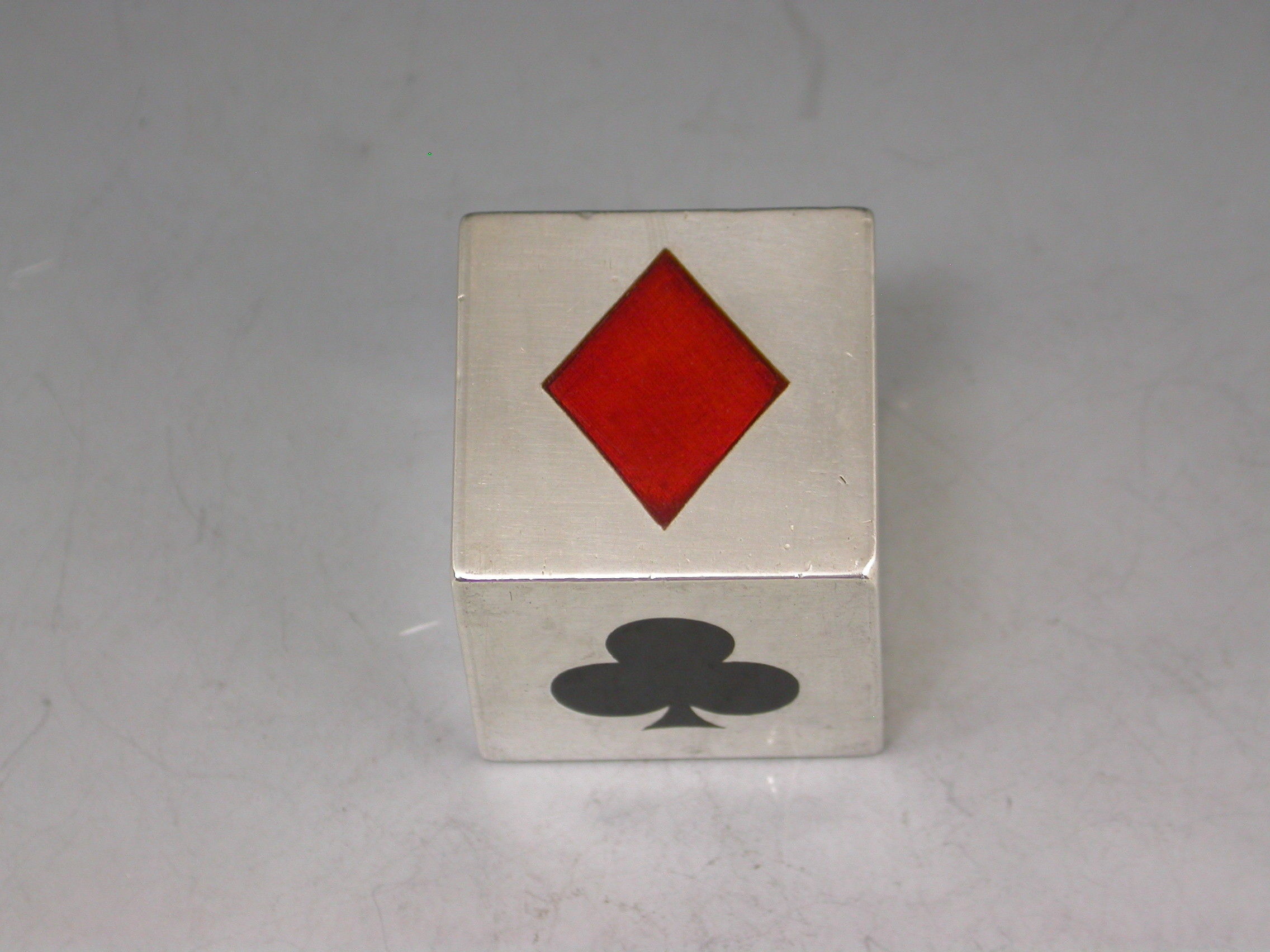 A rare Victorian silver and enamel Trumps Marker of cube or dice shape, enamelled with the four suits and with two plain sides for no trumps.