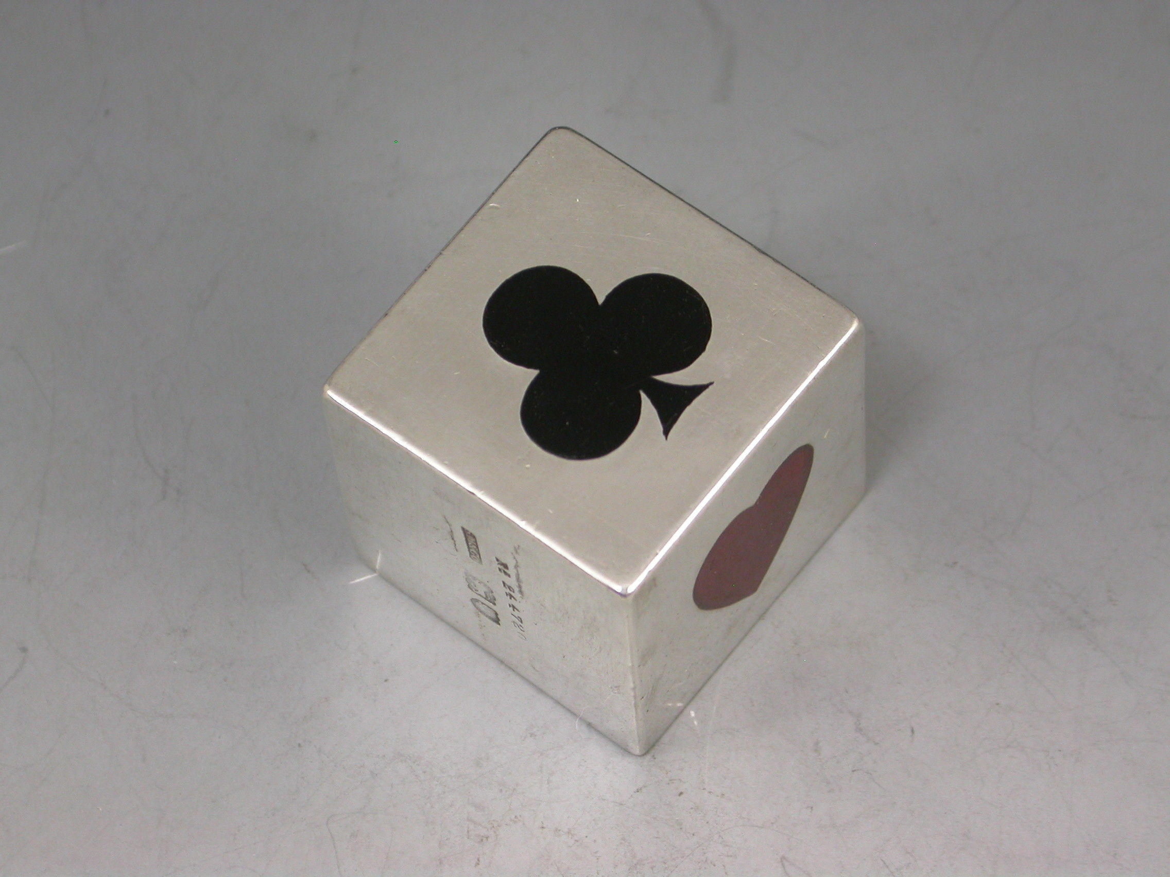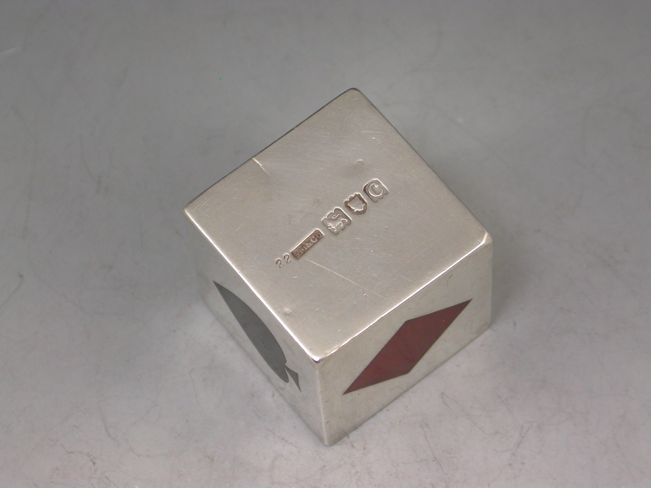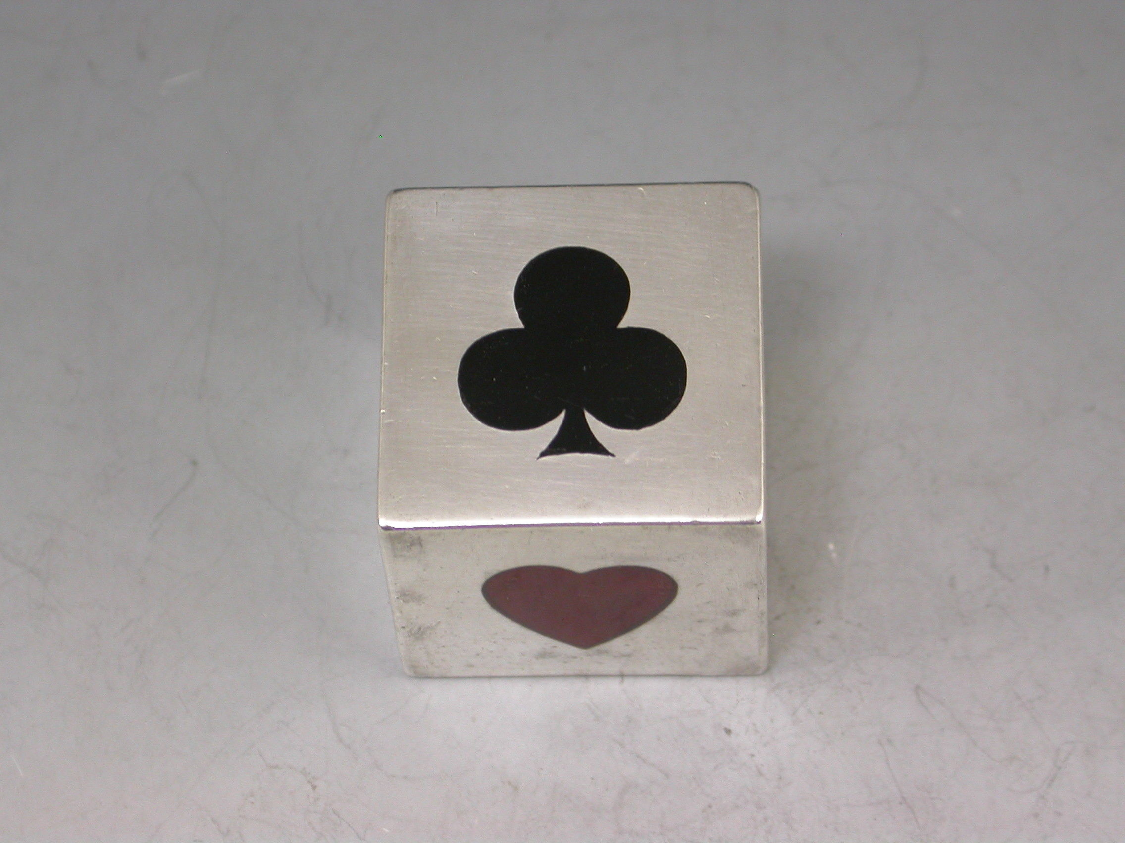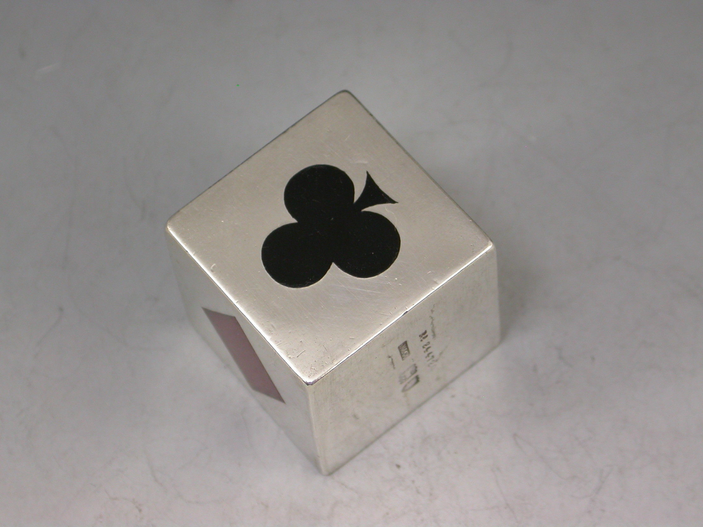 A rare Victorian silver and enamel Trumps Marker of cube or dice shape, enamelled with the four suits and with two plain sides for no trumps.