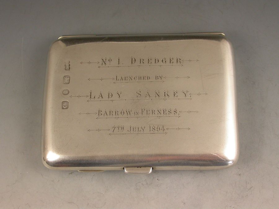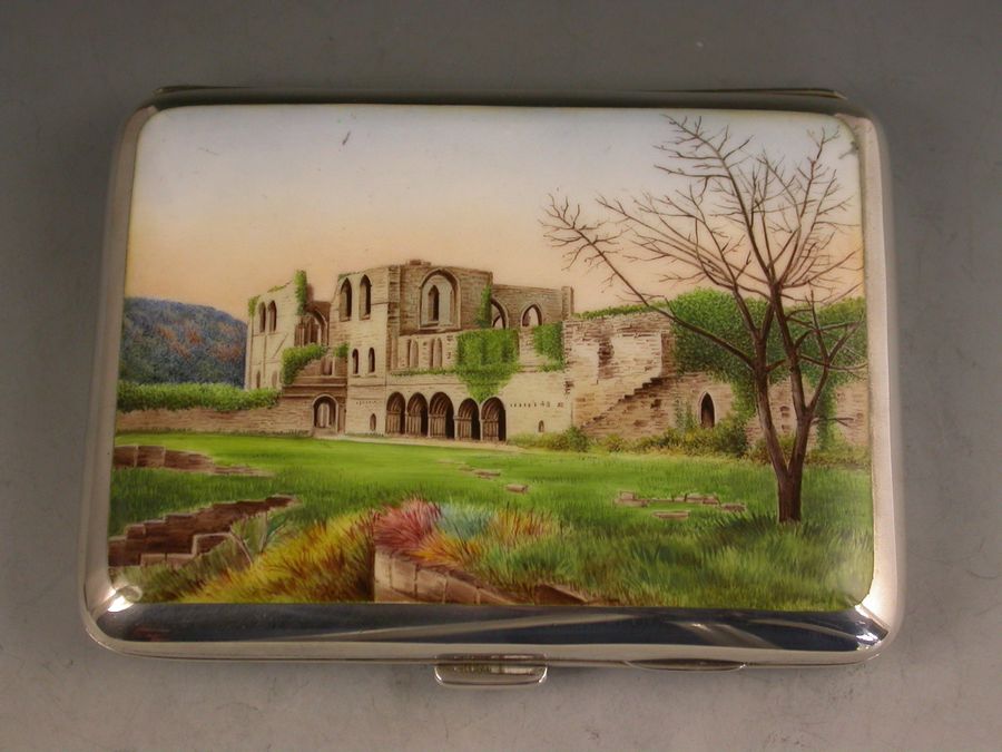 A good Victorian silver Cigarette Case of rounded rectangular form, the cover decorated with a painted enamel scene depicting a south-west view of Furness Abbey in Lancashire. Silver gilt interior and engraved presentation inscriptions inside and out relating to Barrow-in-Furness, presented by Lady Sankey.