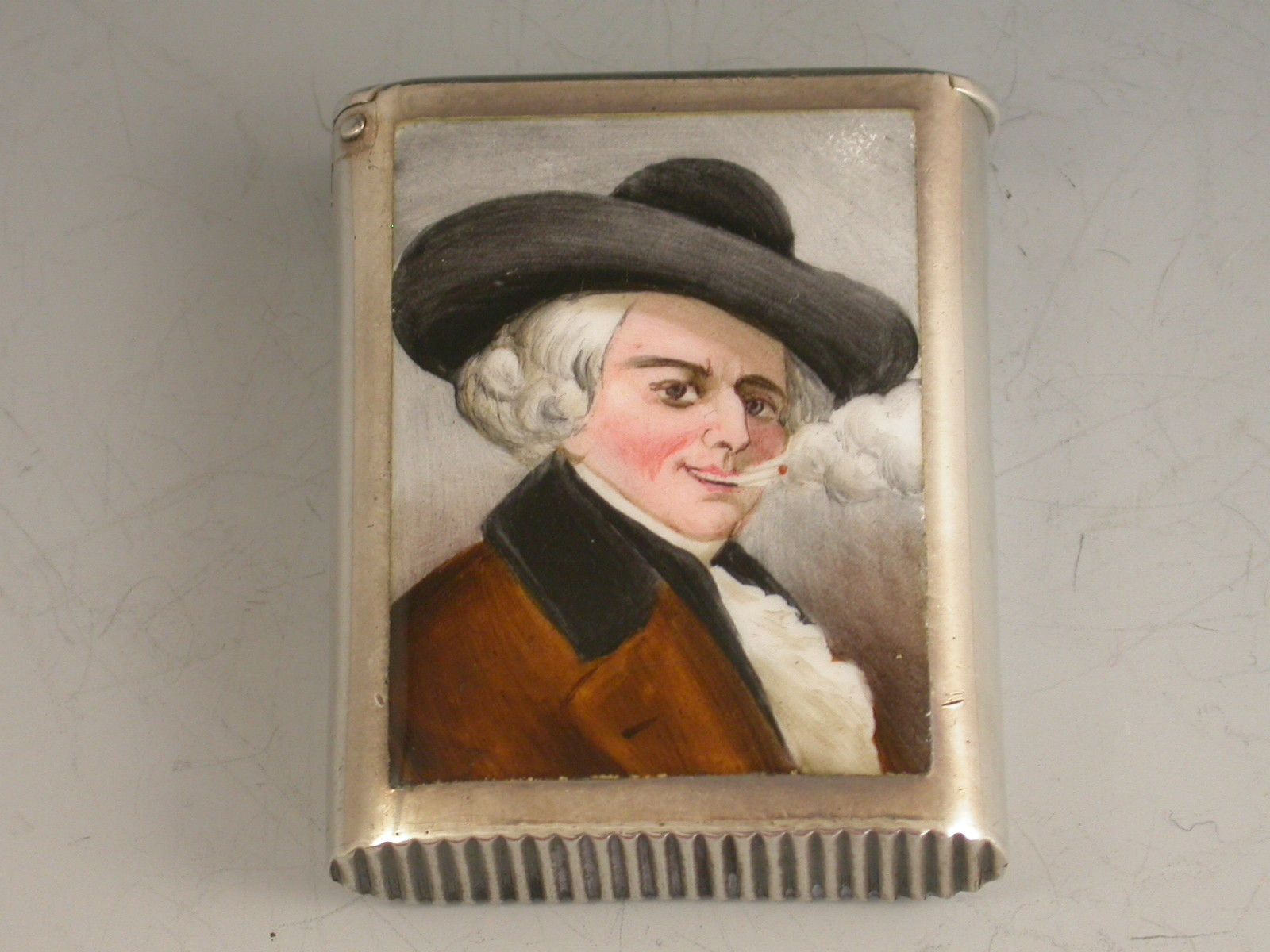 A good Victorian silver Vesta Case of rounded rectangular form with sprung flat hinged lid and silver gilt interior, the face with inset enamel panel depicting a Cavalier type Gentleman smoking a cigarette.
