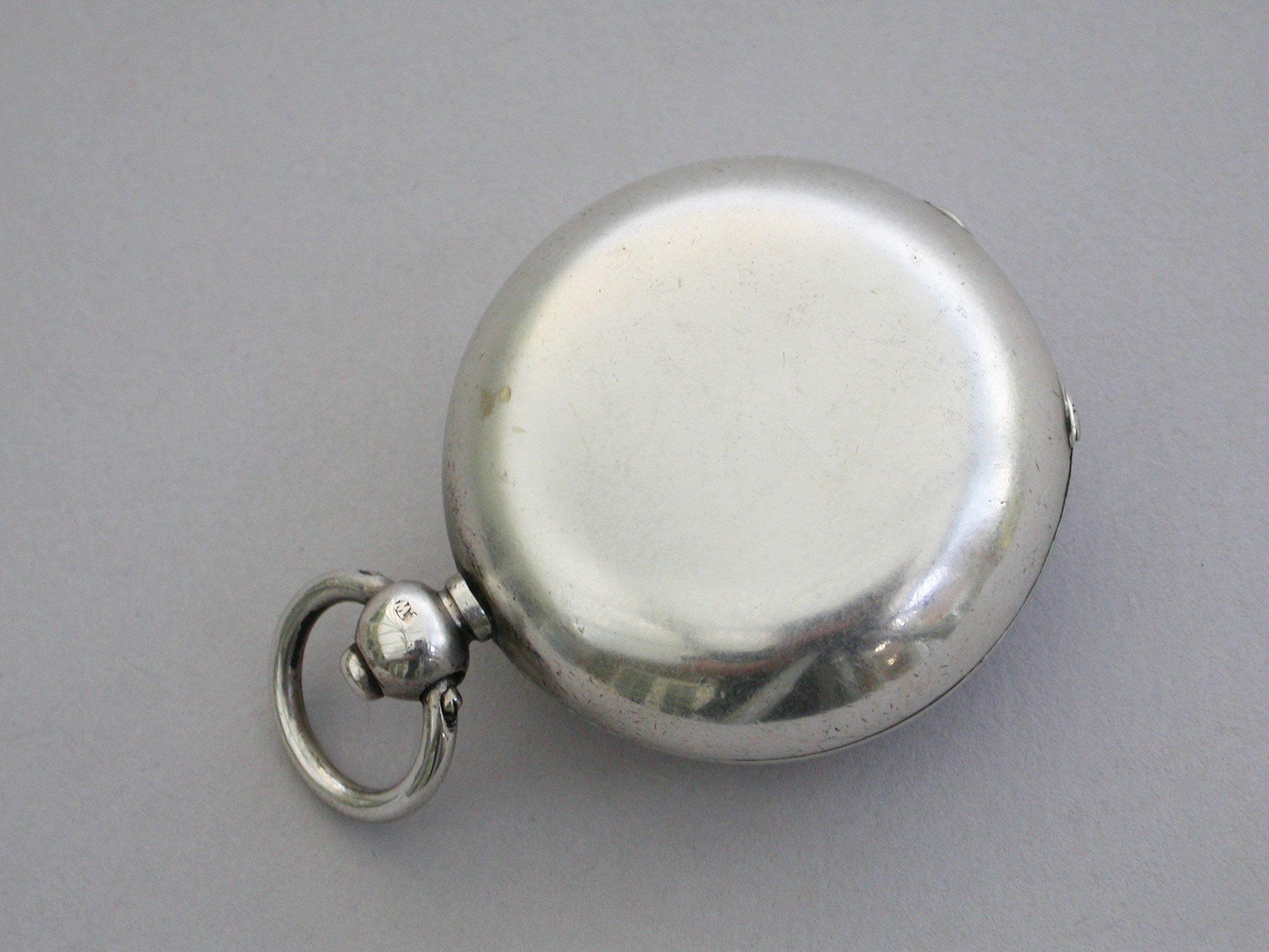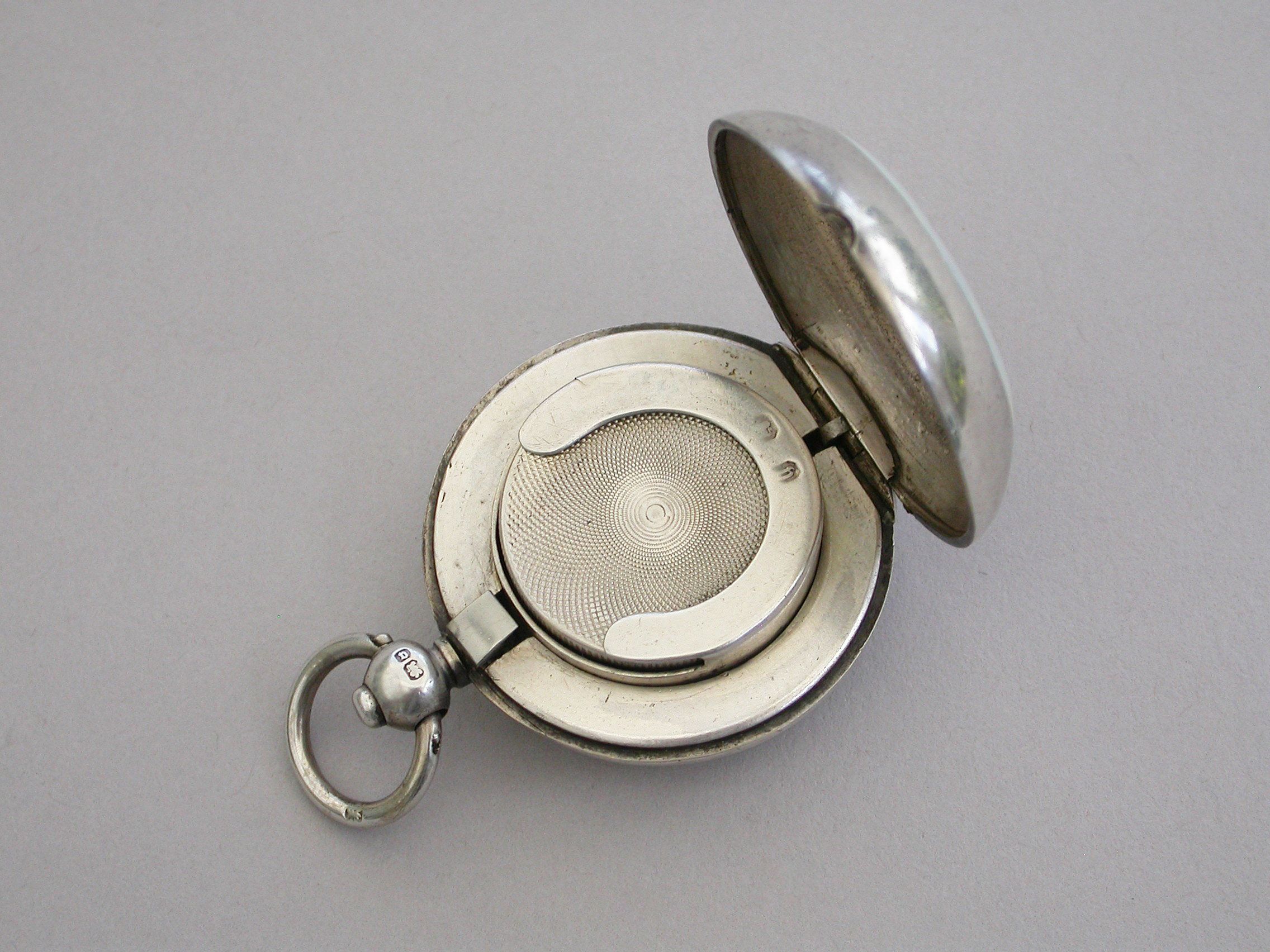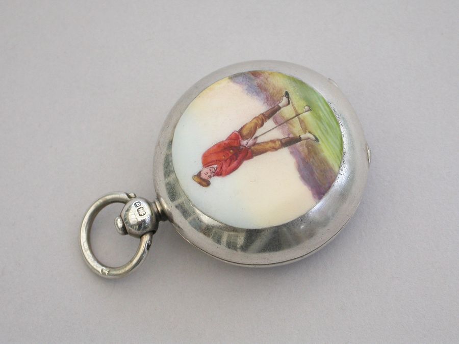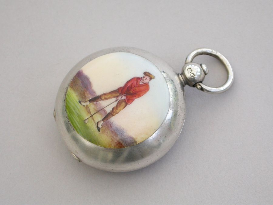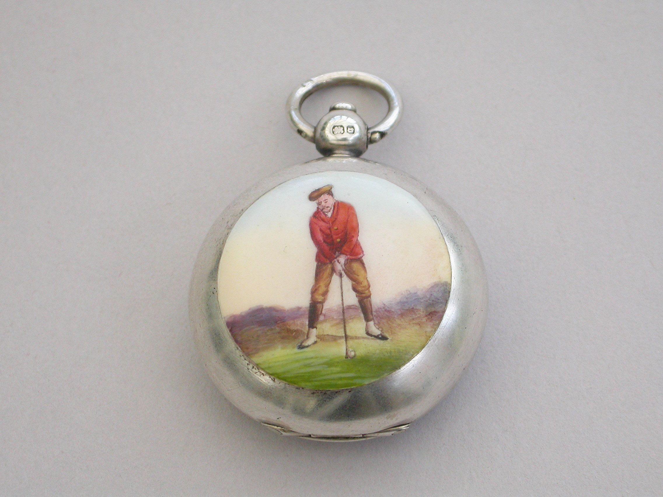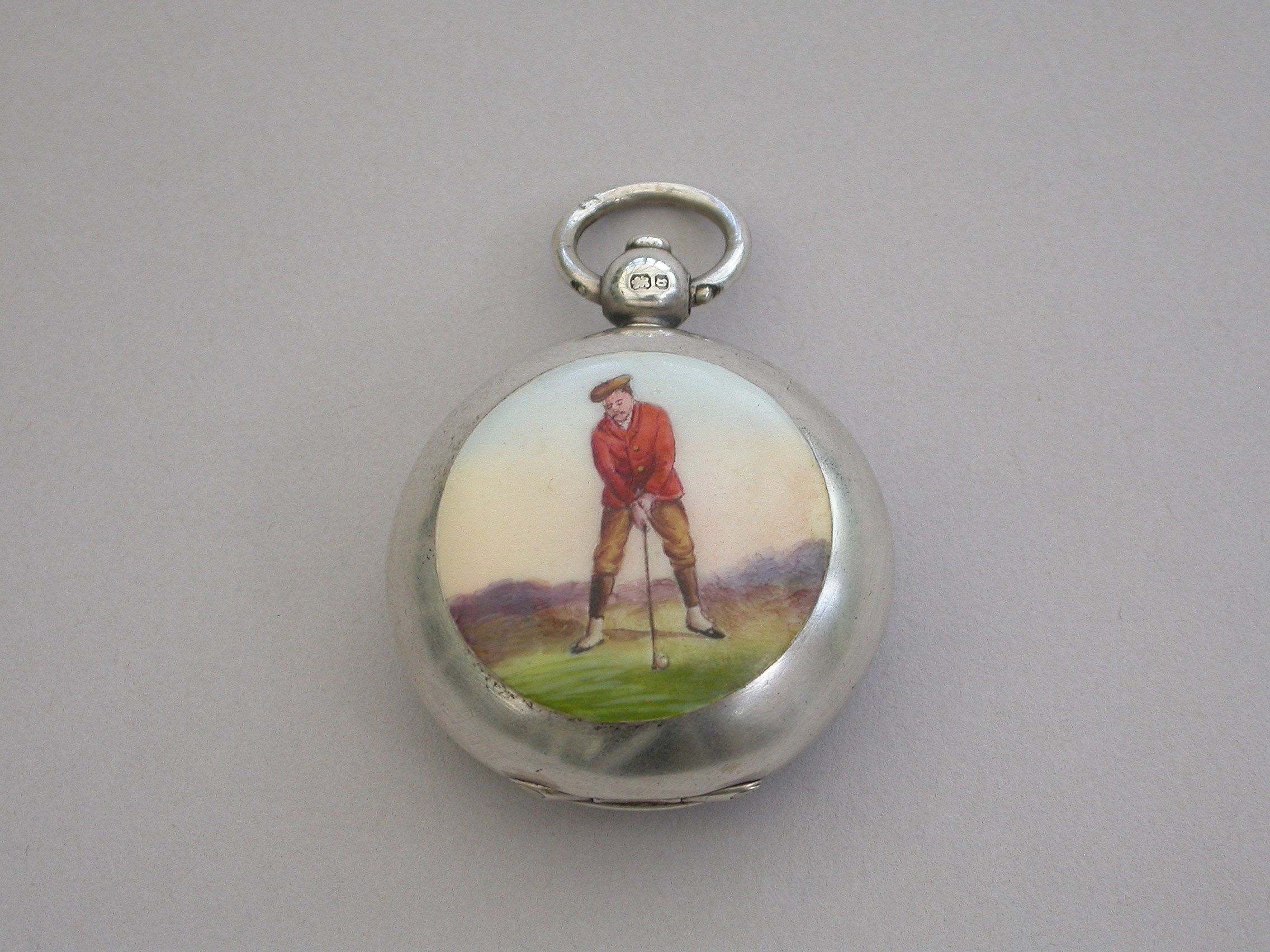 A fine Victorian silver Sovereign Case, of circular form with attached suspension ring and sprung push-button opening mechanism, the face with inset enameled panel depicting a Golfer in period costume. Sprung internal sovereign compartment.