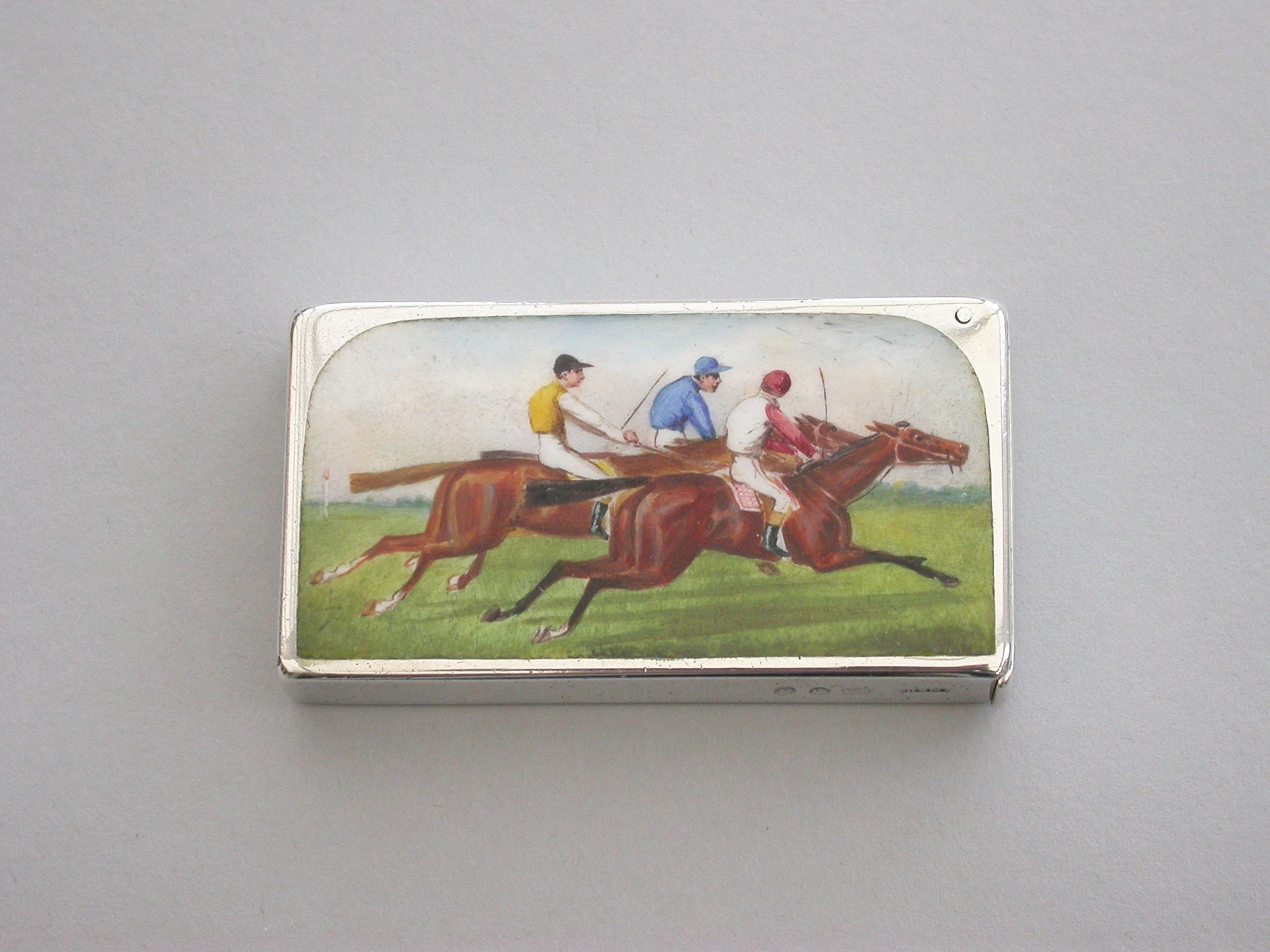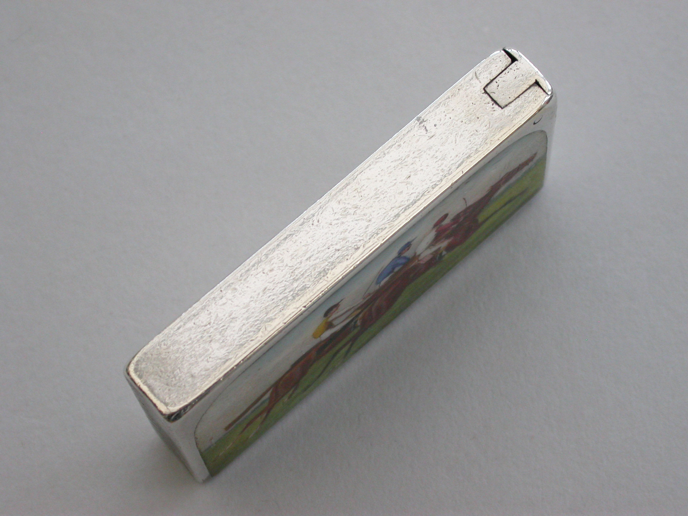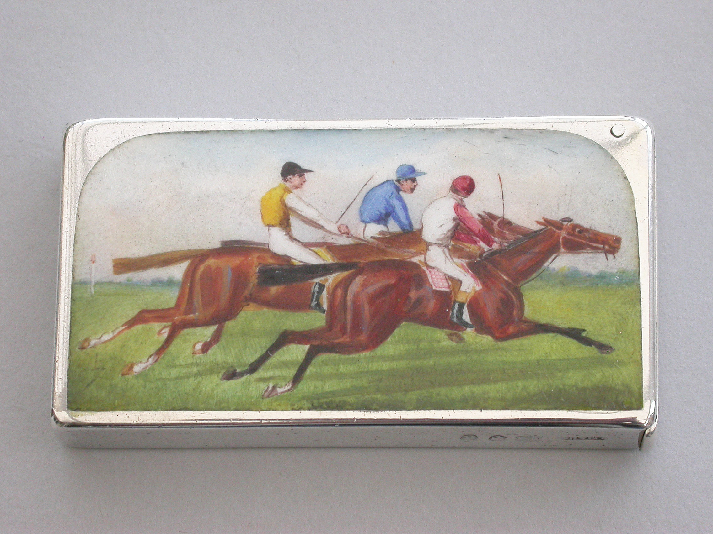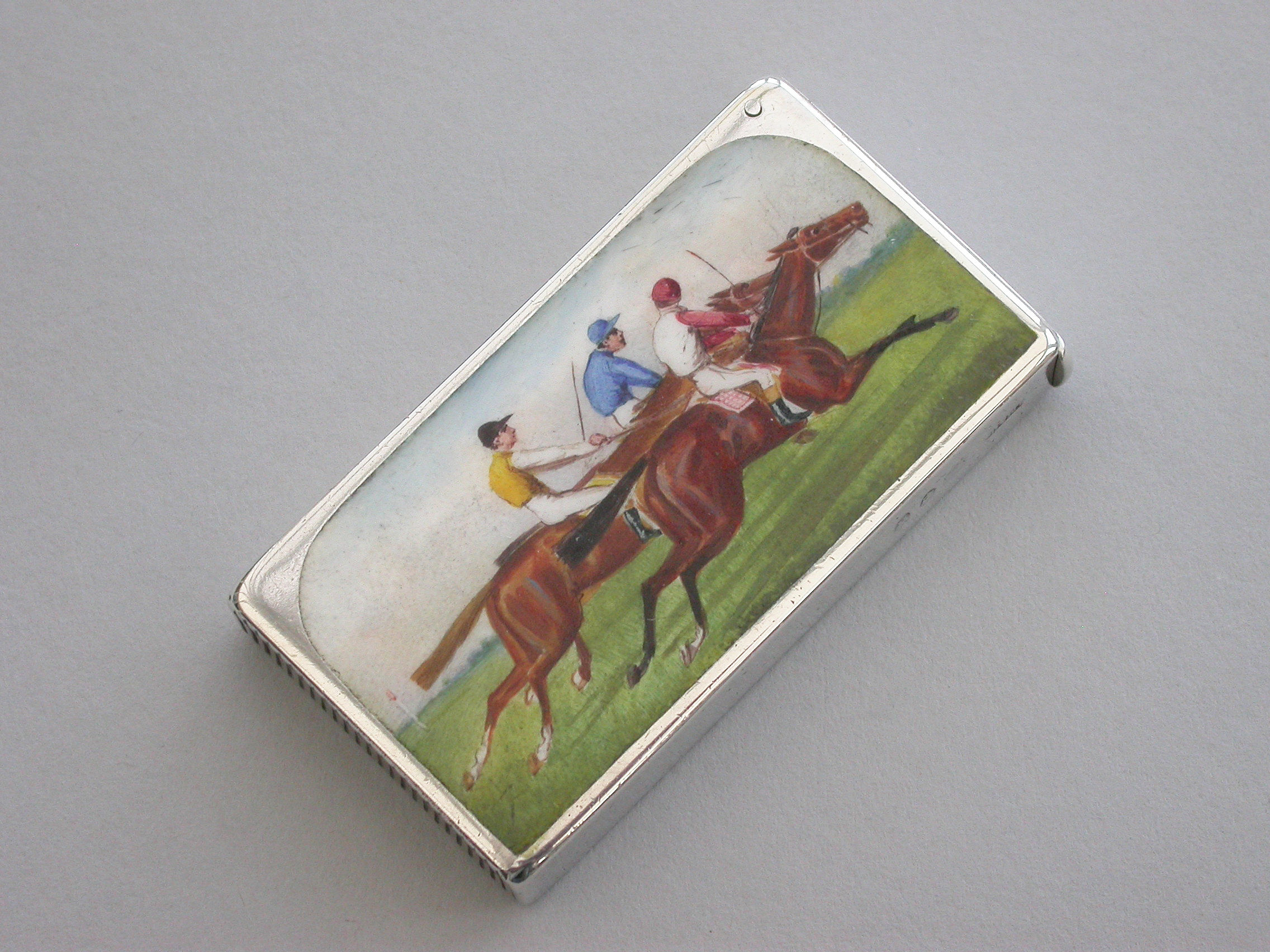 A good Victorian silver and enamel Vesta Case of flat-top rectangular form, the face enamelled with a horse racing scene.