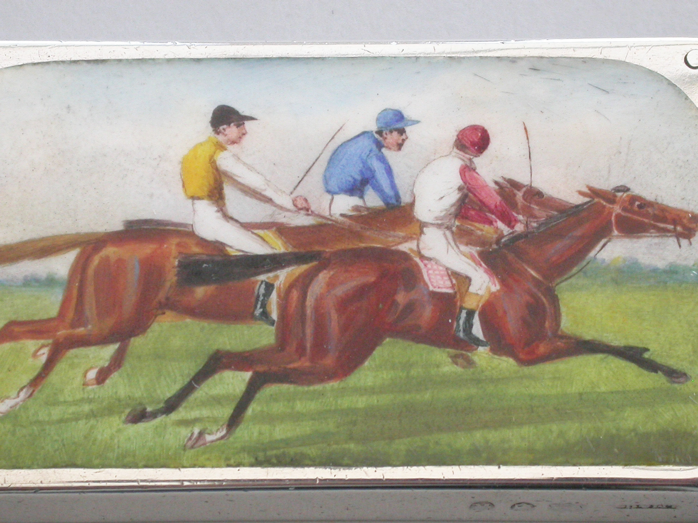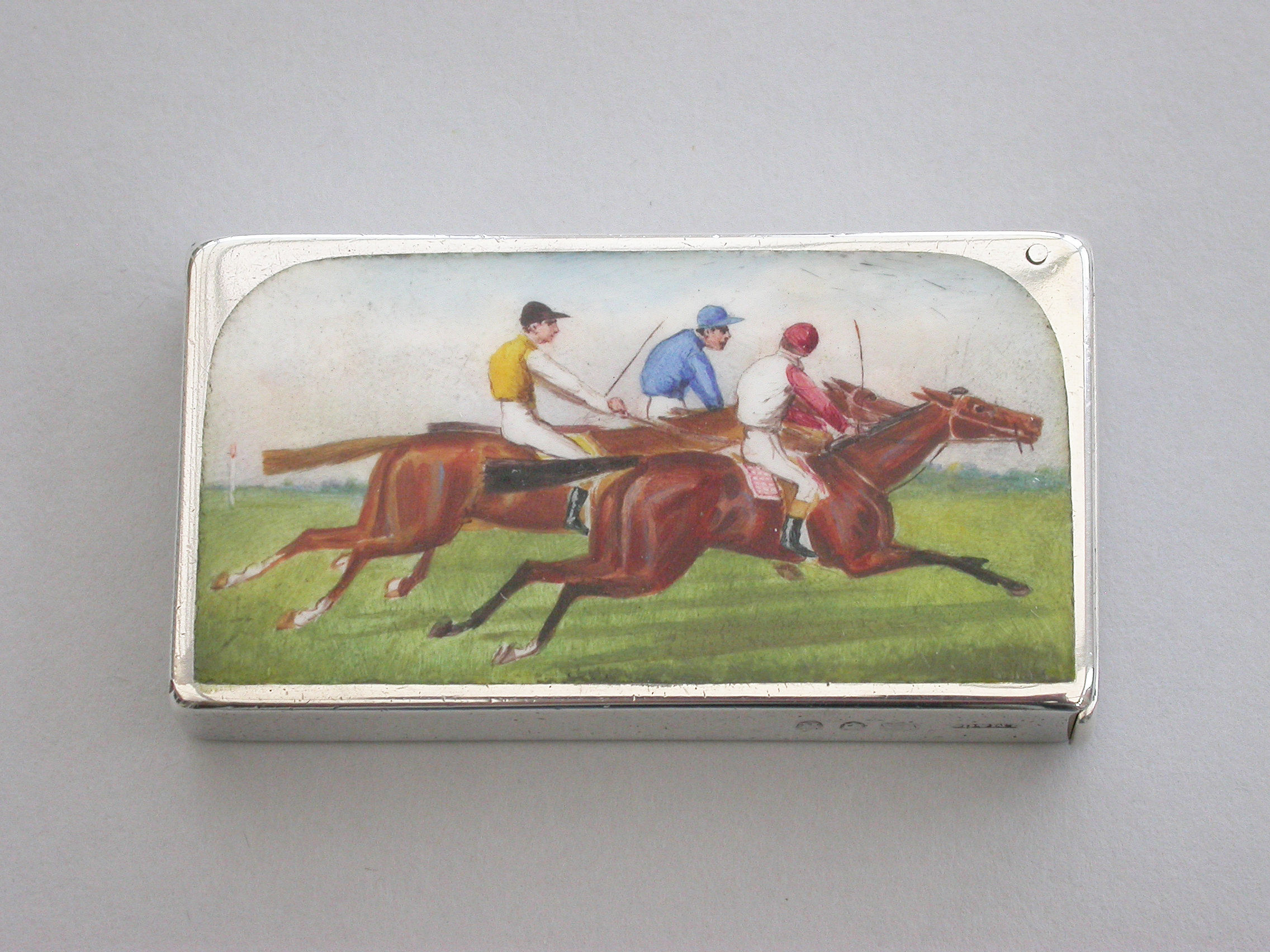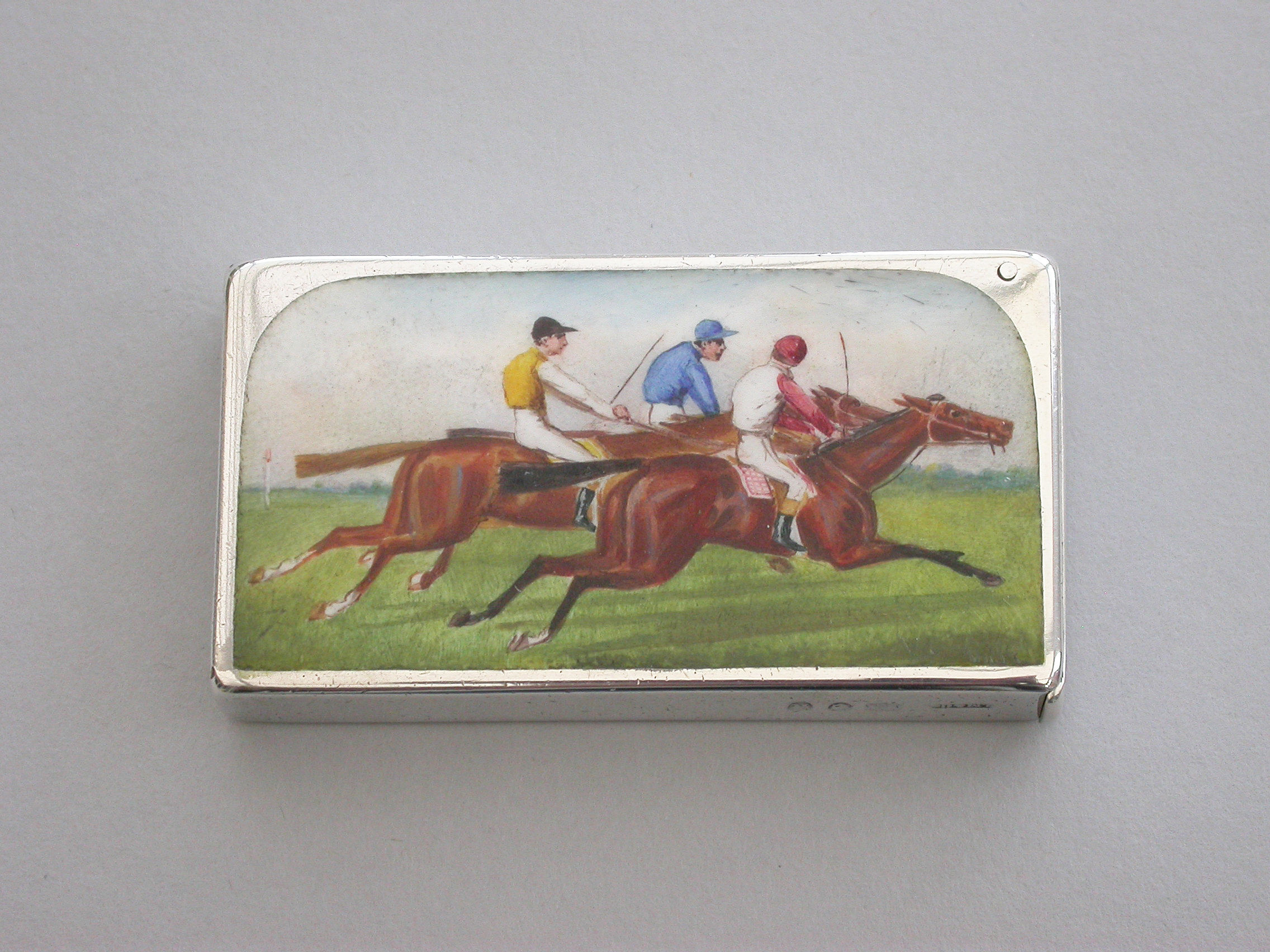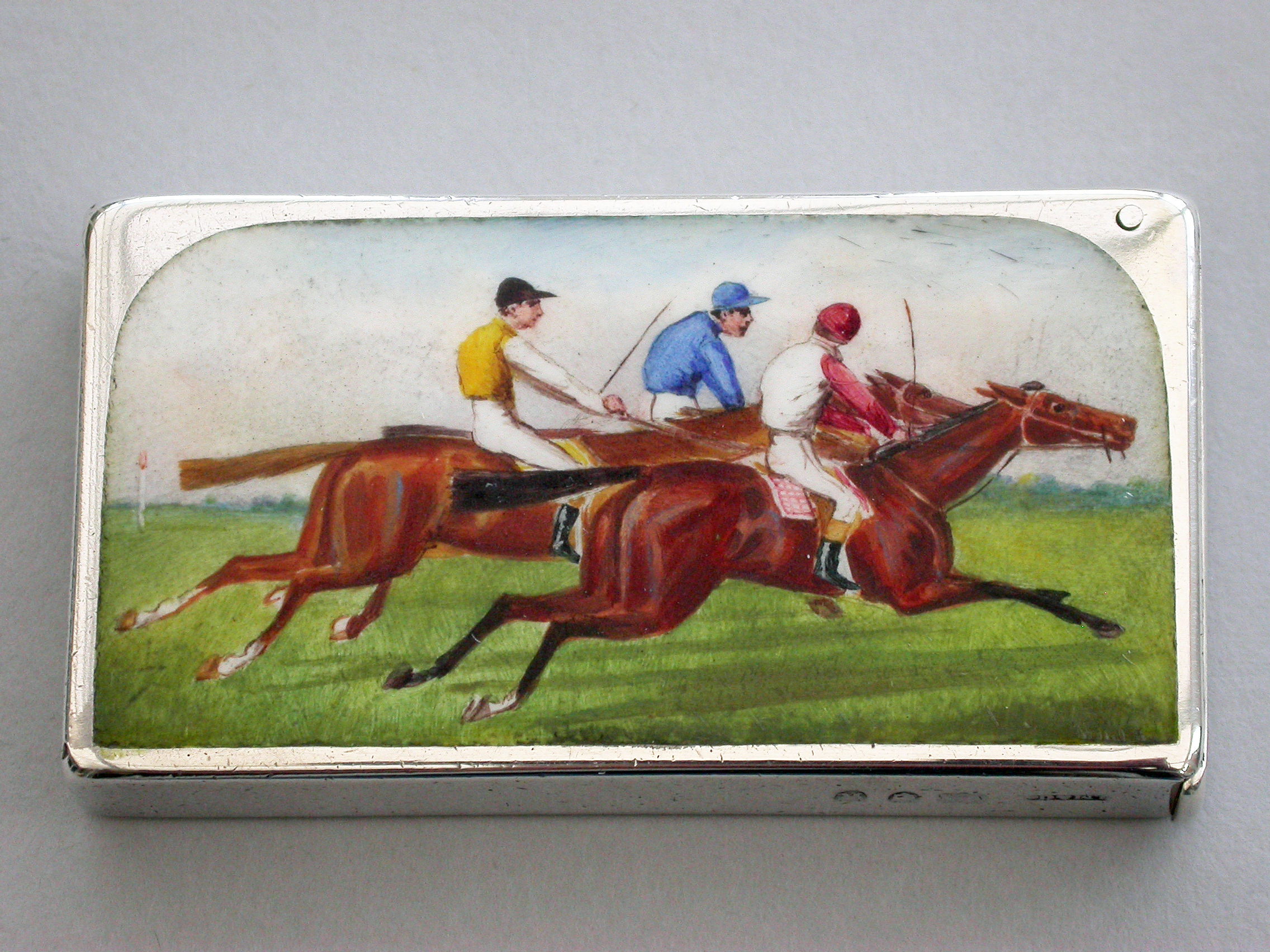 A good Victorian silver and enamel Vesta Case of flat-top rectangular form, the face enamelled with a horse racing scene.
