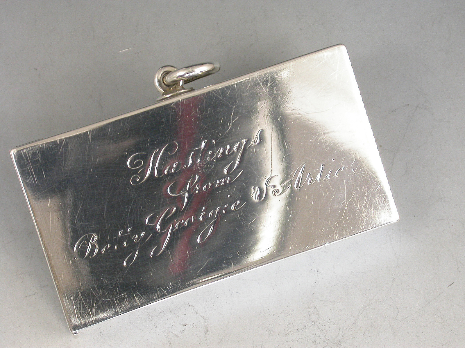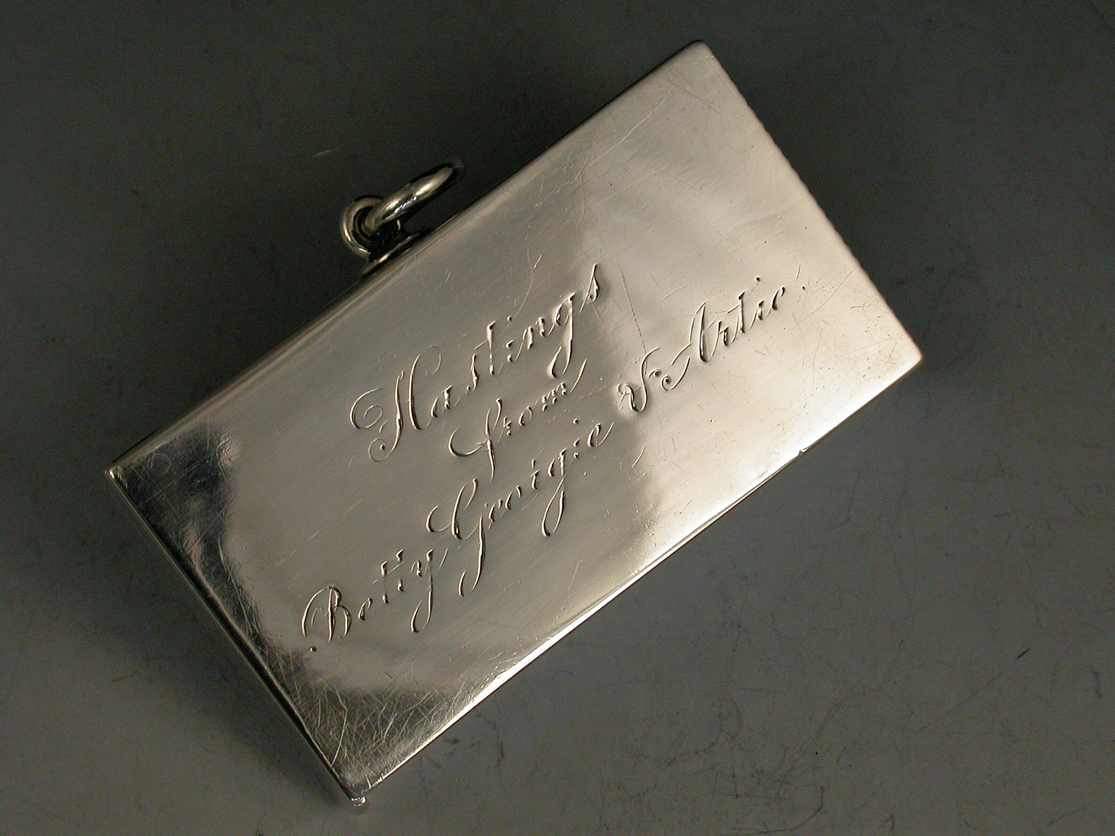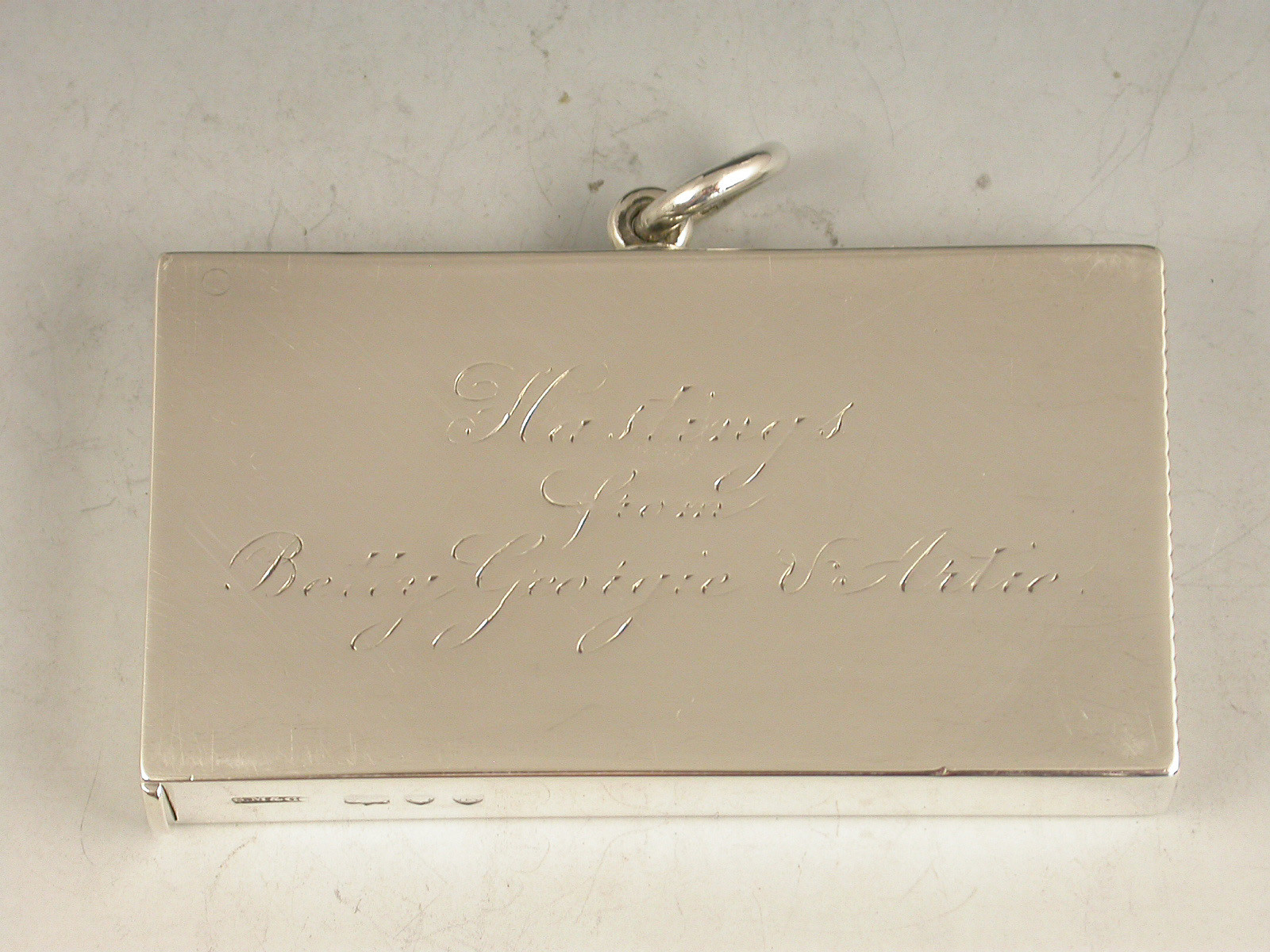 A very fine Victorian silver Vesta Case of plain rectangular form with flip-top sprung hinged lid and attached suspension ring, the face finely enamelled with a hunting scene. The reverse engraved with presentation inscription : Hastings from Betty, Georgie and Artie.