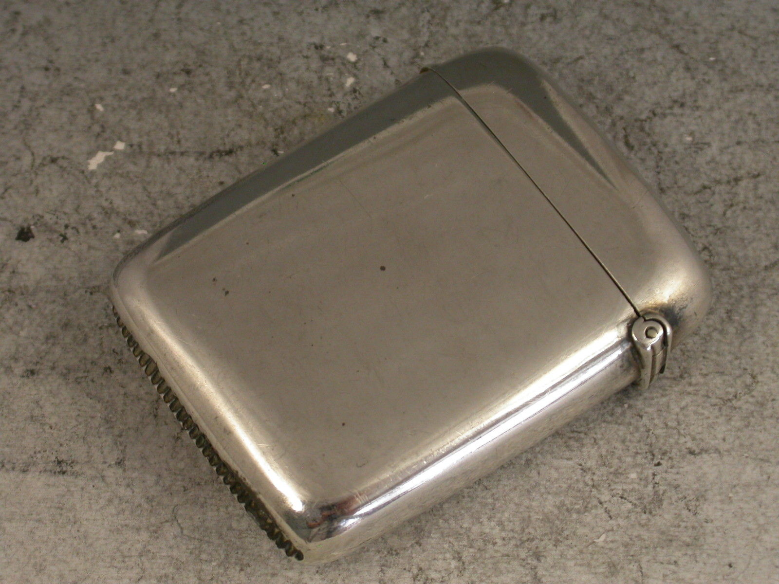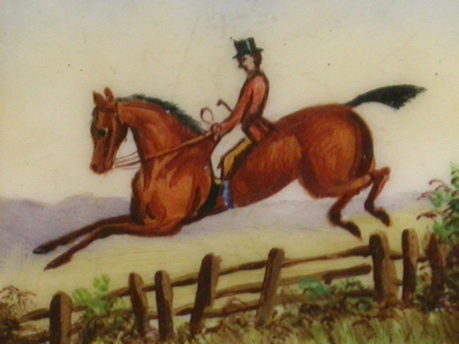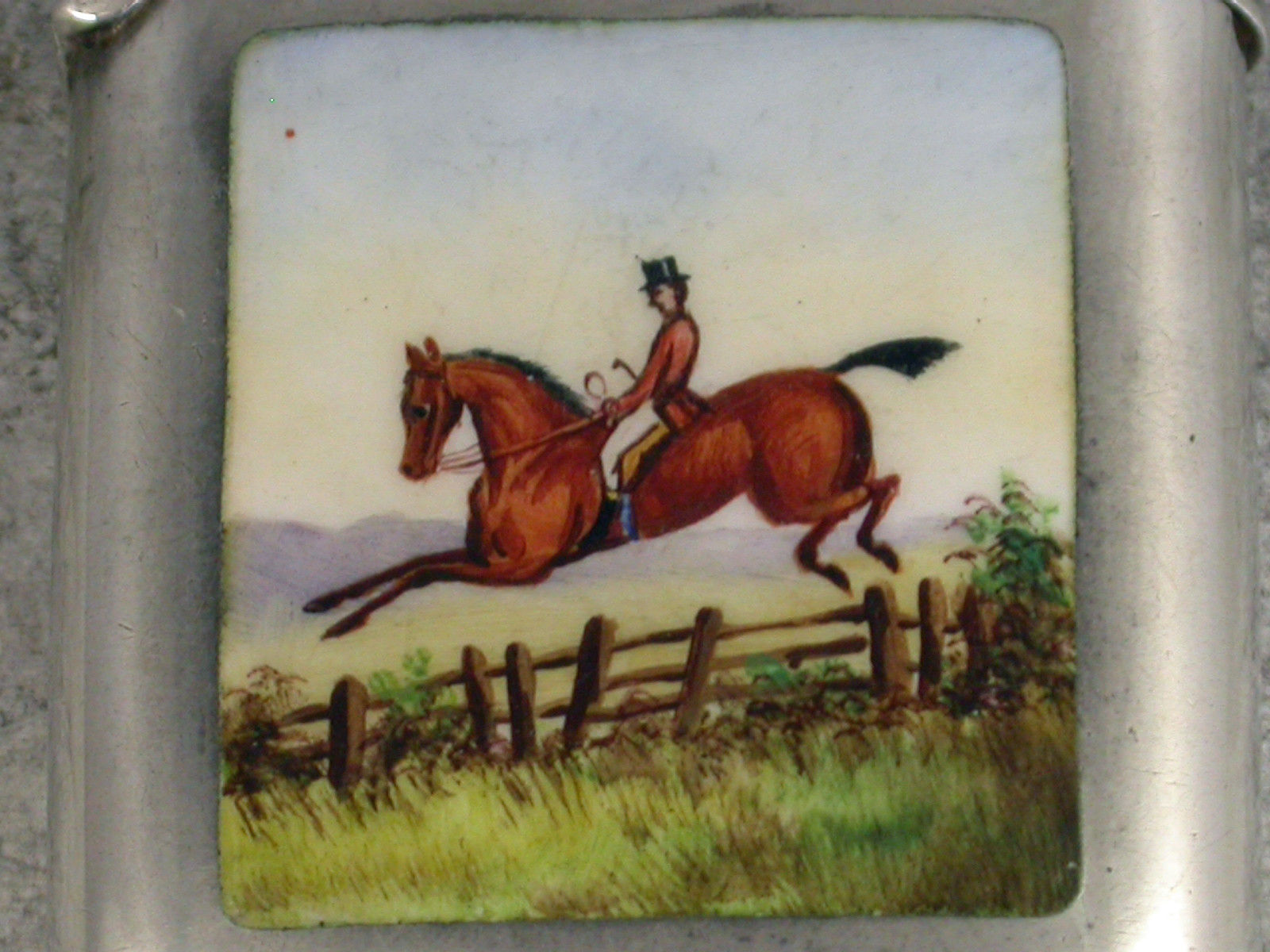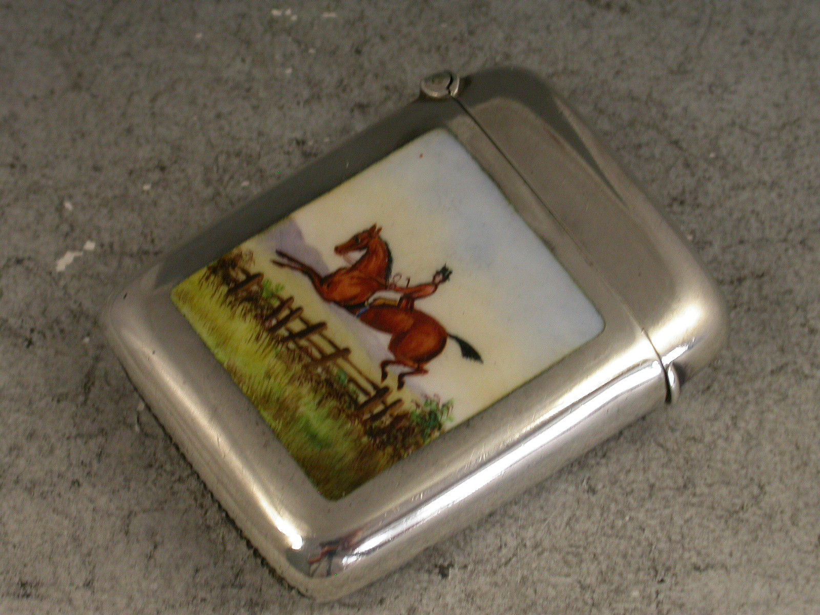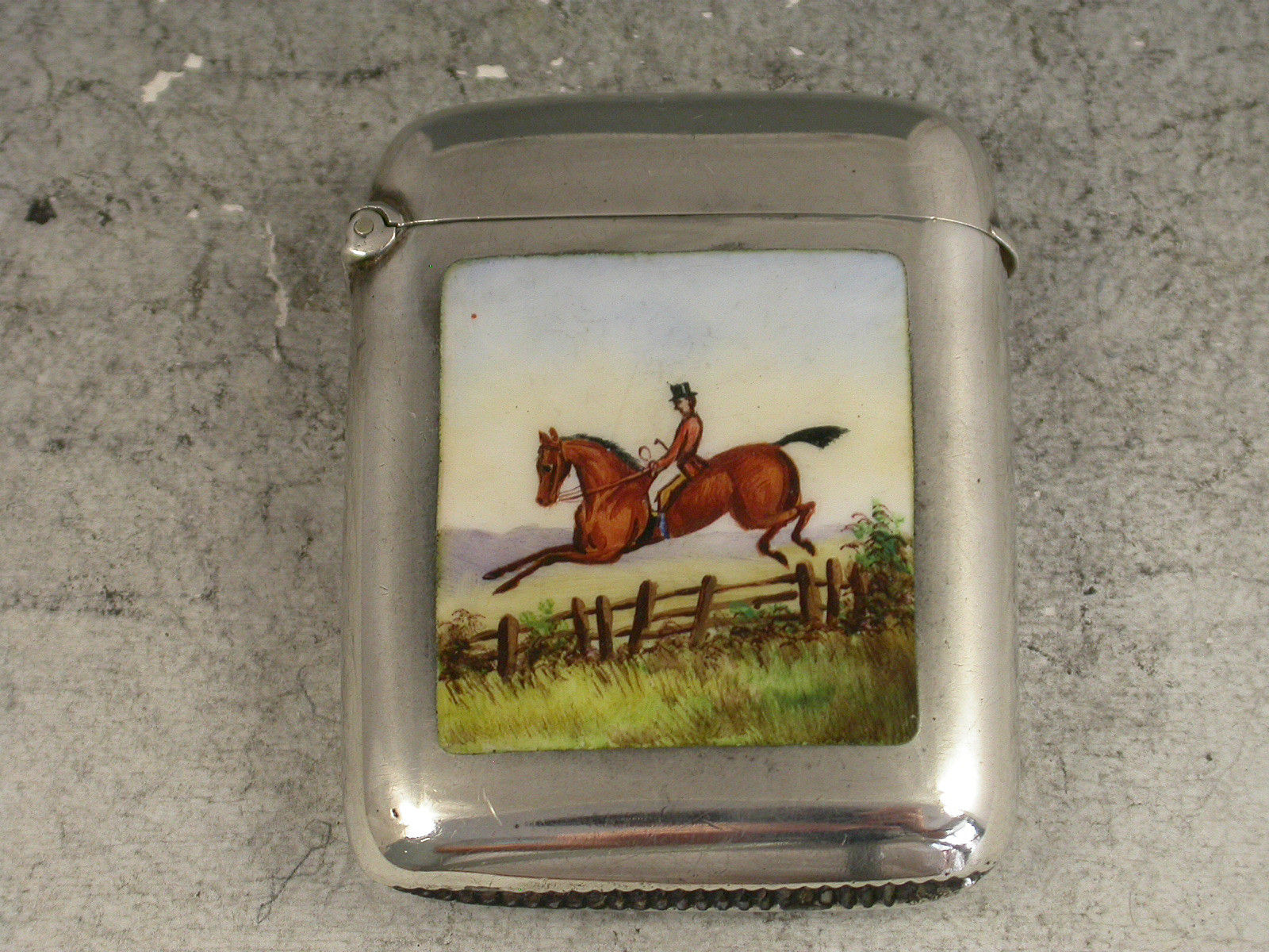 A good Victorian silver Vesta Case of rounded rectangular form with hinged flip-top lid, the face enamelled with a scene of a huntsman on horseback wearing a pink coat and black top hat, jumping a wooden fence.